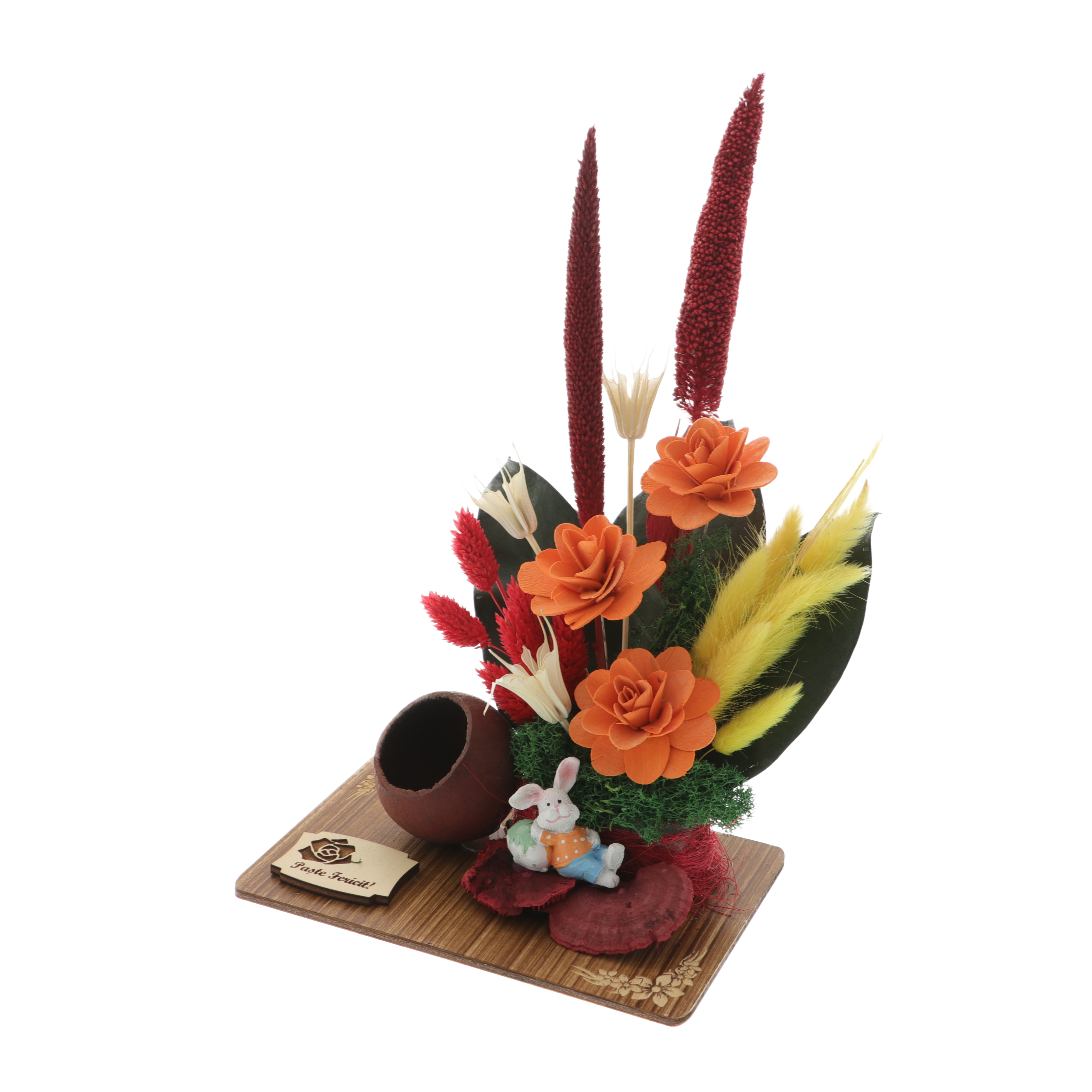 🌿 Materiale naturale – Plante și flori naturale, uscate și vopsite în tonuri calde de portocaliu, roșu, galben și verde, oferind un aspect rustic și elegant.