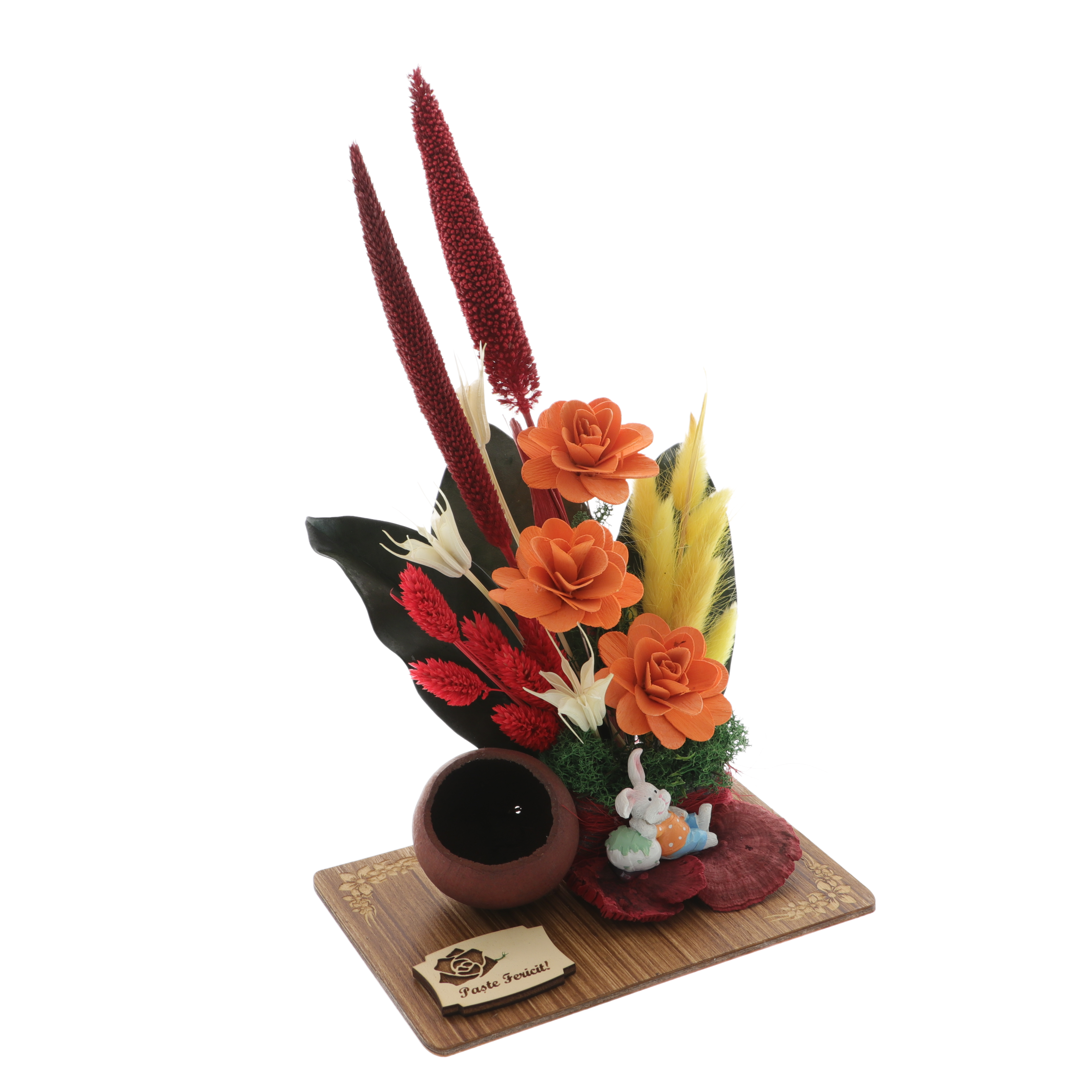 🐰 Iepuraș ceramic – Așezat la baza aranjamentului, acest element decorativ adaugă un farmec aparte și completează perfect tematica pascală.