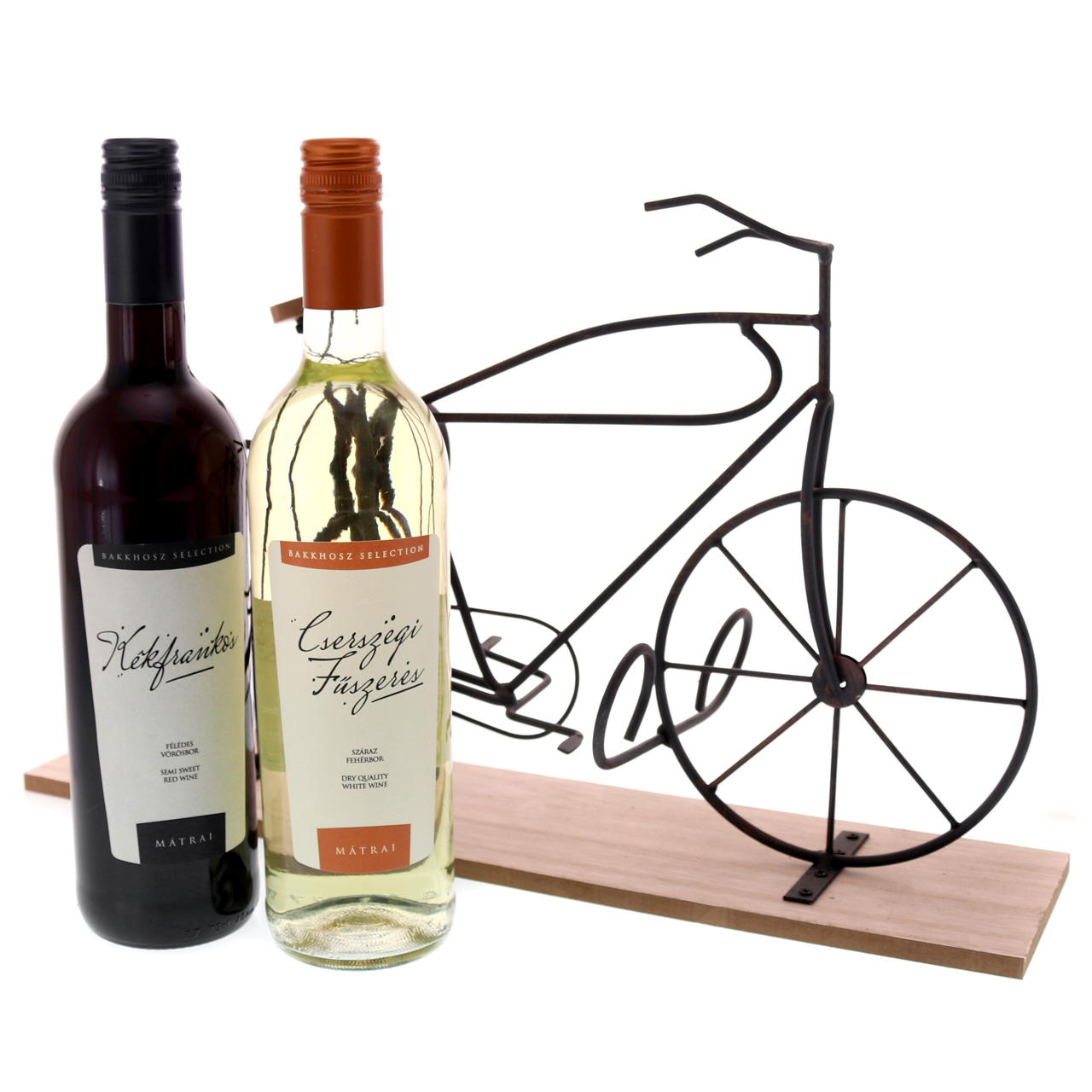 Bicicleta suport pentru 2 sticle, alaturi de sticle de vin alb si vin rosu. Suportul in forma de bicicleta este realizat din lemn si metal. Suportul este insotit de 2 sticle de vin de 750 ml, un Kekfrankos rosu, demidulce, de origine controlata din podgoriile Matrai si un vin alb, sec, din zona viticola Cserszeg, Ungaria. Suportul are o lungime de cca 47 cm si o inaltime de 27 cm. Baza suportului poate fi personalizat prin aplicarea unei placute gravate cu mesajul dorit.