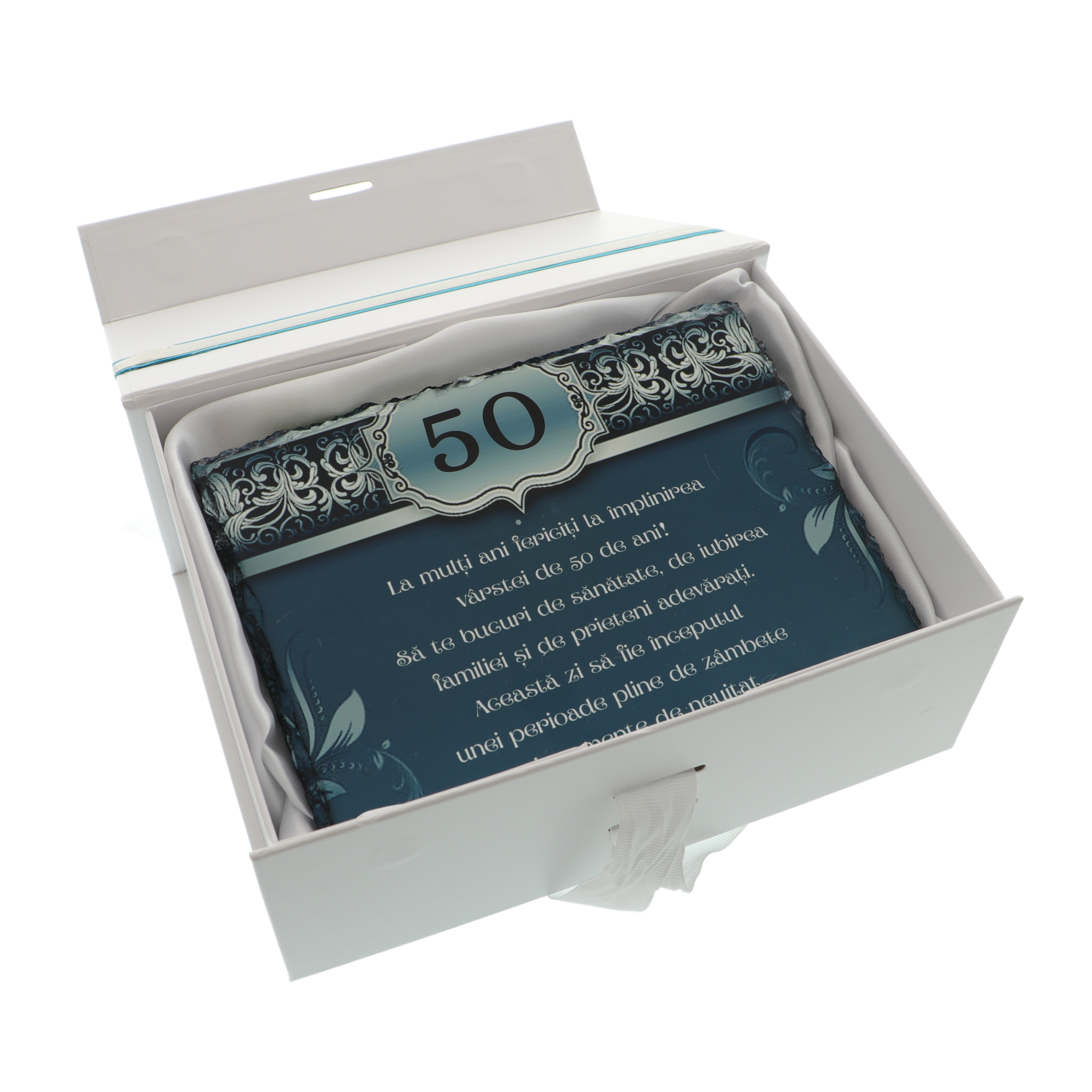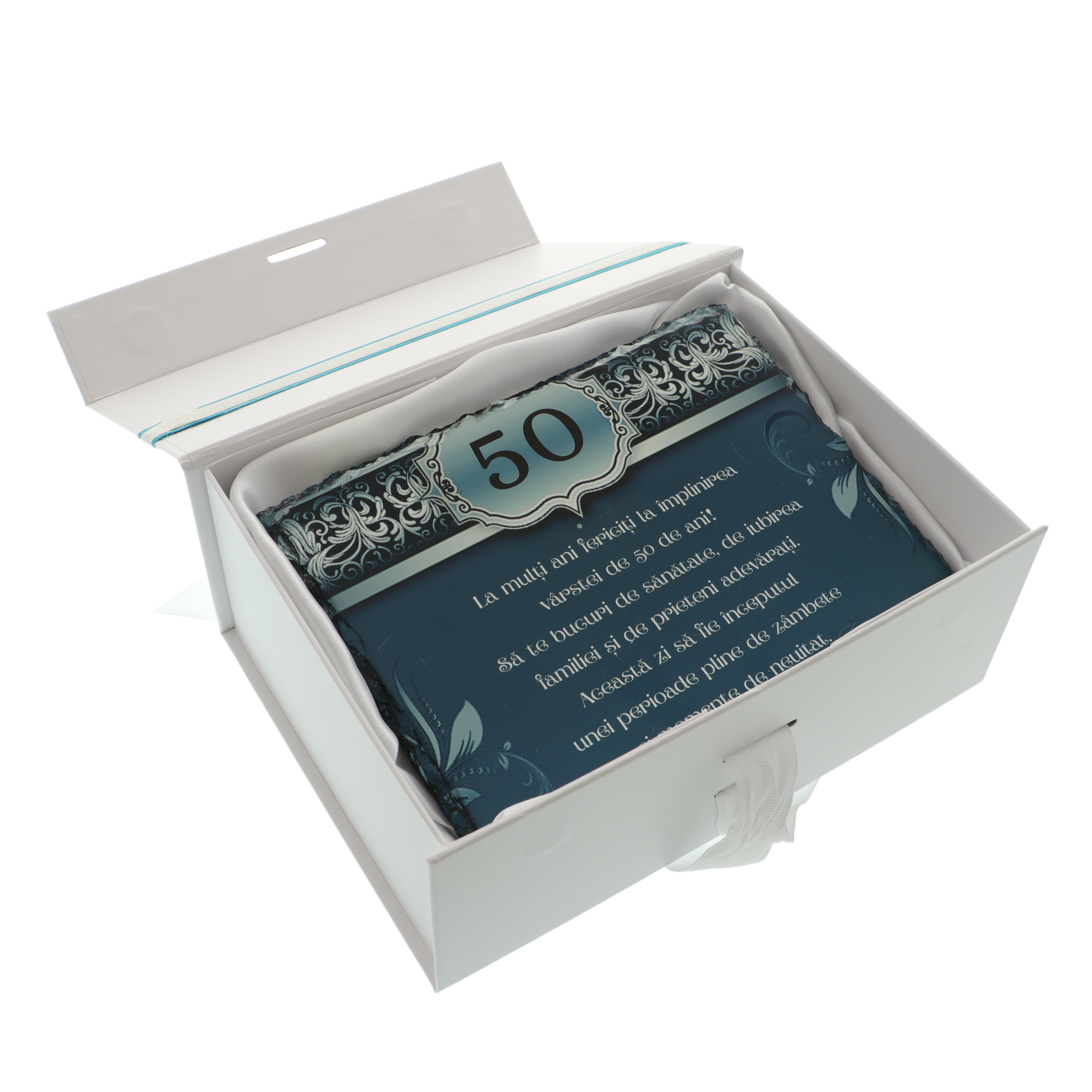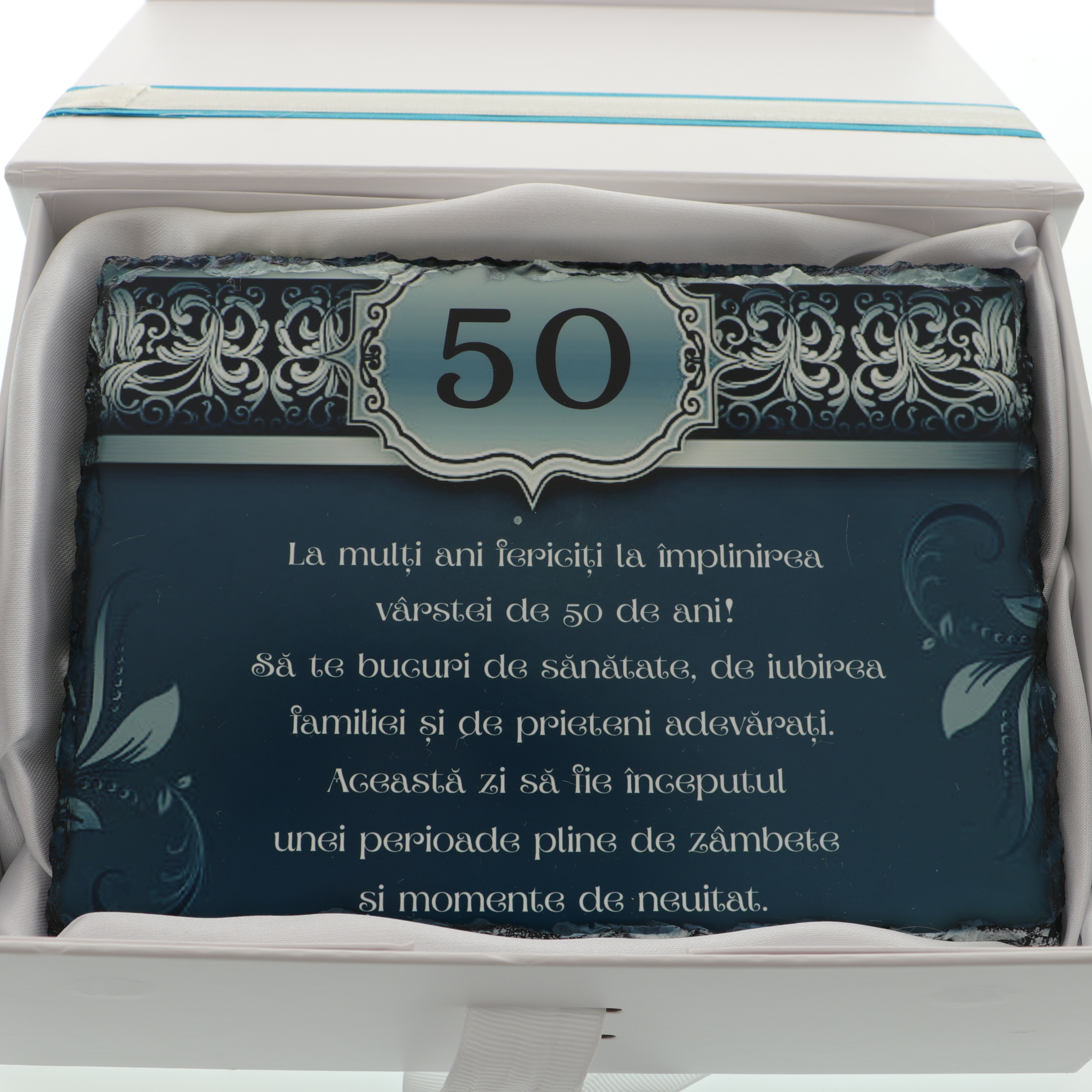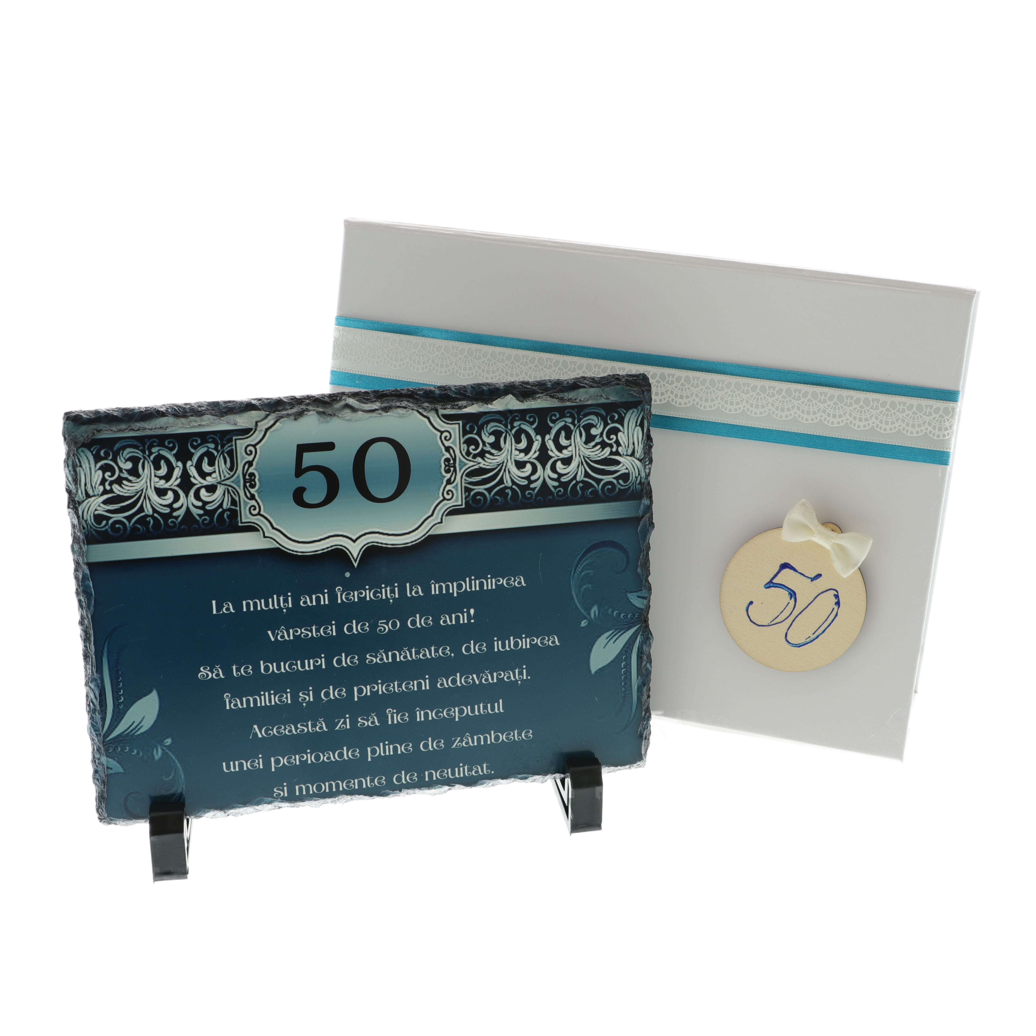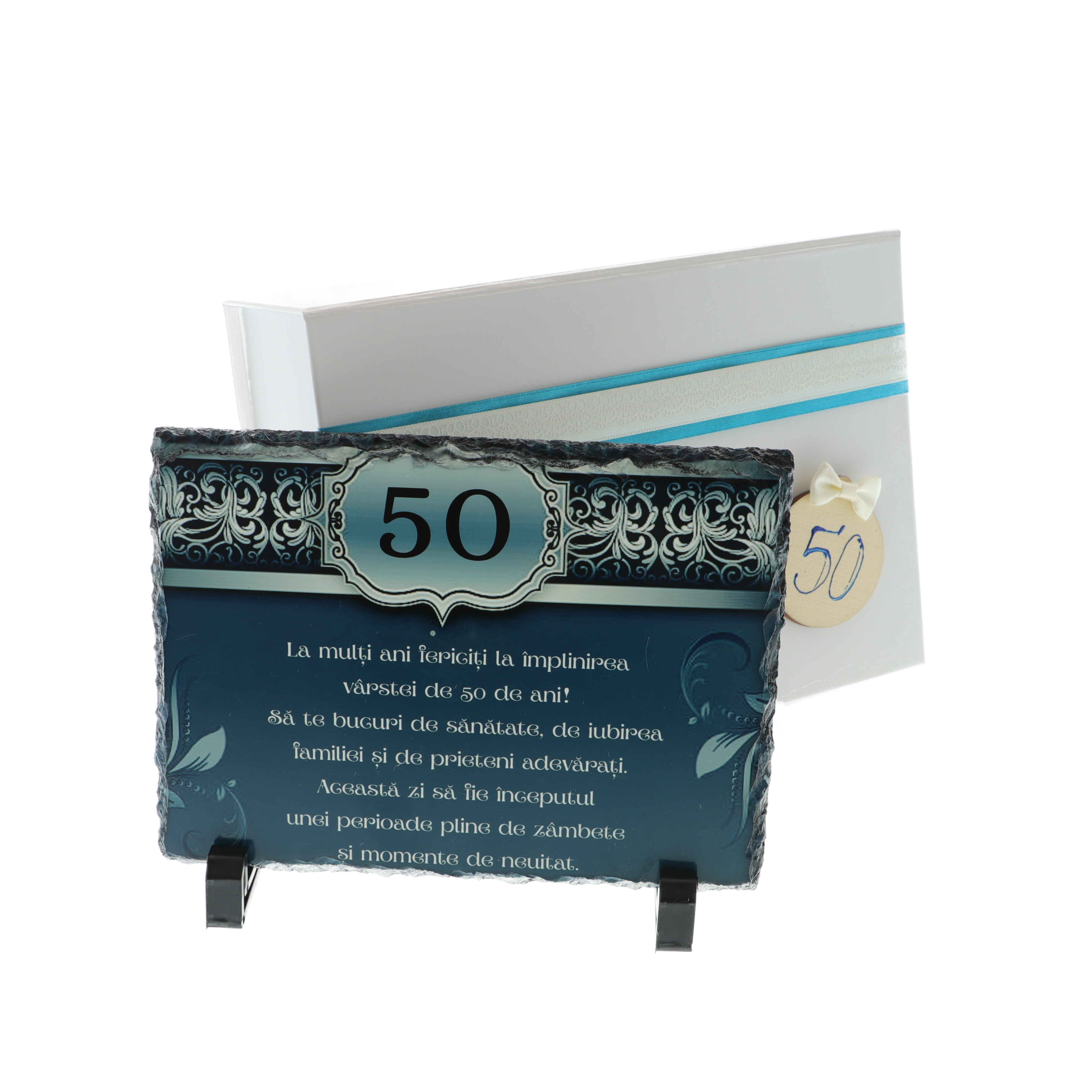 Oferă un cadou memorabil la aniversarea vârstei de 50 de ani cu această plachetă elegantă realizată din piatră naturală. Designul unic în nuanțe de albastru turcoaz și mesajul personalizat transformă acest dar într-o amintire de suflet.