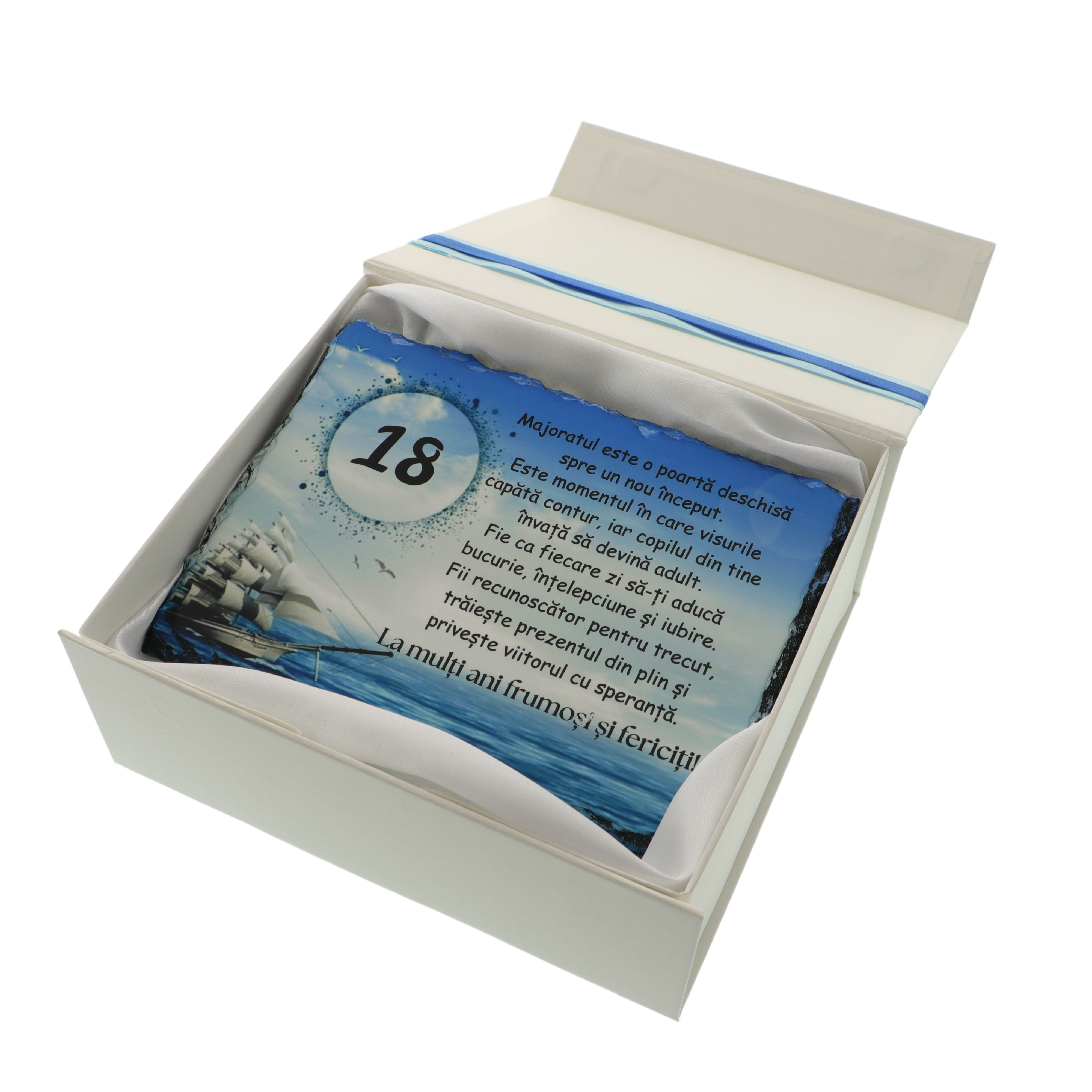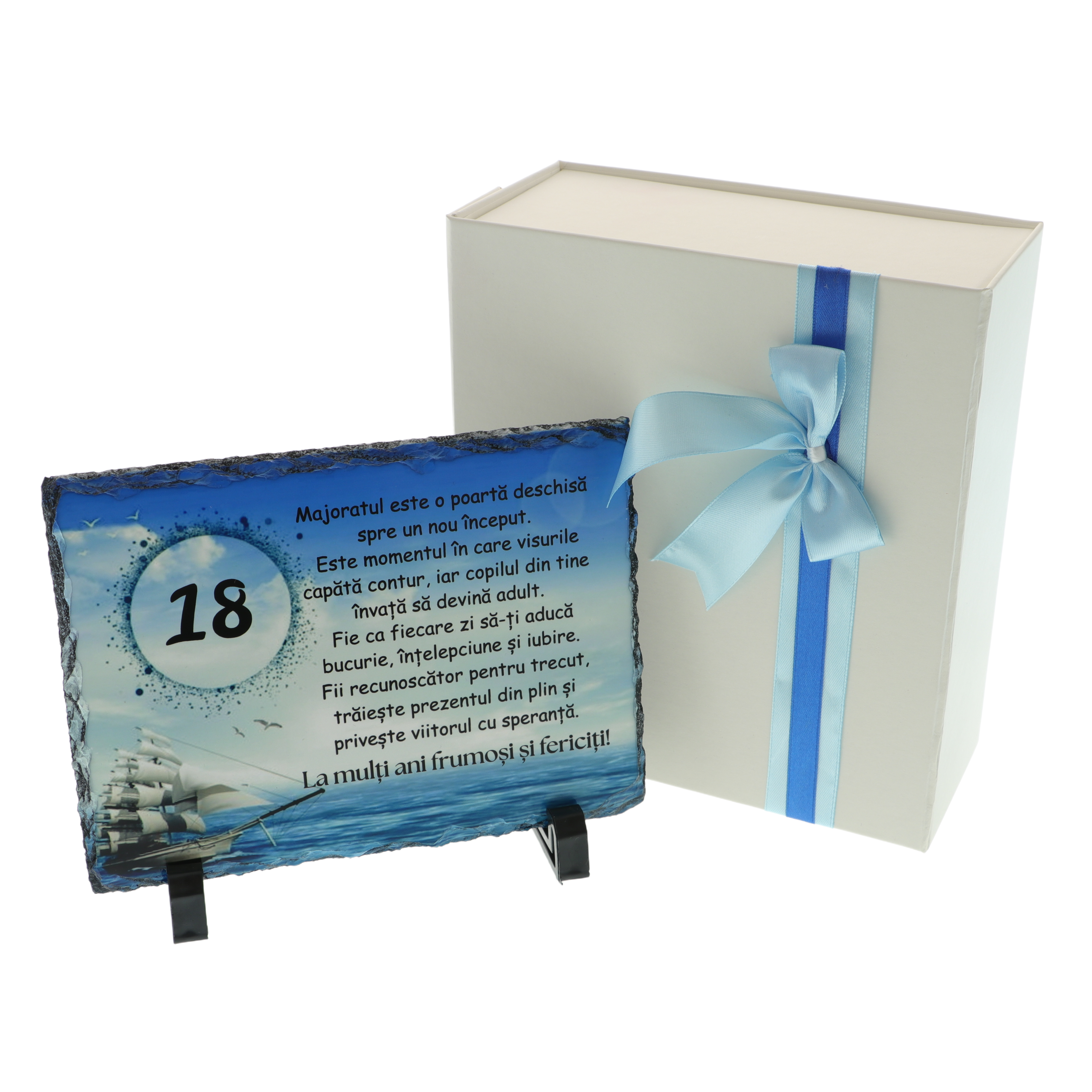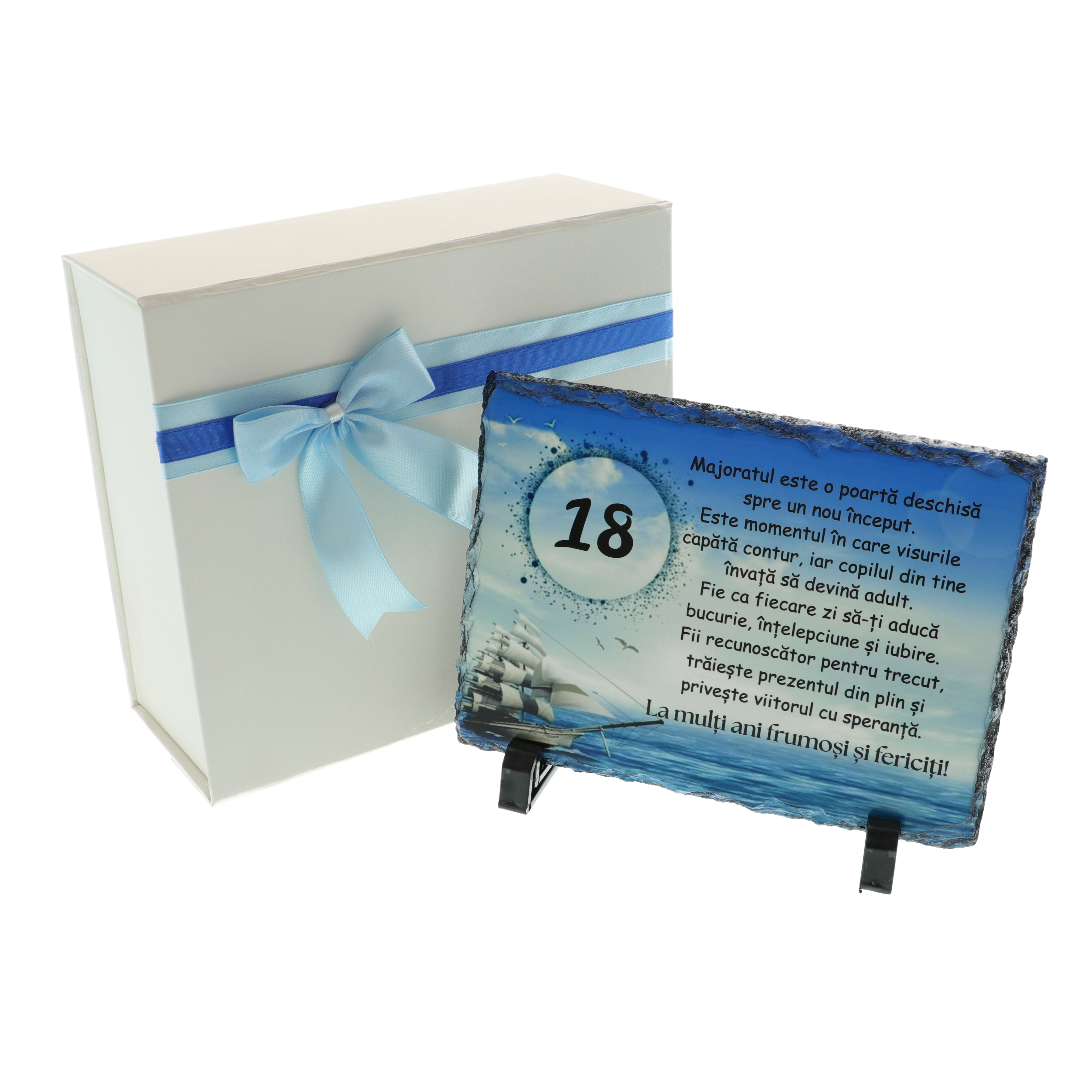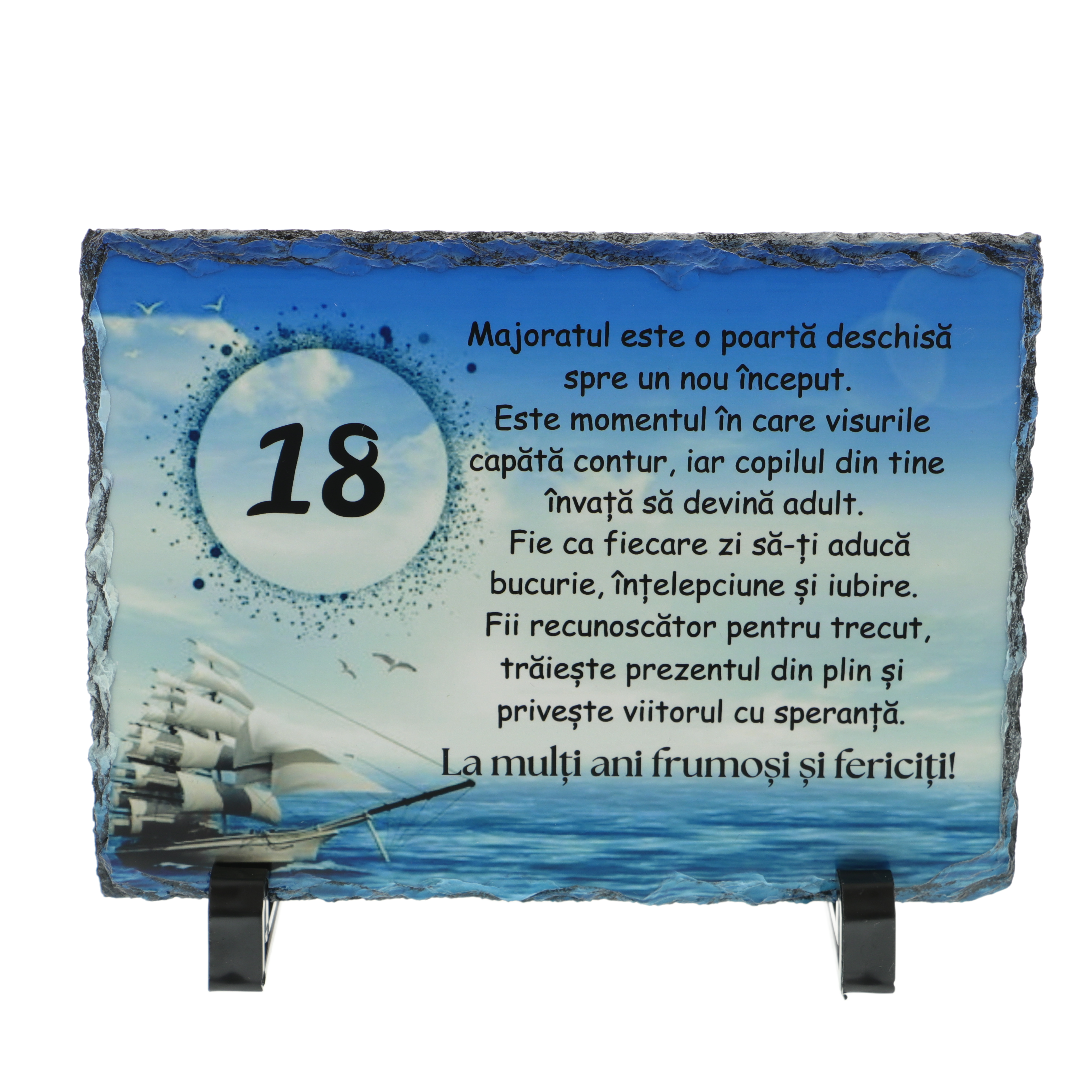 Sărbătorește majoratul unui băiat cu un cadou personalizat unic și plin de emoție – o plachetă din piatră ardezie naturală, gravată cu un mesaj inspirațional și de felicitare pentru această etapă importantă a vieții. Este cadoul perfect pentru a marca 18 ani, un moment special de tranziție de la copilărie la maturitate.