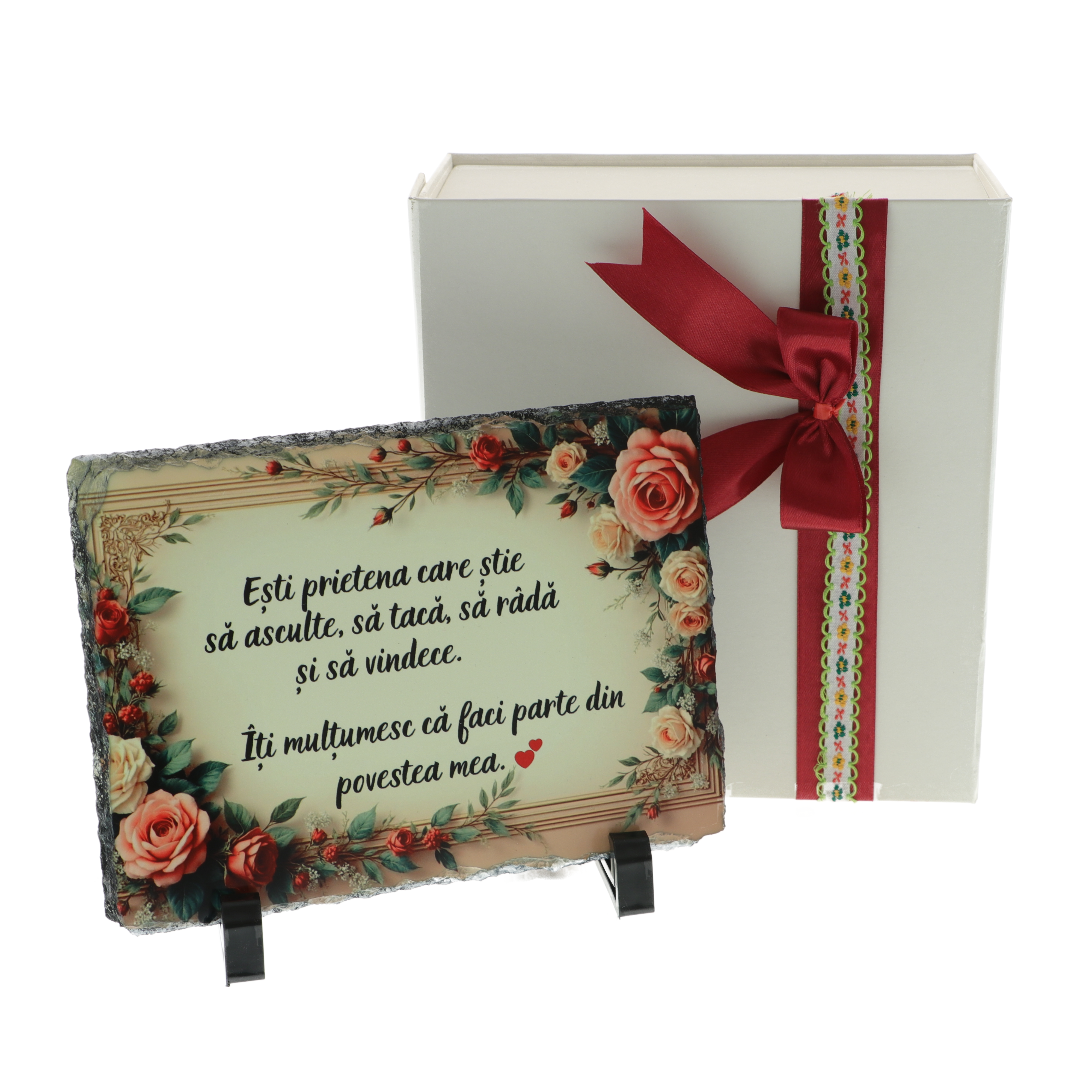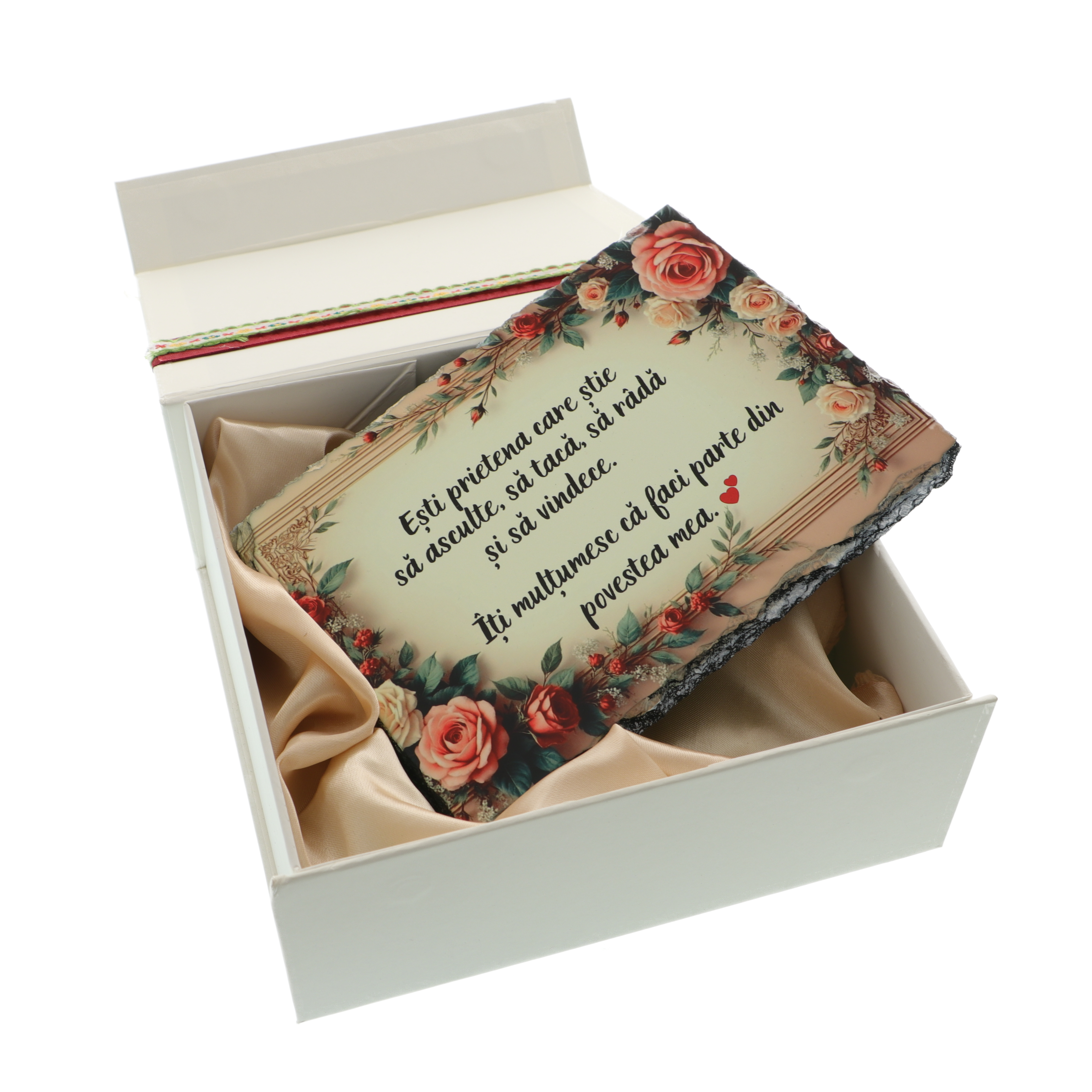 Placa este așezată într-o cutie elegantă de cadou, căptușită cu satin la interior și decorată la exterior cu panglică și fundiță rafinată, fiind gata de oferit. Datorită aspectului natural al ardeziei și personalizării prin imprimare, acest cadou îmbină emoția cu eleganța și durabilitatea.