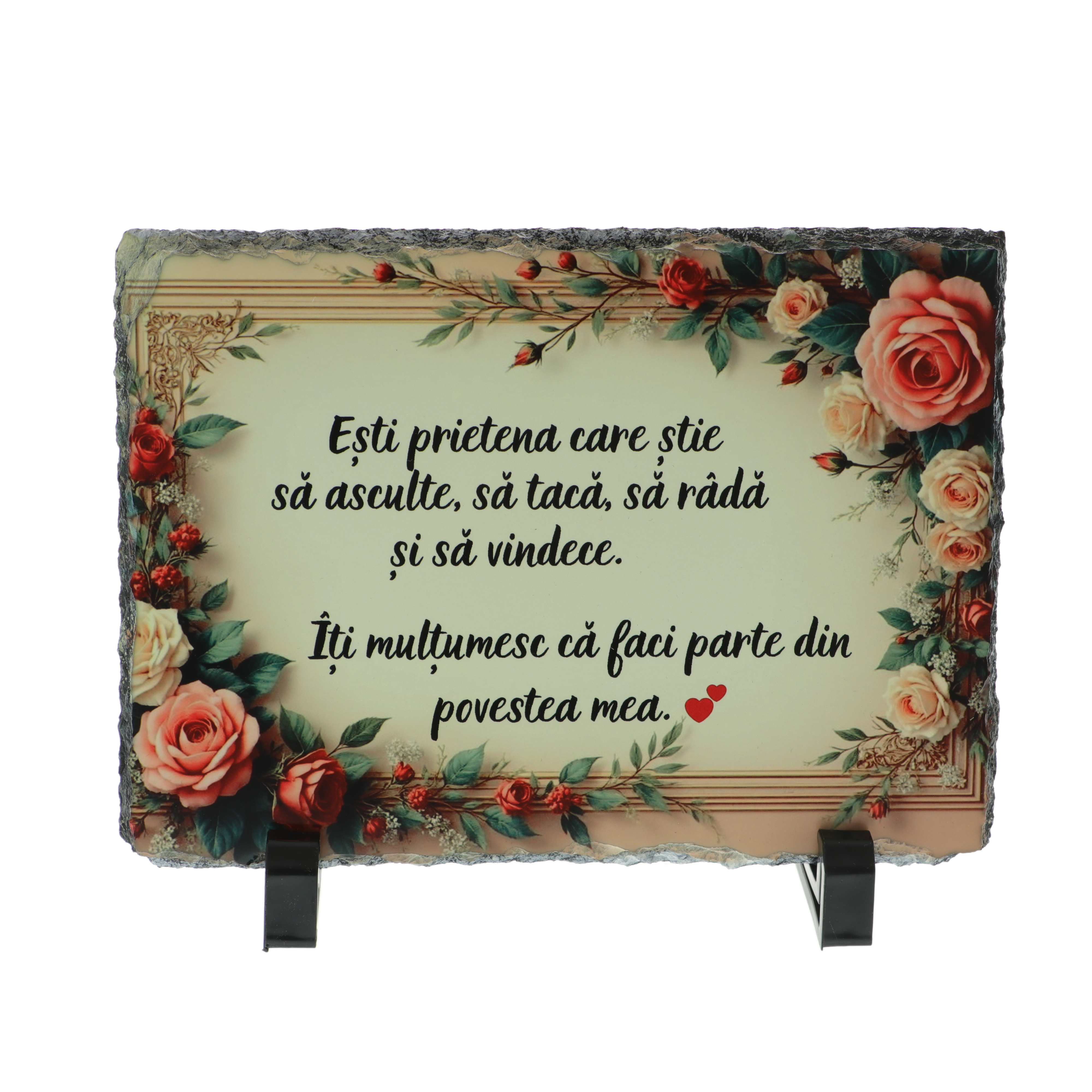 Acest cadou personalizat pentru prietenă, realizat pe piatră naturală de ardezie, este o modalitate specială de a exprima recunoștința, prietenia și emoția printr-un obiect decorativ unic. Placa de ardezie, cu dimensiunea de 14 x 19 cm, este decorată cu un design floral multicolor, delicat și elegant, care încadrează armonios mesajul emoționant plasat în centru.
