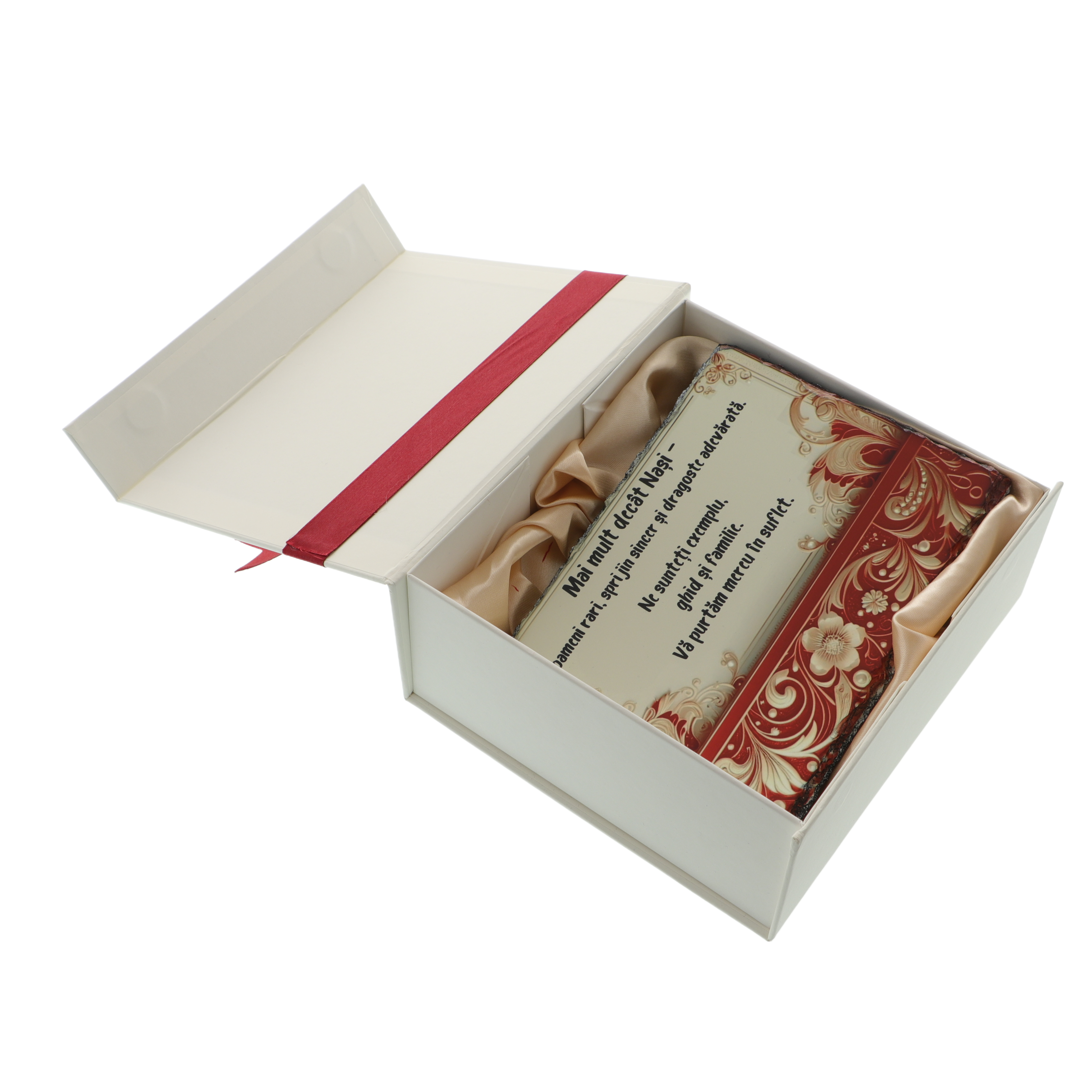 Produsul este livrat într-o cutie elegantă de cadouri, căptușită cu satin la interior, iar la exterior decorată cu bandă și fundiță din satin, fiind gata de oferit la evenimente speciale.