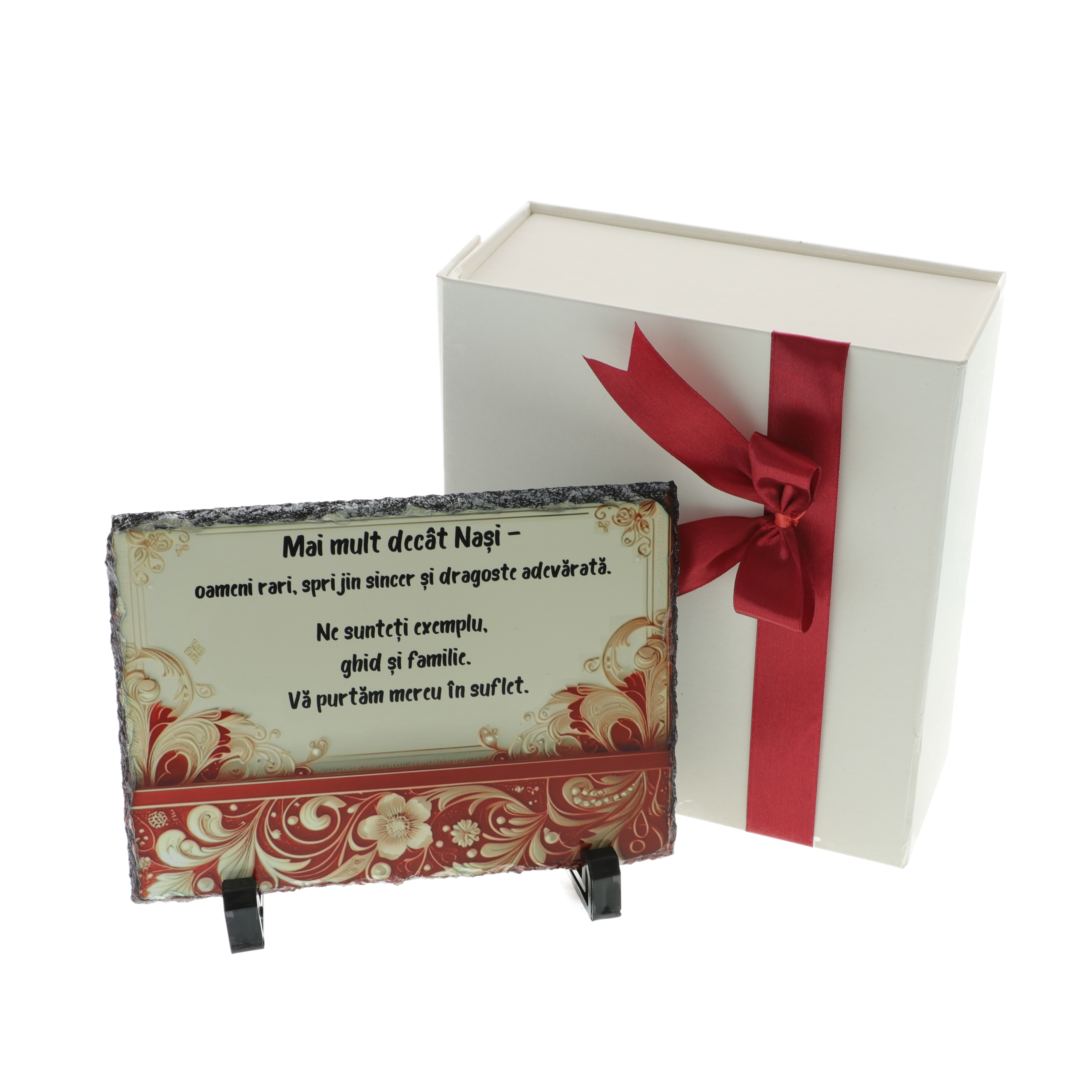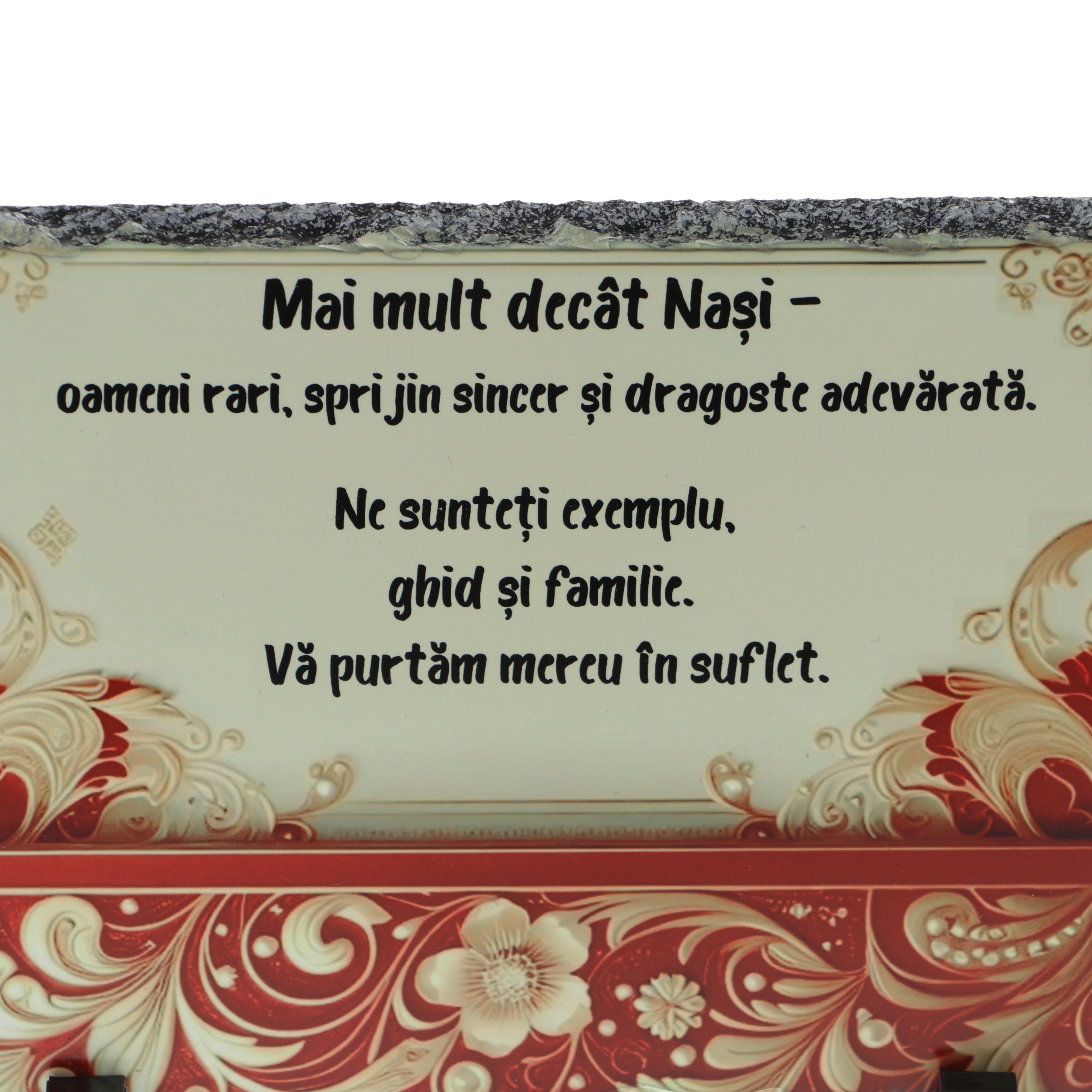 Acest cadou personalizat pentru nași este o alegere elegantă și plină de semnificație, ideală pentru a vă exprima recunoștința față de nașii de nuntă sau botez. Placa este realizată din piatră naturală de ardezie, în nuanțe rafinate de crem și vișiniu, cu un model floral delicat, ce oferă un aspect cald și elegant.