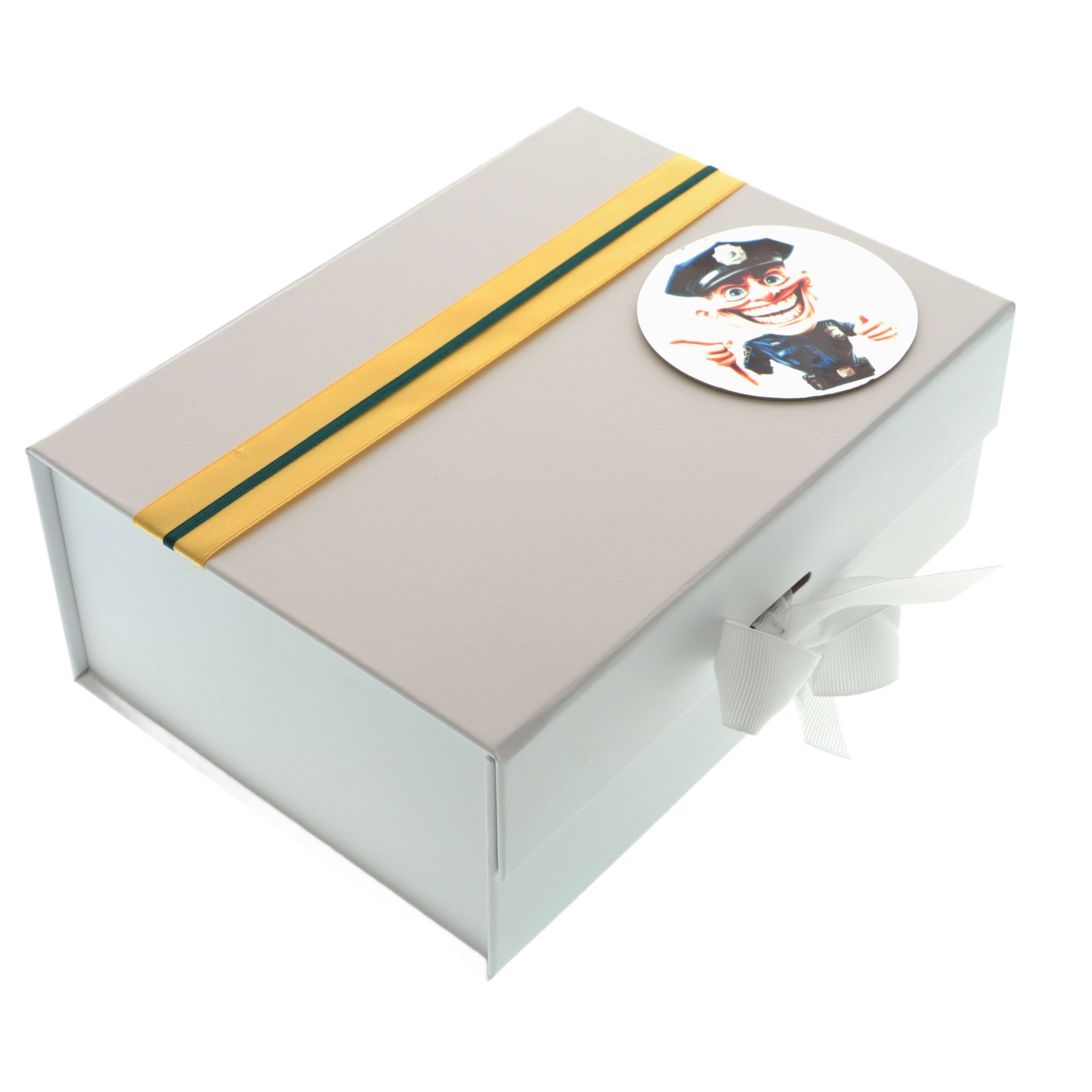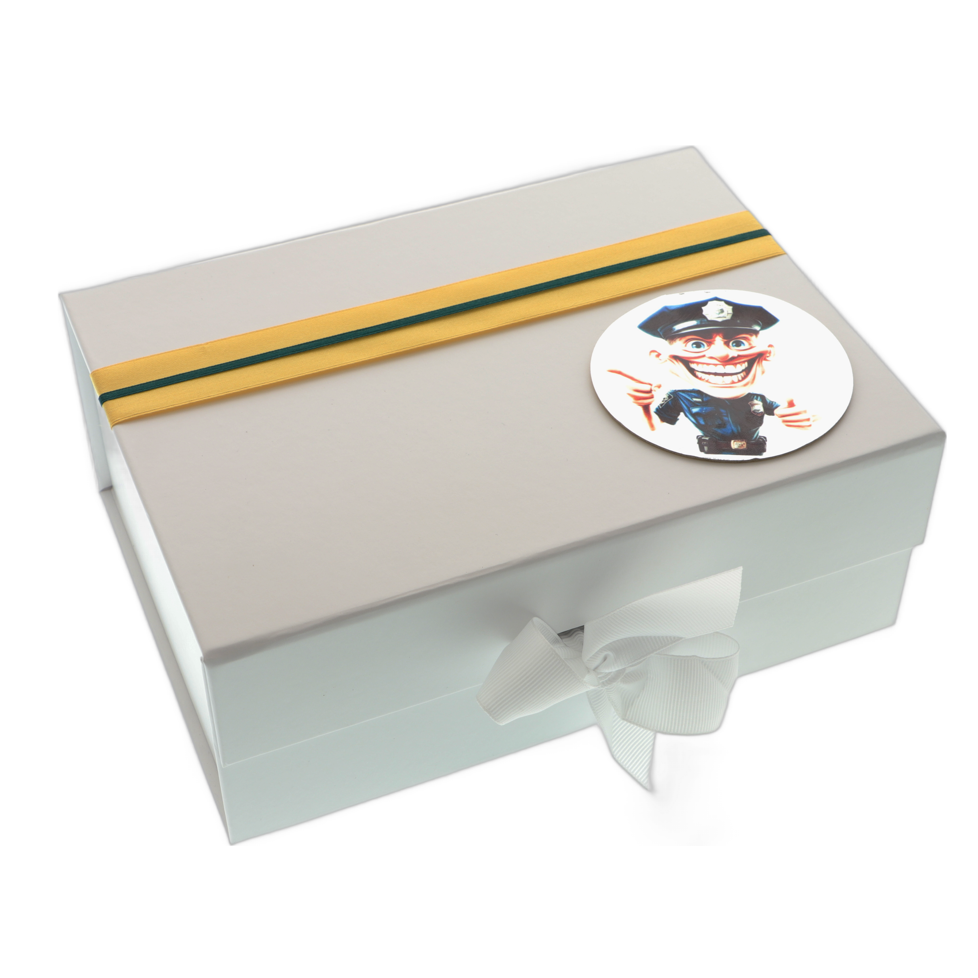 Placheta vine așezată într-o cutie elegantă de cadou, cu interior satinat și panglică de satin asortată, perfectă pentru oferit cadou fără a mai fi nevoie de ambalare suplimentară. Capacul cutiei este decorat cu un disc ilustrat cu același polițist haios care apare și pe plachetă, creând un set armonios și bine finisat.