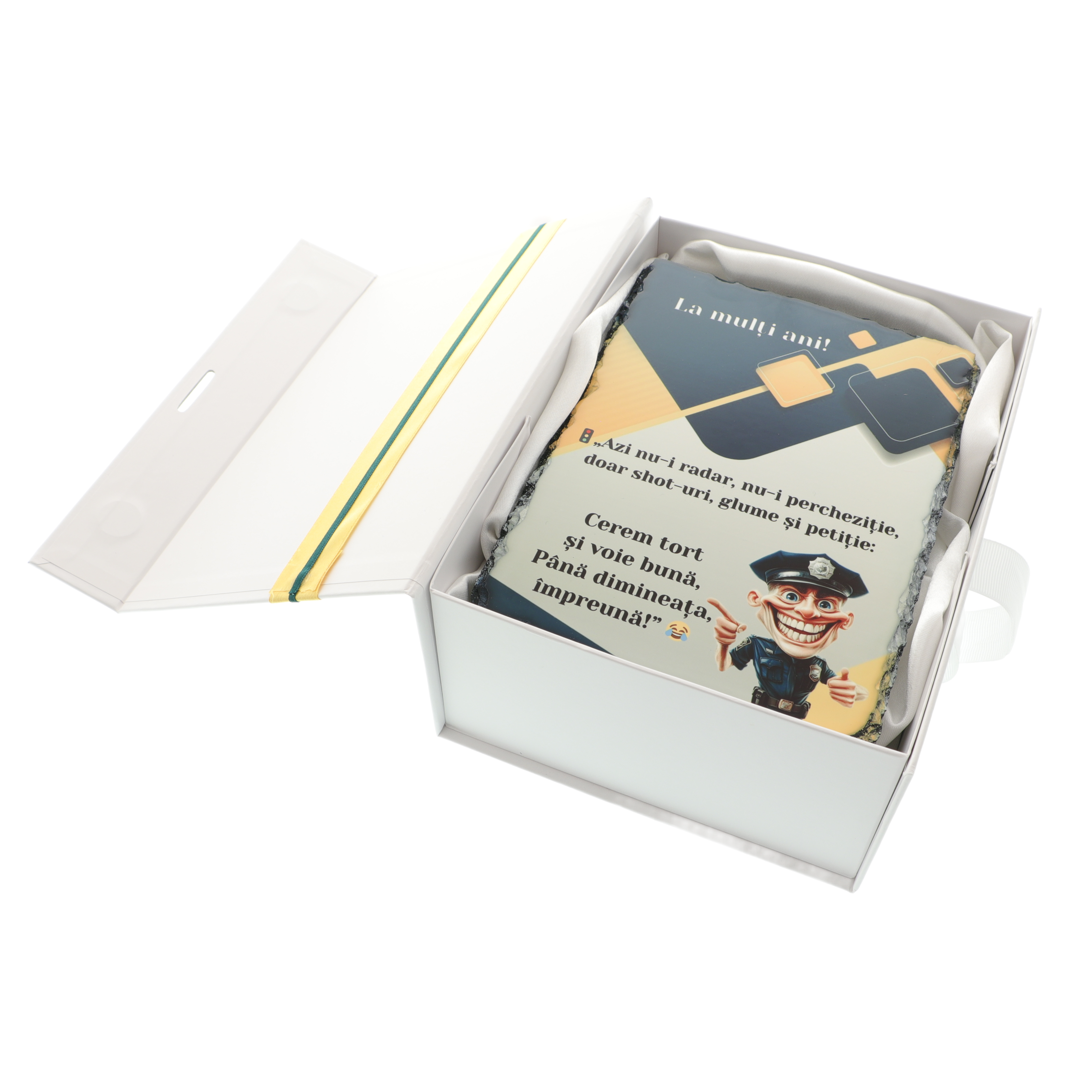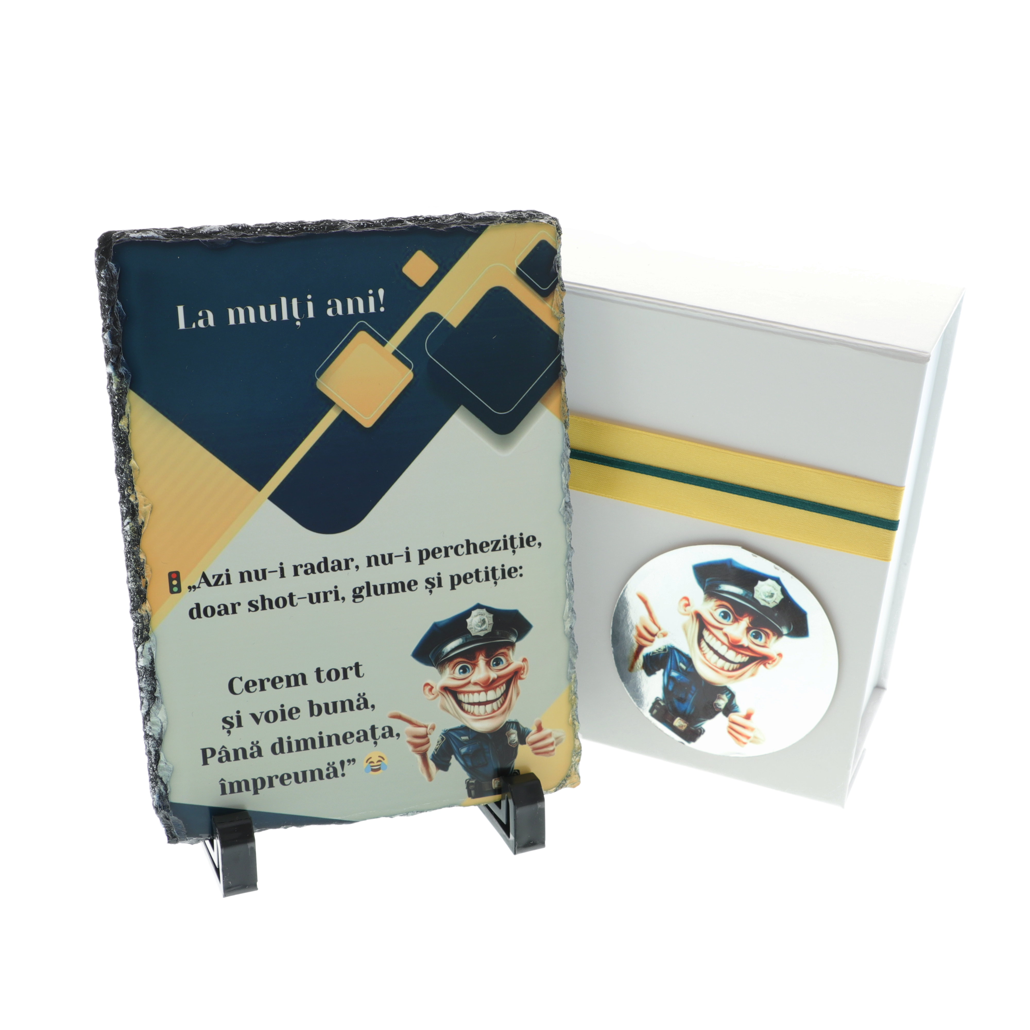 Cadou polițist haios personalizat pe piatră naturală – plachetă de ardezie cu mesaj amuzant și cutie elegantă