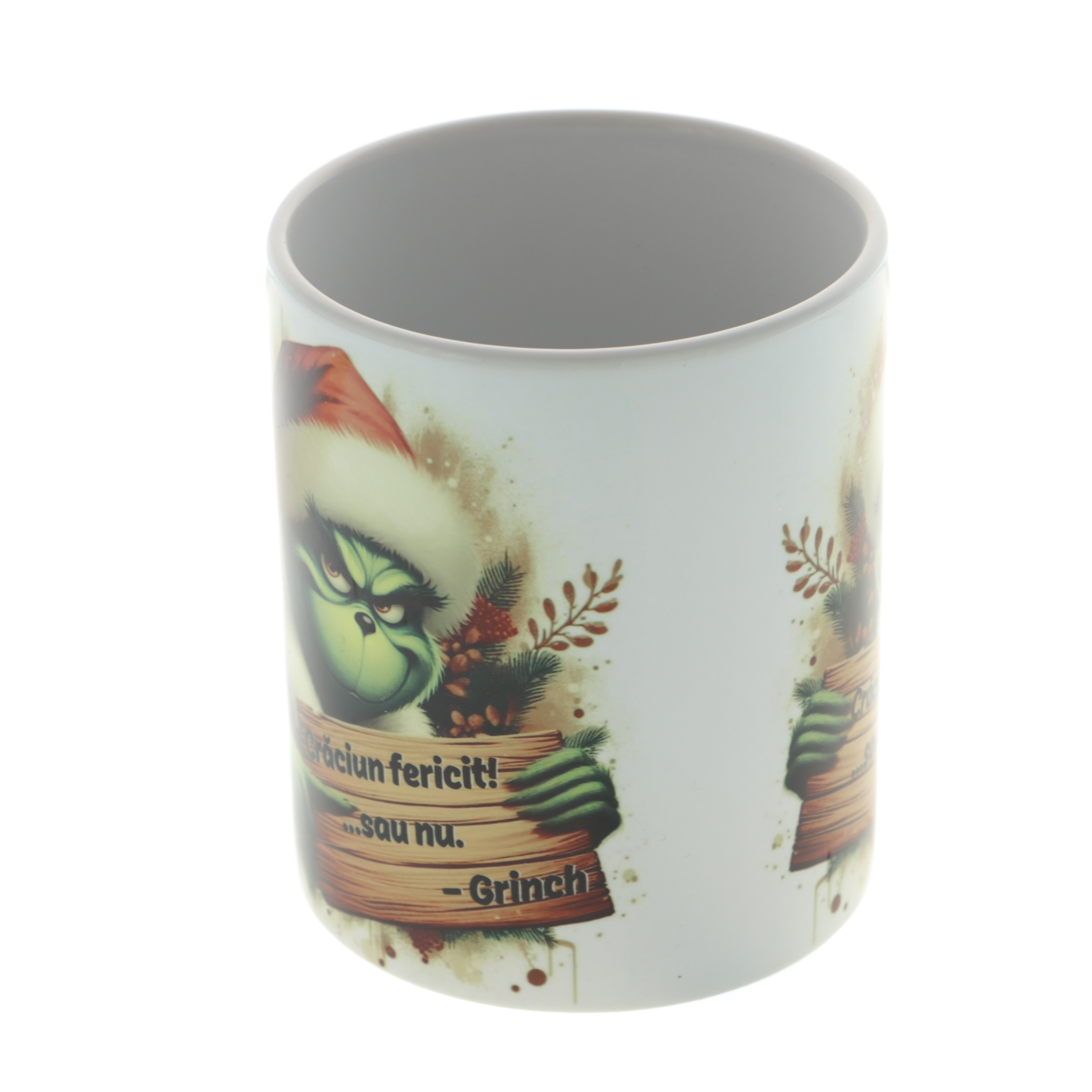 Cana Grinch „Crăciun Fericit… sau nu” este cadoul perfect pentru cei care iubesc sărbătorile… cu un strop de umor verde și sarcastic. Realizată din ceramică de înaltă calitate, cana are o capacitate de 350 ml și este decorată cu un Grinch simpatic purtând șapcă de Moș Crăciun, ținând în mână o pancartă pe care scrie: