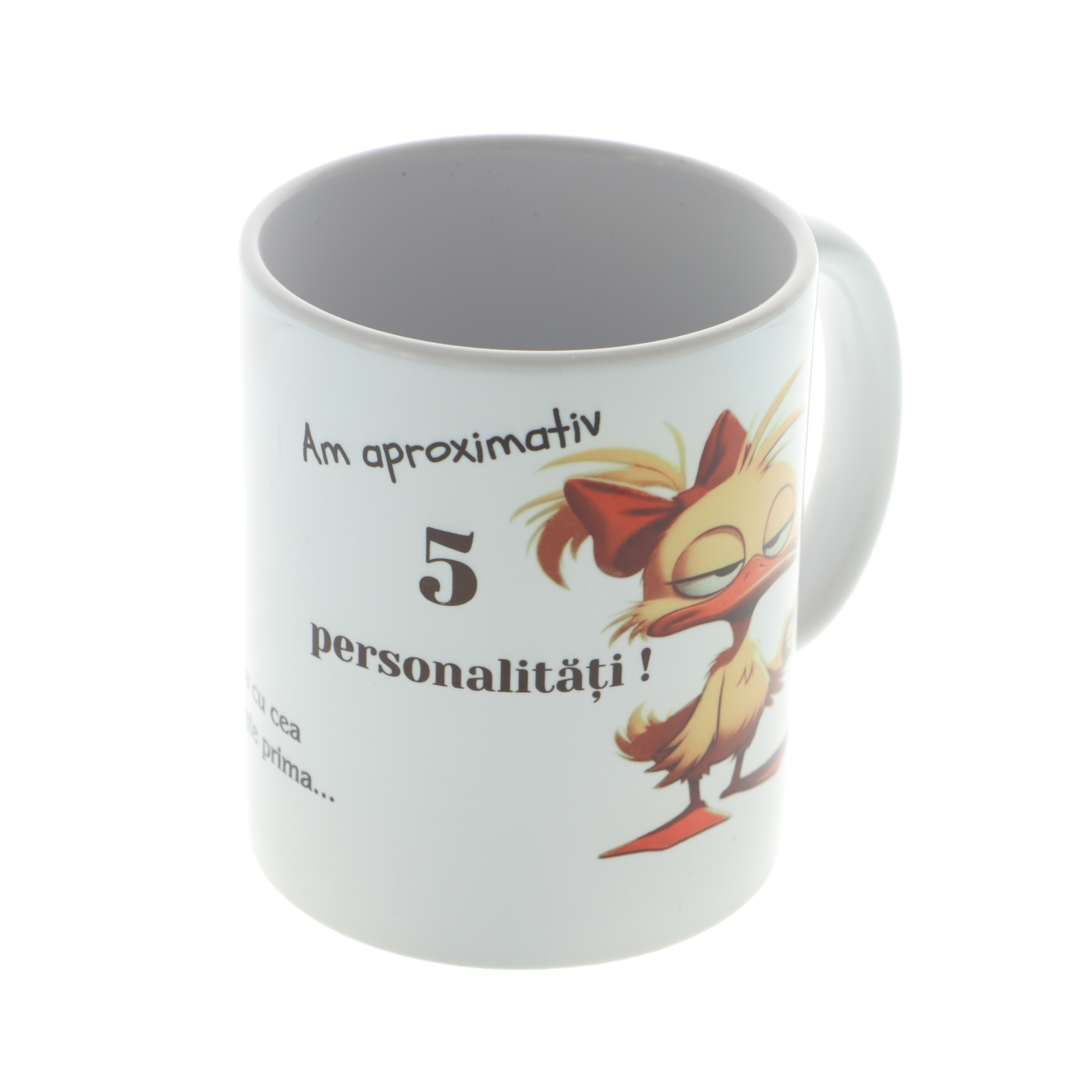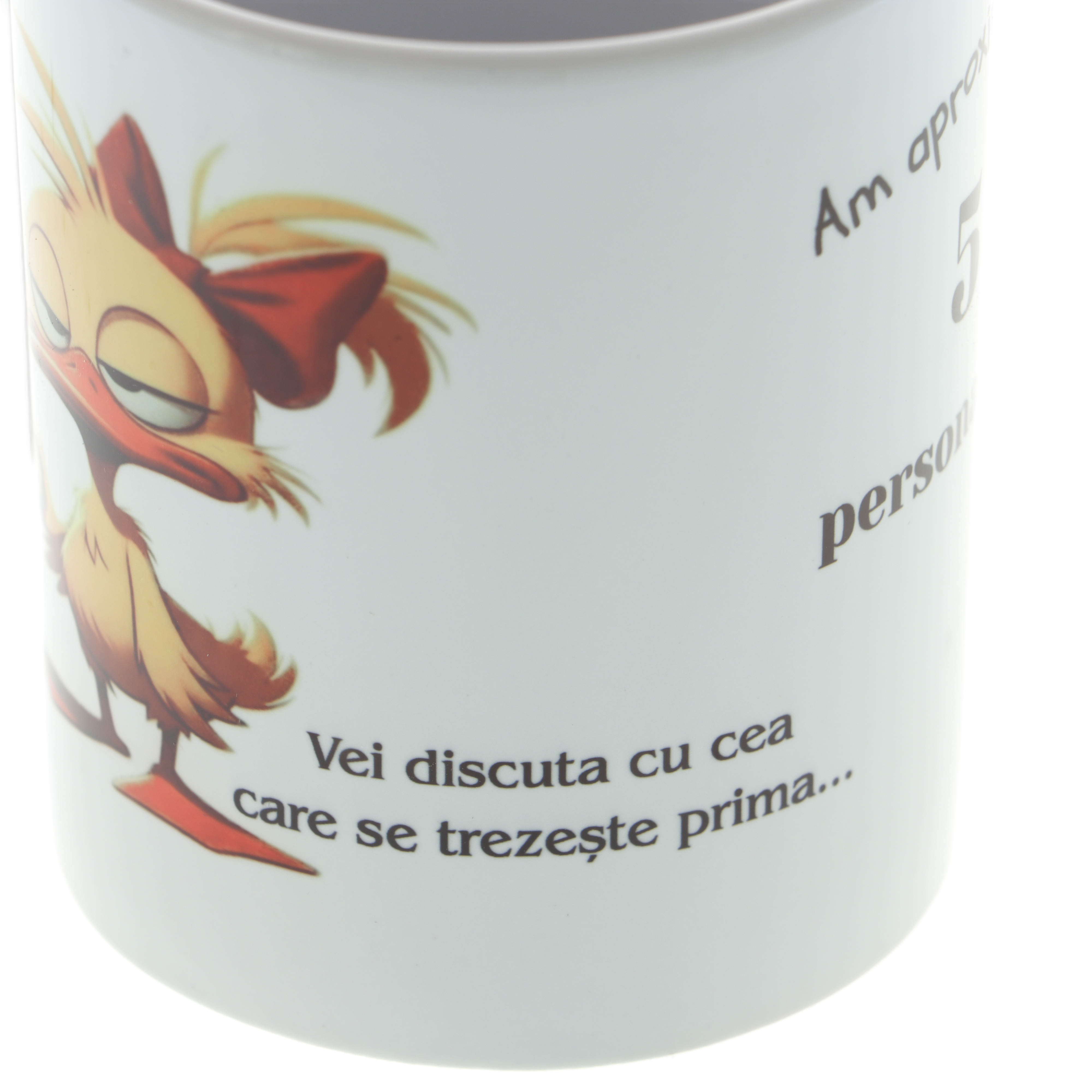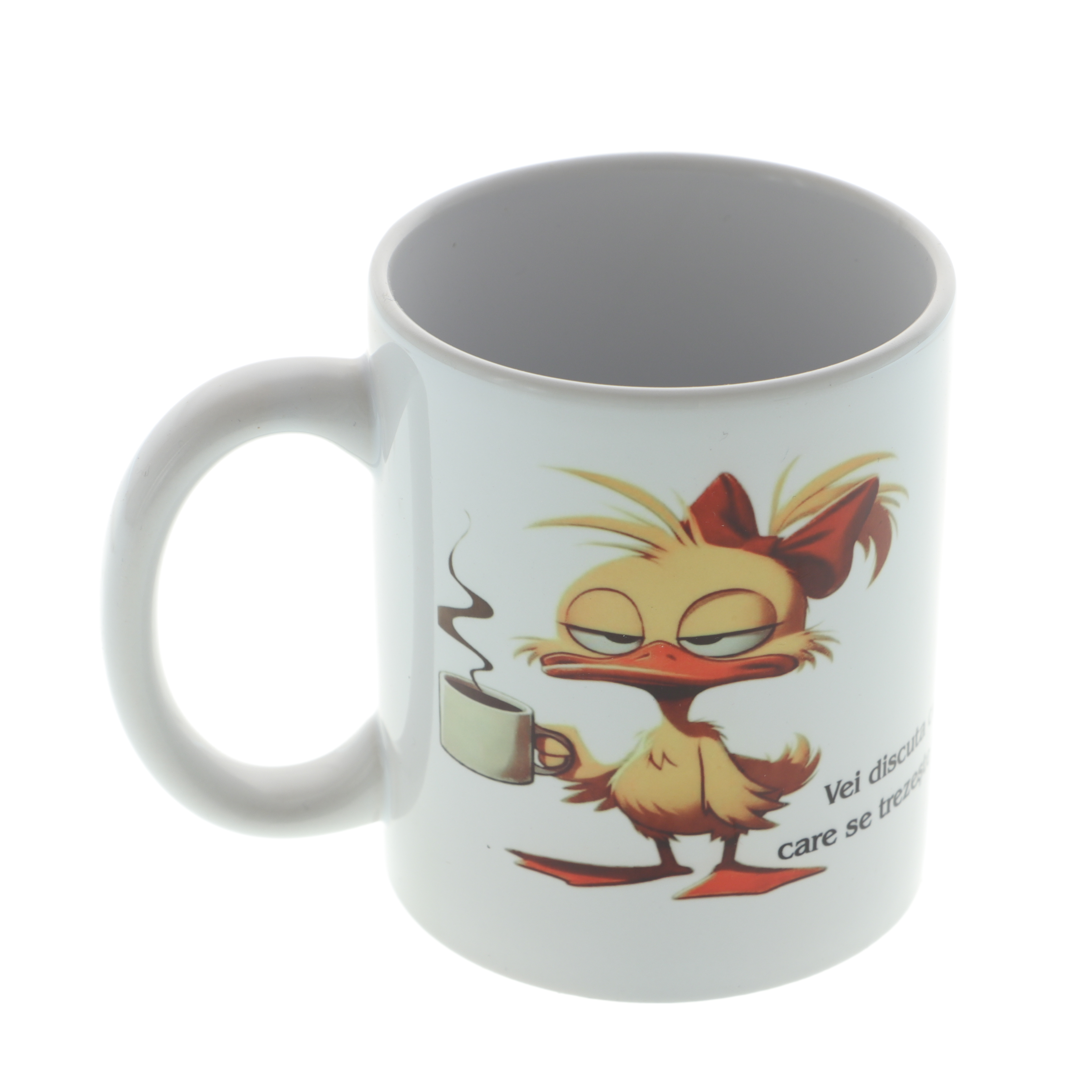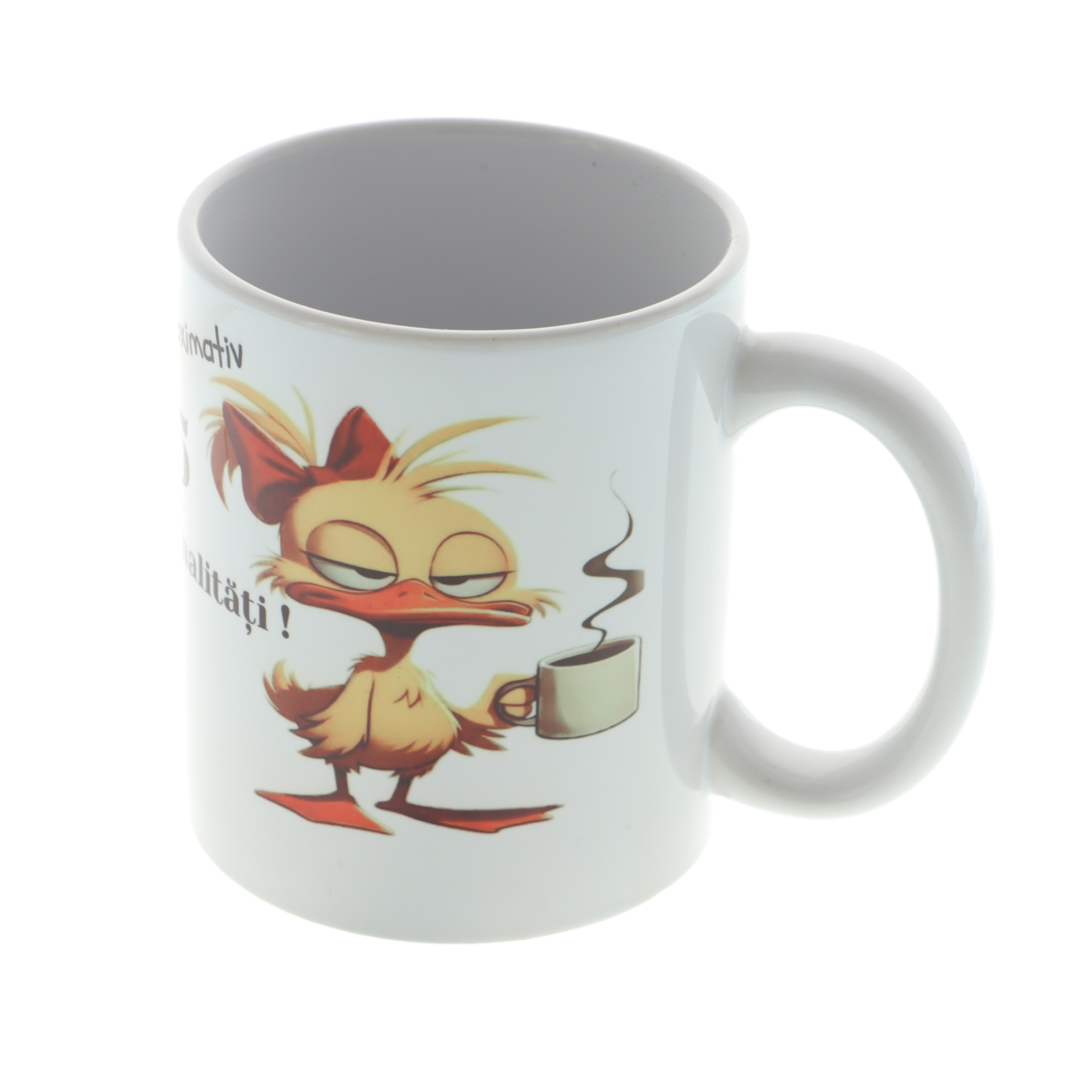 Începe-ți diminețile cu zâmbetul pe buze și mult umor! Această cană albă din ceramică, cu o capacitate de 350 ml, este perfectă pentru ceai sau cafea. Cana este personalizată cu imaginea unei rățuște morocănoase, ținând o cană de cafea în mână, completată de mesajul haios standard: