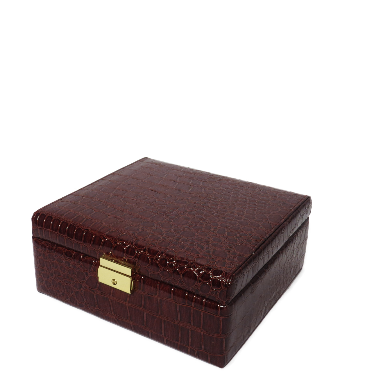 Casetă 8 Ceasuri, cutie pentru depozitarea a 8 ceasuri de mână. Exteriorul casetei de ceasuri este din piele artificială lucioasă stil piele crocodil, iar interiorul din catifea crem. Cele 8 ceasuri pot fi aşezate pe două rânduri, prinse pe nişte periniţe din catifea. Acest cadou este disponibil în două culori, negru şi maro.