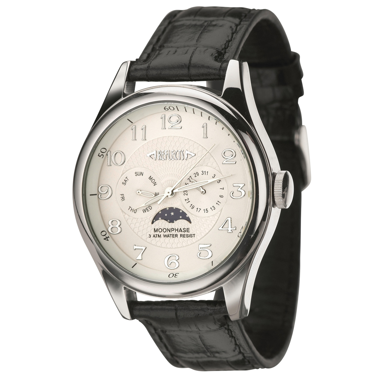 Ceas elegant de mana pentru barbati, cu optiune de Moonphase, care arata fazele lunii. Carcasa este realizata din otel inoxidabil si poate fi reglata pentru a arata data si ziua exacta a saptamanii. Cureaua este din piele cu model tip crocodil. Rezistent la apa 5ATM. Diametru carcasa: 45mm. Latime curea: 22mm. Greutate: 86g. Ceasul este asezat in cutie eleganta metalica, care poate fi personalizata cu o placuta gravata cu mesaj.