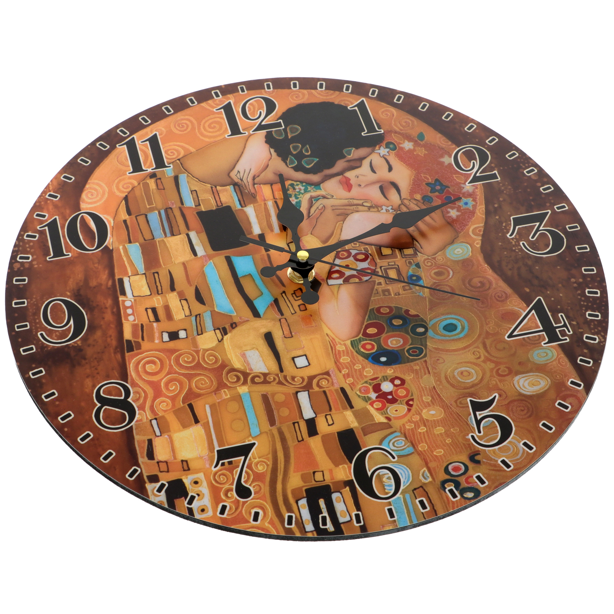 Ceasa de perete realizat din lemn, decorat cu reproducerea faimoasei picturi Sarutul realizat de Gustav Klimt. Mecanismul este de tip Quartz, secundarul avand o miscare continua. Din acest motiv ceasul este silentios. Diametrul este de 30 cm, iar personalizarea cu mesajul clientului se poate realiza prin aplicarea unei placute aurii gravate cu mesajul solicitat. Dimensiuni: 30x30x4 cm.
