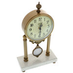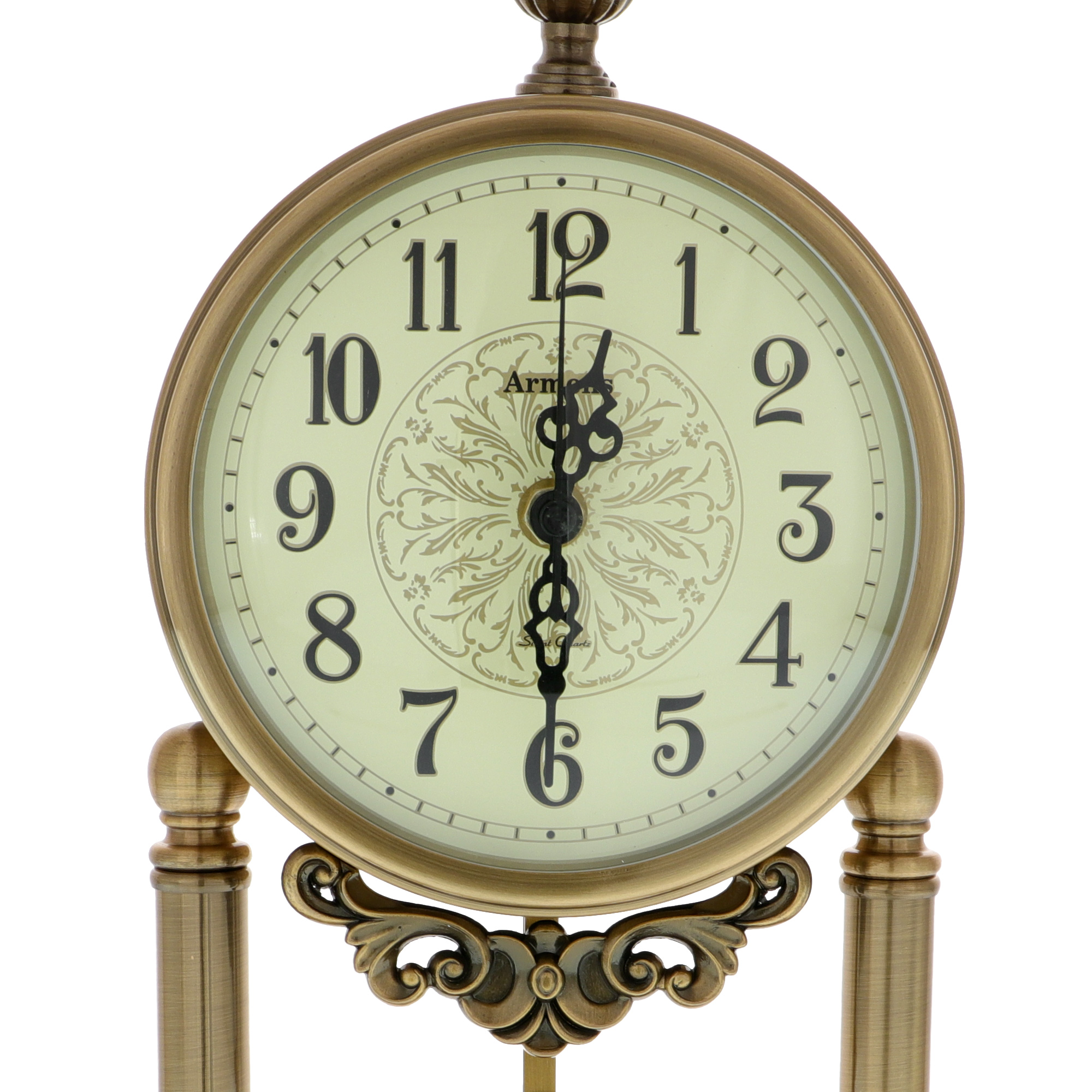 Ceas retro cu pendul, un decor deosebit pentru casa in nuante calde de bronz, care va atrage privirile oricui, eleganta si simplitatea lui cu siguranta vor fi remarcate. Ceasul este lucrat cu grija si este realizat din metal si sticla, iar baza lui este realizata din marmura alba groasa de 3 cm. Cadranul acoperit cu sticla este unul generos cu un diametru de 14 cm si cu cifre arabe ce au o inaltime de 1.5 cm.
