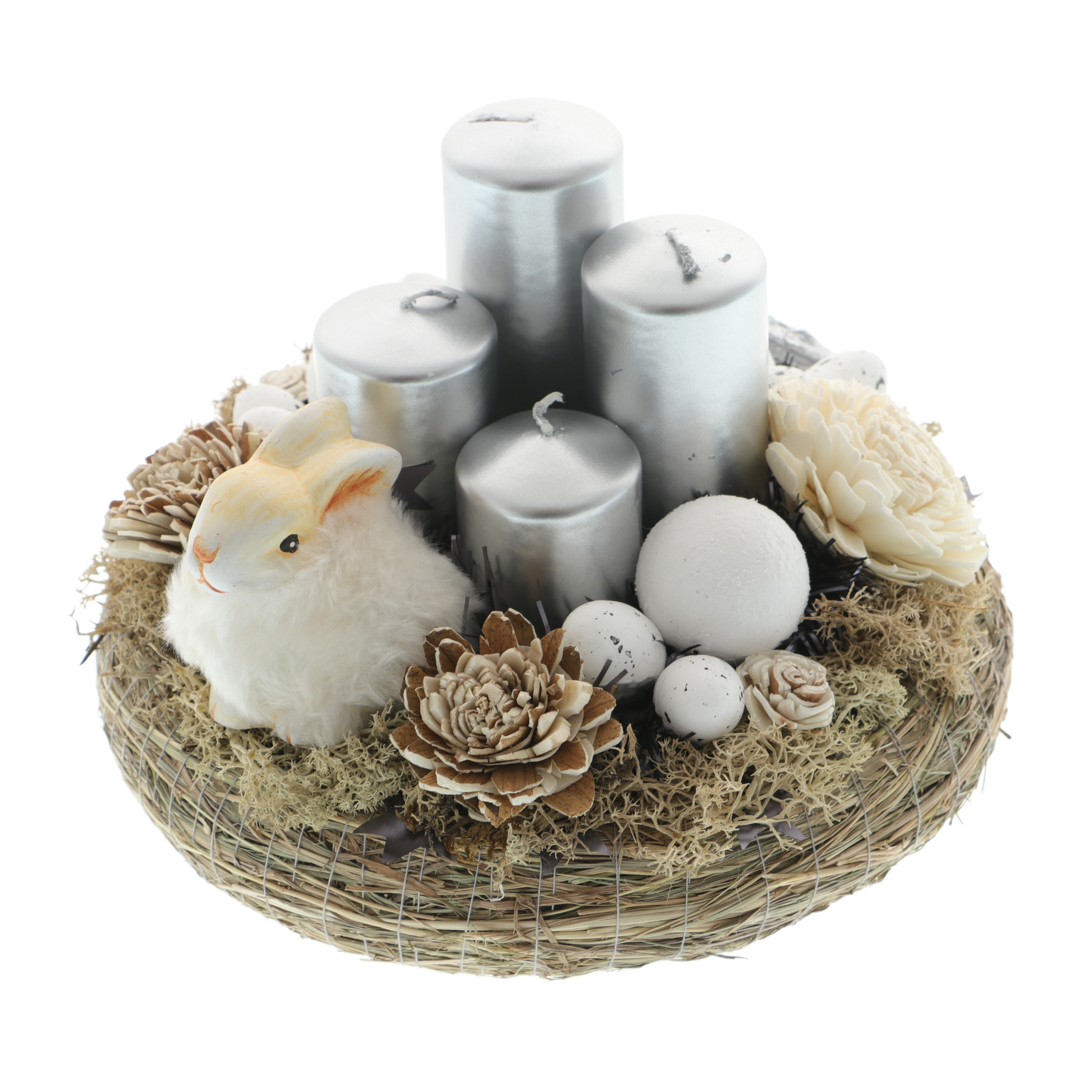 Coronița de Paște cu iepuraș alb și patru lumânări este un decor manual ideal pentru sărbătorile pascale, aducând o notă de eleganță și tradiție în orice spațiu.