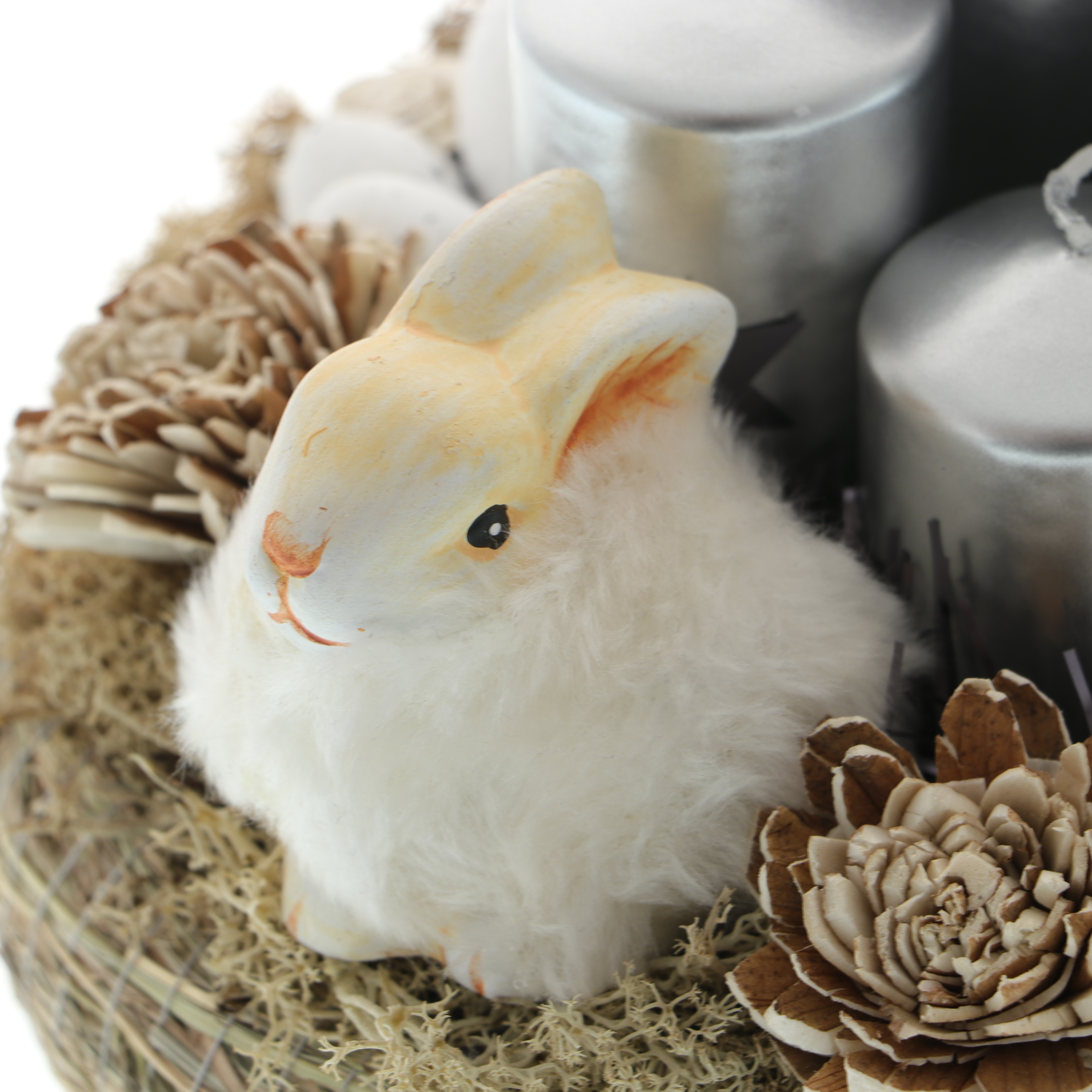 Iepuraș alb pufos: Element central al aranjamentului, iepurașul simbolizează fertilitatea și renașterea, fiind un simbol tradițional al Paștelui.