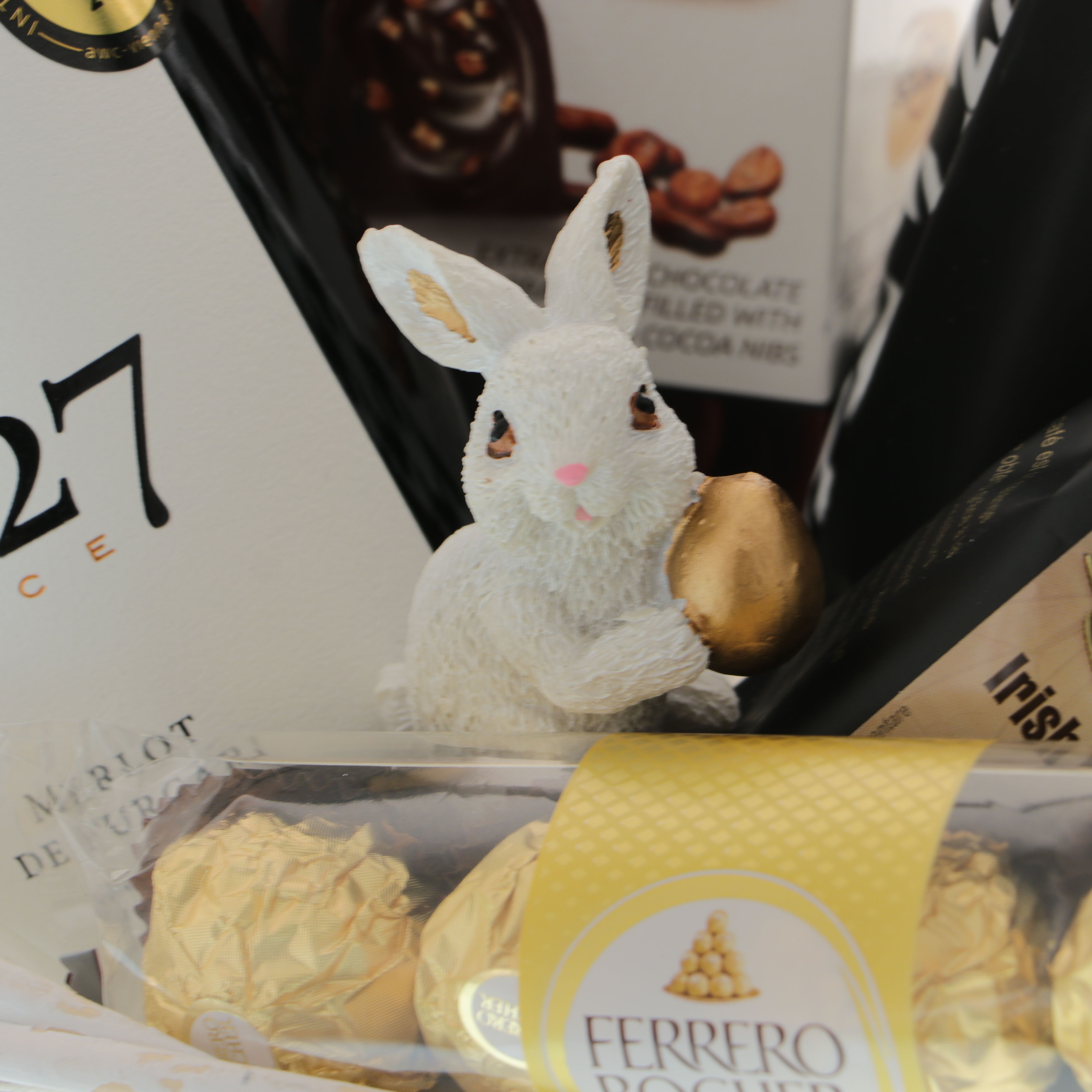 Iepuraș decorativ alb: Un simbol al sărbătorilor pascale, acest iepuraș adaugă o notă veselă și decorativă coșului.
