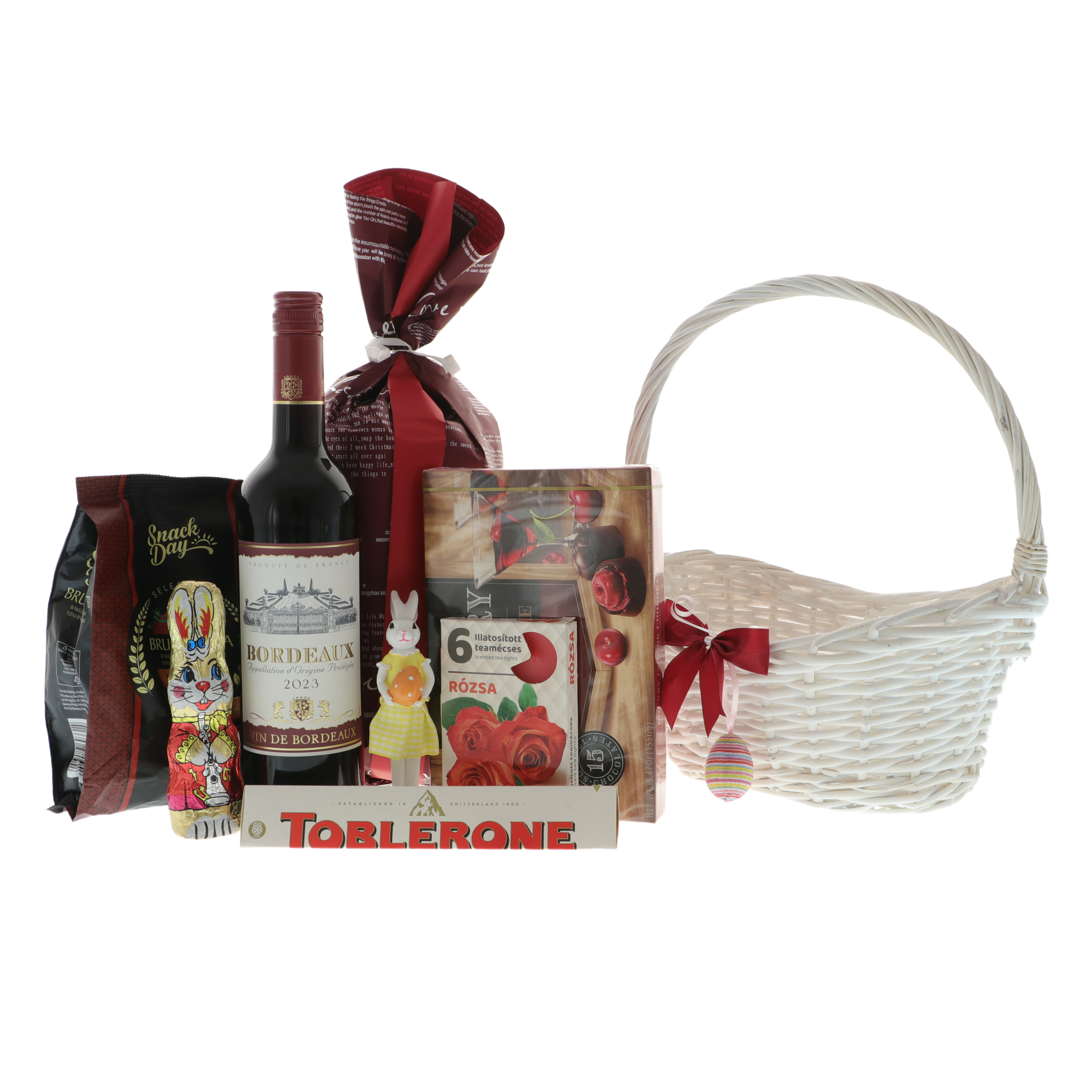 Toate produsele sunt așezate într-un coș elegant din nuiele alb, decorat festiv cu elemente specifice Paștelui, oferind un aspect rafinat și primitor.
