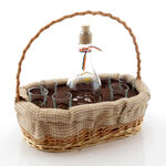Cos impletit, compartimentat pentru o sticla si 6 pahare de tarie. Este un cos traditional, iar sticla are inscriptionat mesajul "Romania ". Puteti opta pentru personalizarea sticlei cu un alt mesaj, pe langa cel initial. Exteriorul cosului este imbracat intr-un material textil. Materiale folosite lemn, sticla. Dimensiuni cos: 34cm L, 20cm l, 30cm h; sticla: 25cm h; pahare: 7cm h.