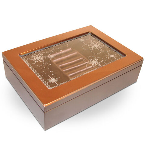 Cutie din lemn pentru bijuterii, de culoare maro cu finisaj lăcuit lucios. Cutia are capac transparent cu model pe el, iar interiorul este compartimentat în 3. Cel din mijloc este special creat pentru aşezarea inelelor, fiind format din cilindri subţiri imbrăcaţi în saten, printre care se aşează inelul în picioare. Celelalte 2 compartimente sunt pentru lanţuri, brăţări şi cercei, acestea fiind simple căptuşite. Acest cadou se potriveşte pentru ziua de naştere a unei doamne sau domnişoare, care apreciază şi îşi preţuiesc bijuteriile .