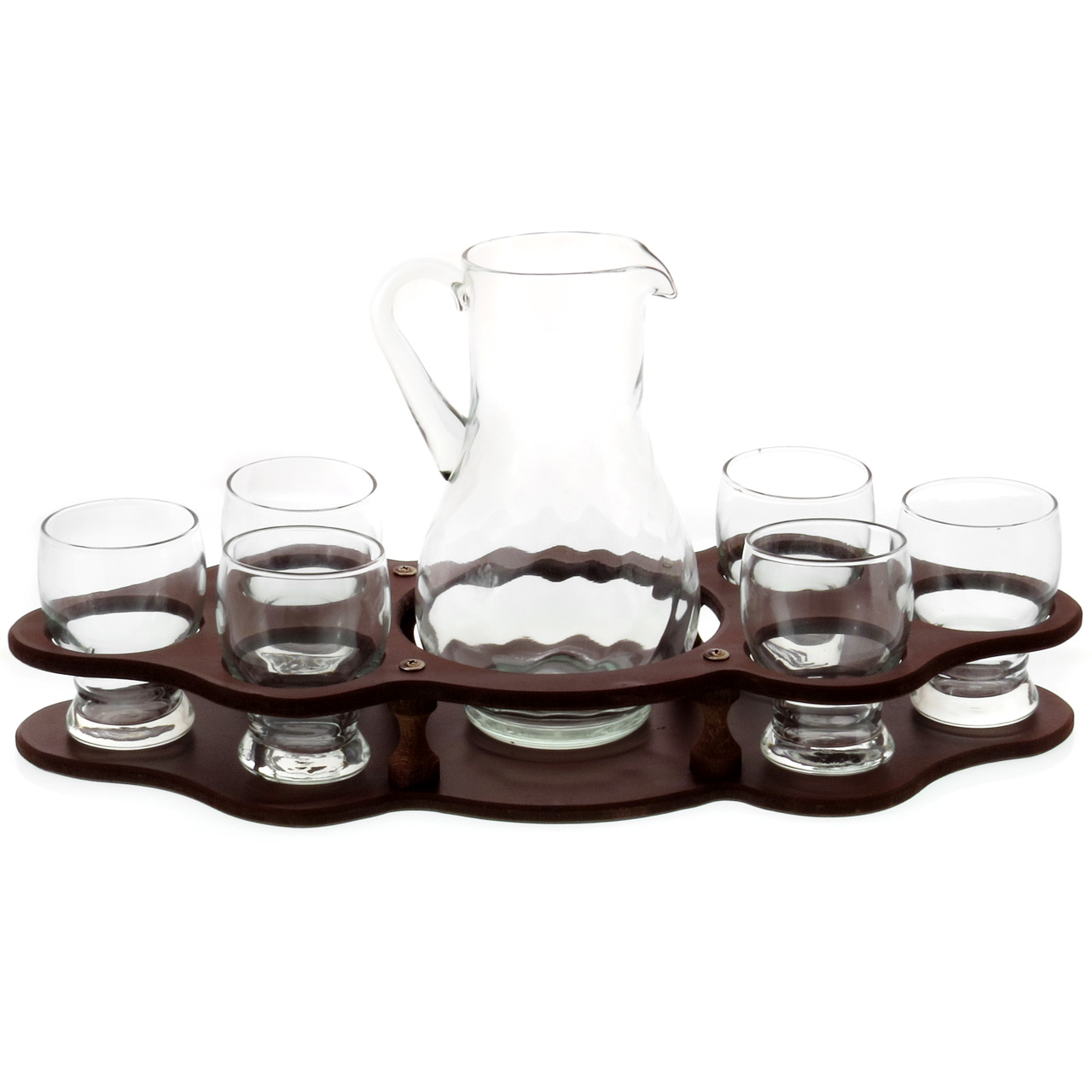 Carafa pentru apa, limonada sau suc, alaturi de 6 pahare, asezate intr-un suport realizat din lemn. Decartorul si paharele sunt din sticla. Acest cadou este ideal pentru servirea impecabila a musafirilor. Paharele sunt de 150 ml, iar cana de 1l. Marime: 45x18xh22