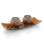 Set decor cu 2 suporturi pentru lumanari si pietricele de decor asezate intr-o tavita dreptunghiulara. Poate fi folosit doar ca decor sau va poate ilumina serile linistite alaturi de cei dragi. Nu trebuie lasat nesupravegheat in timpul arderii lumanarii.