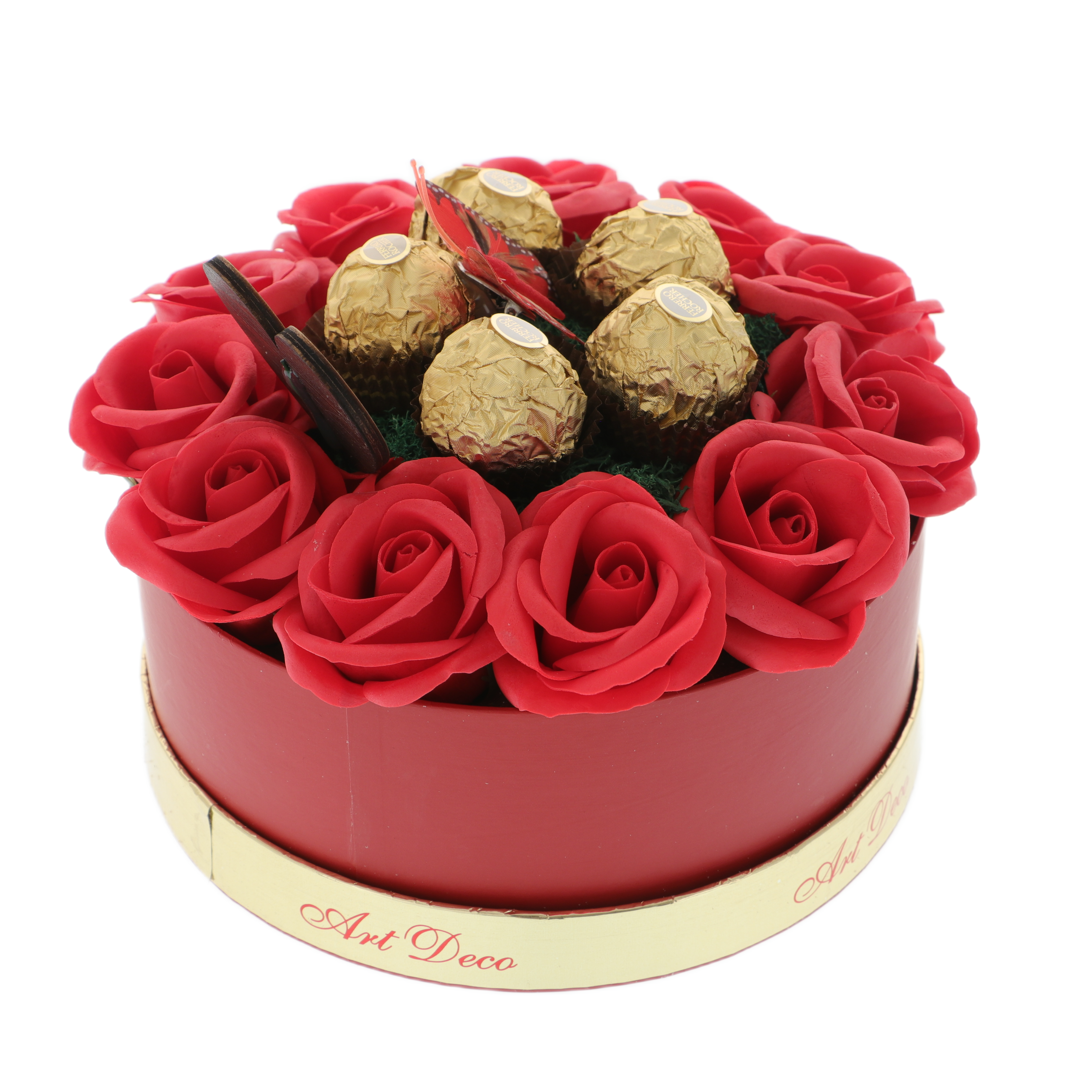 This flower arrangement with soapy red roses is an elegant expression of love and affection. Carefully placed in an elegant red box with gold accents, the roses are harmoniously complemented by Ferrero Rocher chocolate pralines, adding a subtle blend of sweetness and romance. With a diameter of 17 cm and a height of 12 cm, this arrangement is perfect to decorate any space with elegance and sophistication. The centerpiece of the arrangement is the heart-shaped wooden plaque engraved with the message "Happy Birthday!", giving it a personal and emotional touch. The message can also be customized according to your preferences. A red flyer is placed in the center of the arrangement, bringing a touch of delicacy and charm. Whether celebrating an anniversary, birthday or other special moments, this floral arrangement is the perfect gift to convey best wishes and create unforgettable memories.