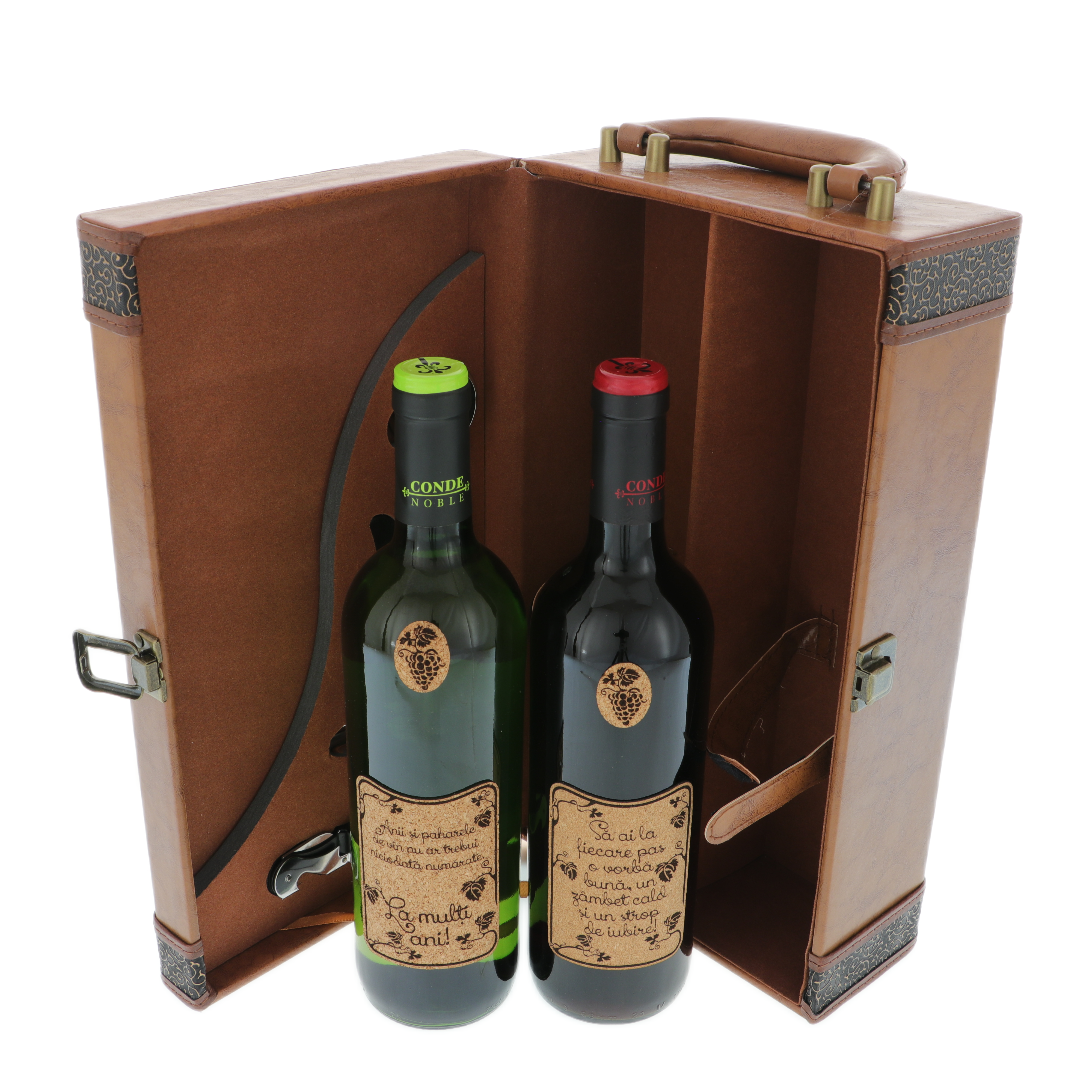The gift set also includes two bottles of Conde Noble wine from Spain, each with a personalized cork label: