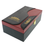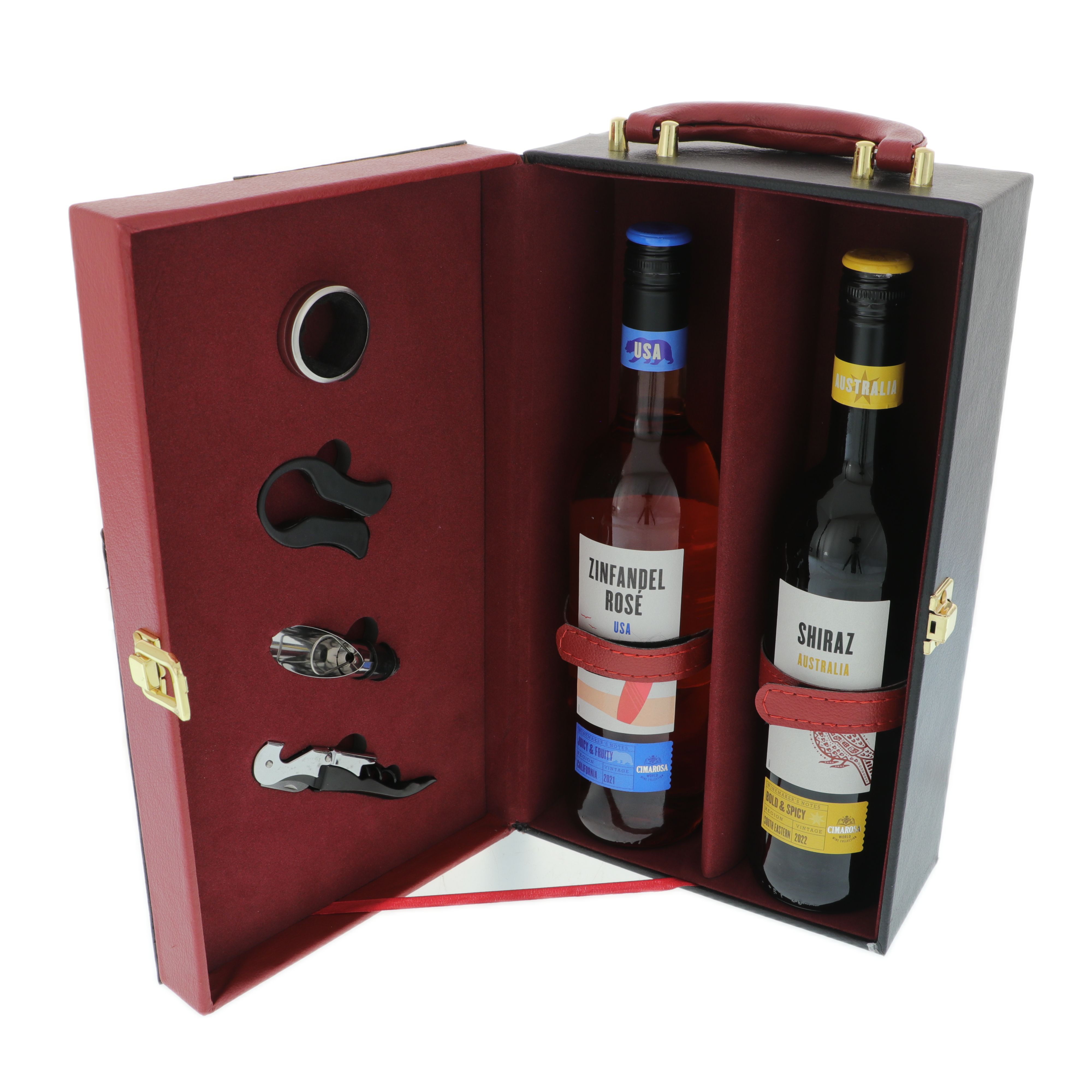 Elegant box dressed in black and red ecological leather, the lid is decorated with a cutout in the shape of a wine glass. Inside, the box includes 4 accessories necessary for serving wine and is specially compartmentalized for storing two bottles of wine.