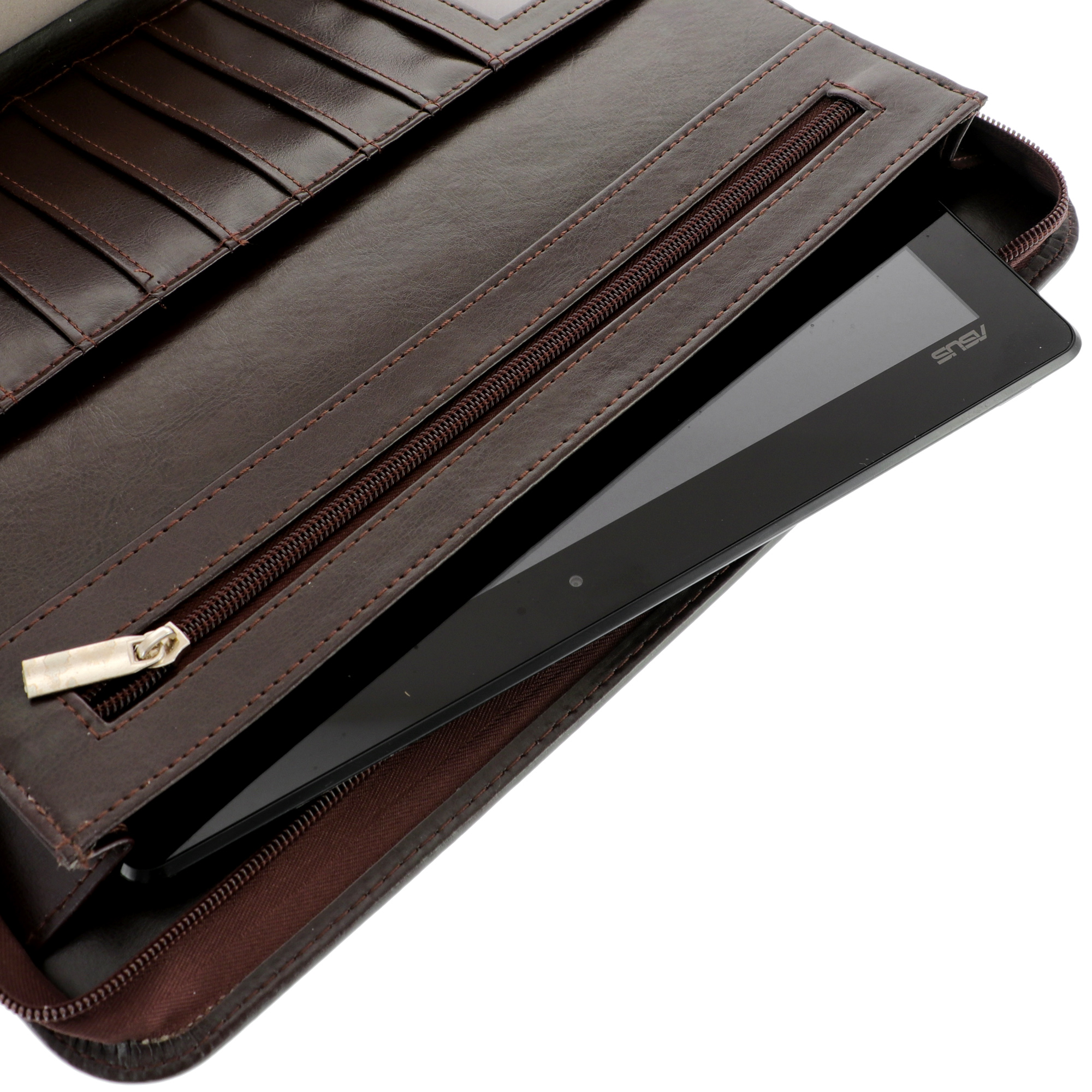 Dark brown A4 business folder, made of ecological leather. Inside it is divided as follows: