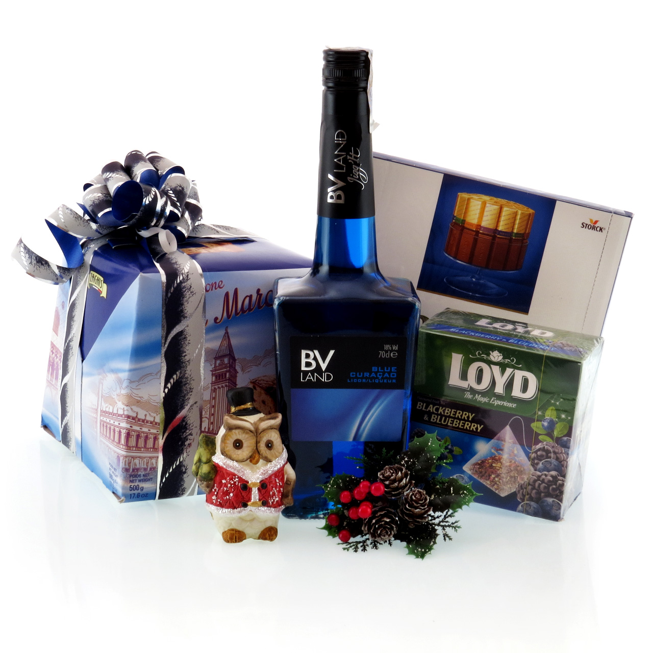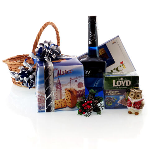 All products are placed in a gift basket decorated in the Christmas spirit . The bottle can be personalized with a painted message on an engraved plate.