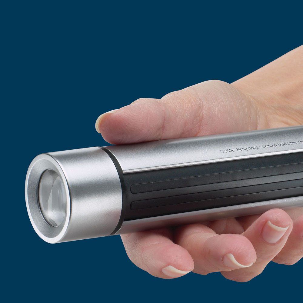 LED torch with "Touch on function", continuous shine function for LED light stripes on the side of the lamp, touch sensor and LED light stripes can be covered through turning, stand-by and off-function, silver, plastic, matted silver, black, incl. batteries 3 x AA, in gift packaging