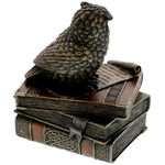 Decorative box in the form of overlapping books, above which there is an owl sitting on a parchment. The box is made of resin painted in shades of brown-bronze. The box can be used for small things, shirt buttons, jewelry, keys or other small objects. The owl is placed on a parchment that bears the message "The owl personifies wisdom, knowledge and human experience."