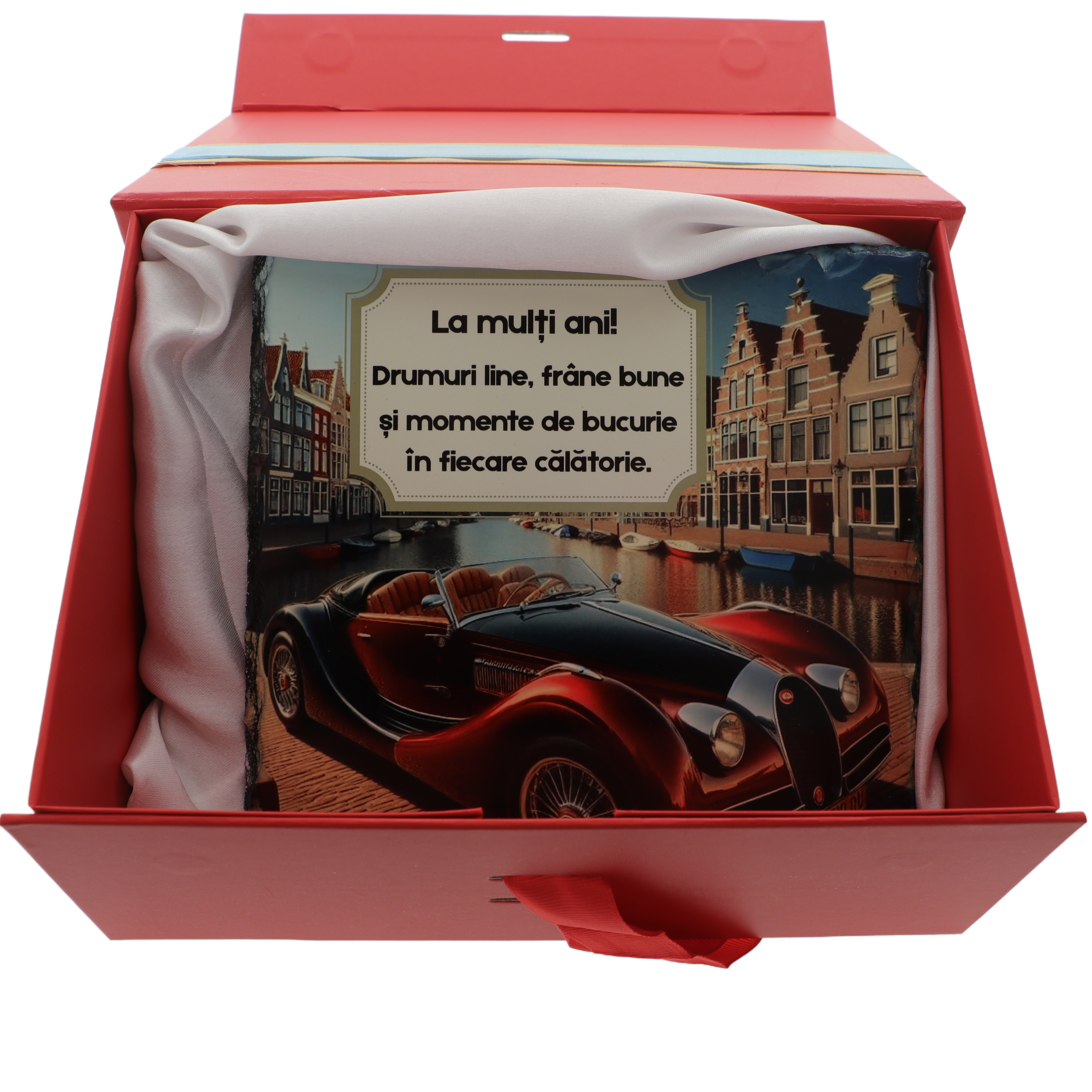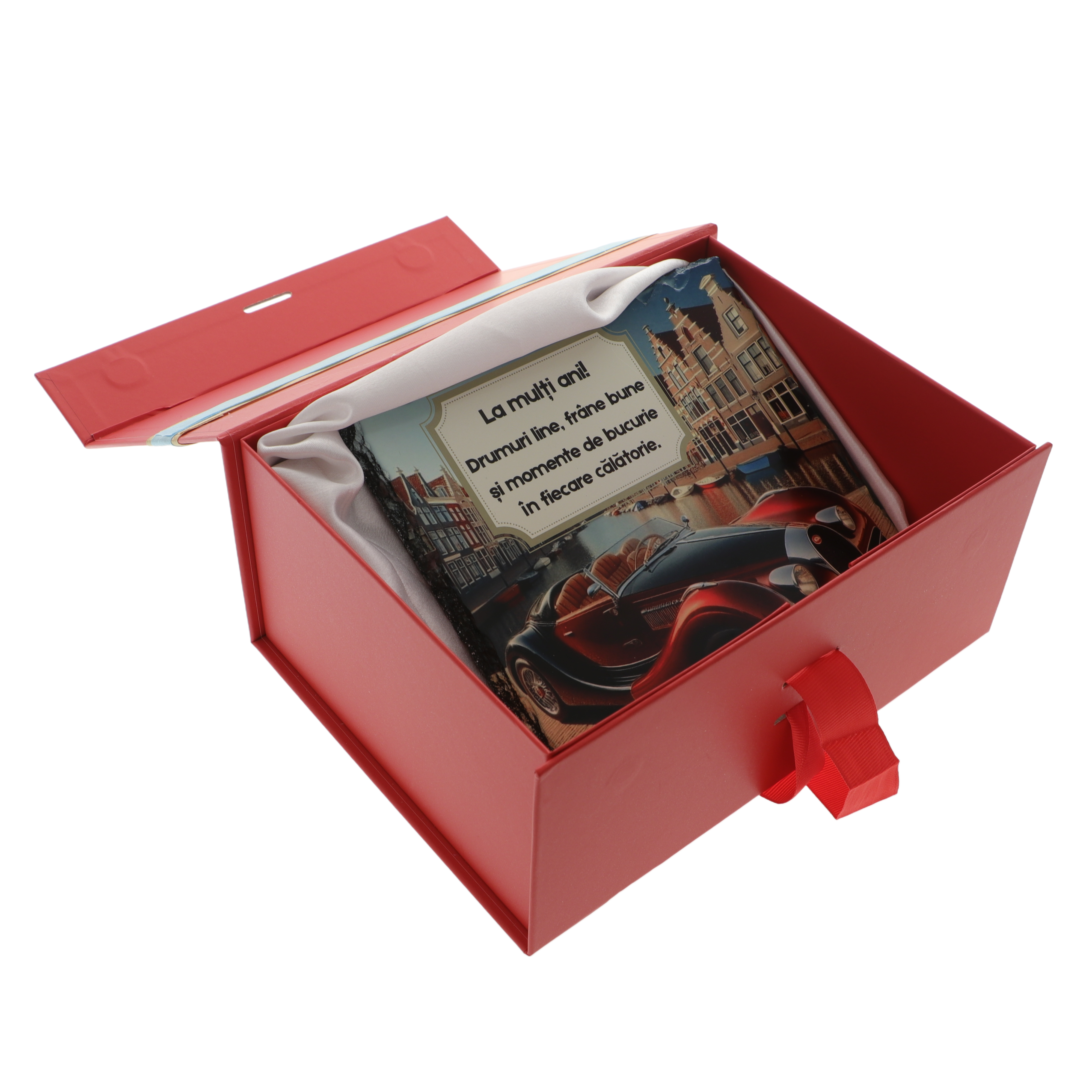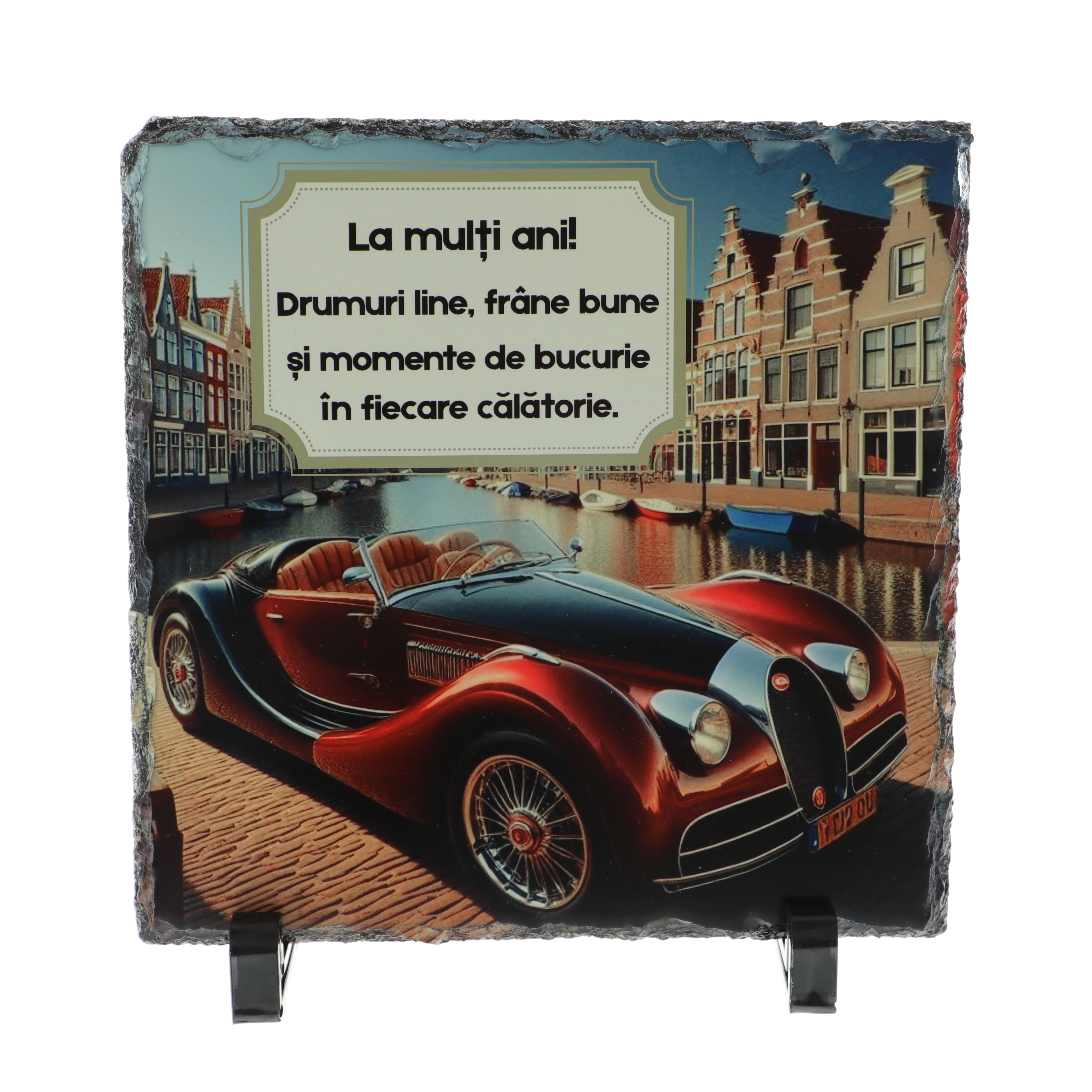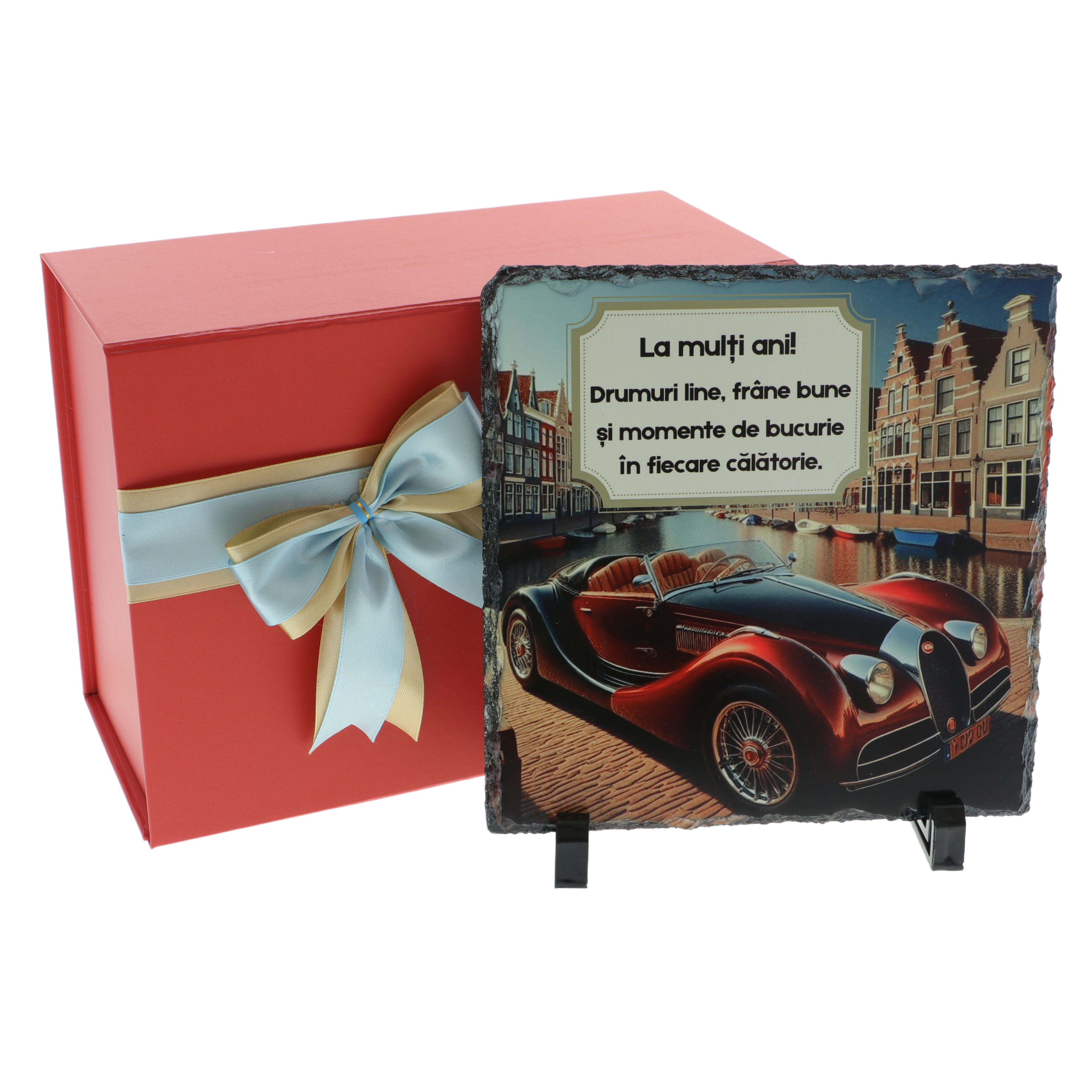 Made from natural slate stone, this 19x19 cm decorative plaque impresses with its authentic look, unique texture, and long-lasting durability. The design features a classic red car in a stylish urban setting, symbolizing the passion for smooth roads, memorable adventures, and unforgettable experiences.