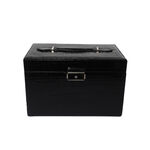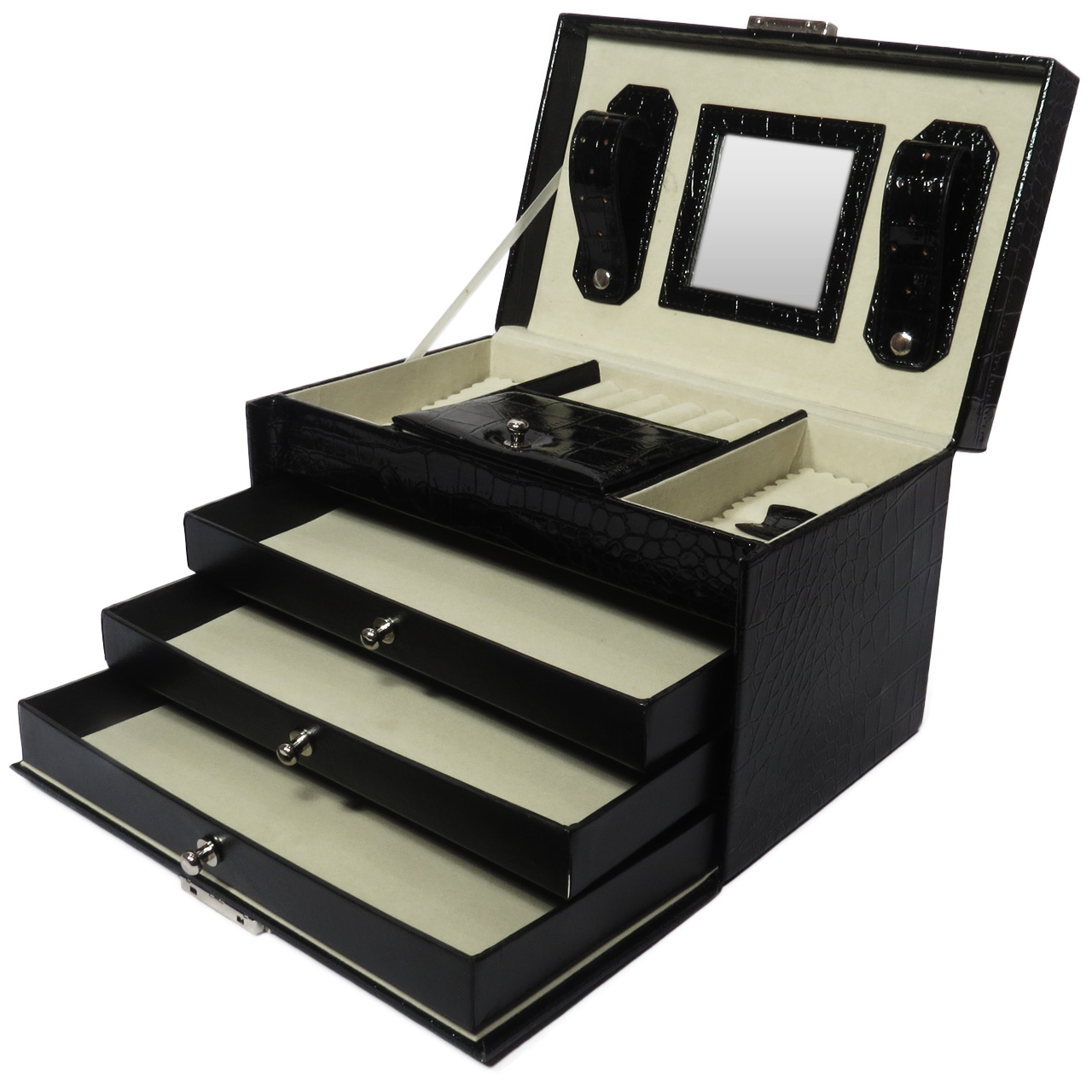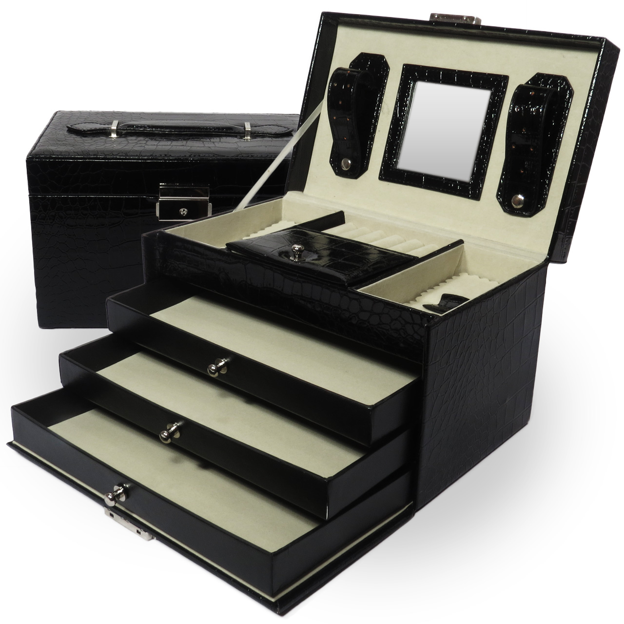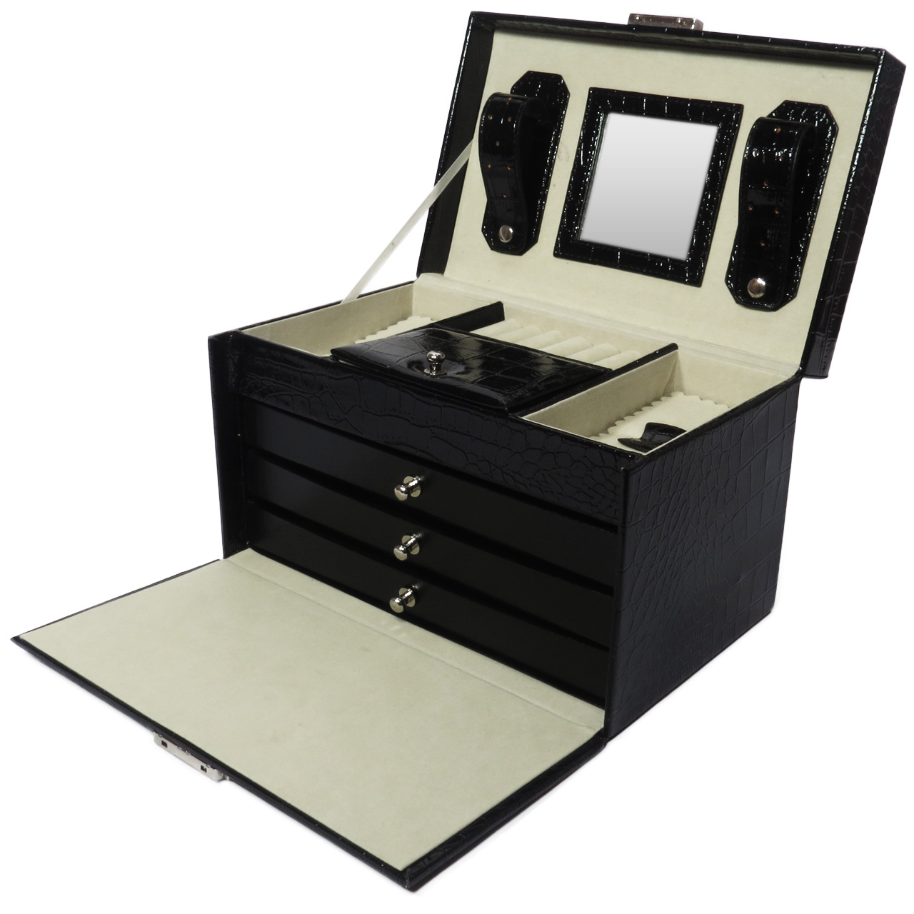 Geantă elegantă, foarte încăpătoare de bijuterii. Exteriorul acestei genţi de bijuterii este din piele artificială, lucioasă, în stil piele crocodil. Interiorul este căptuşit cu catifea de culoare crem deschis. Această cutie de depozitare are loc special pentru inele, brăţări, cercei sau seturi şi are 3 sertare universale în care se pot pune orice fel de bijuterii. Interiorul capacului este dotat cu oglindă.