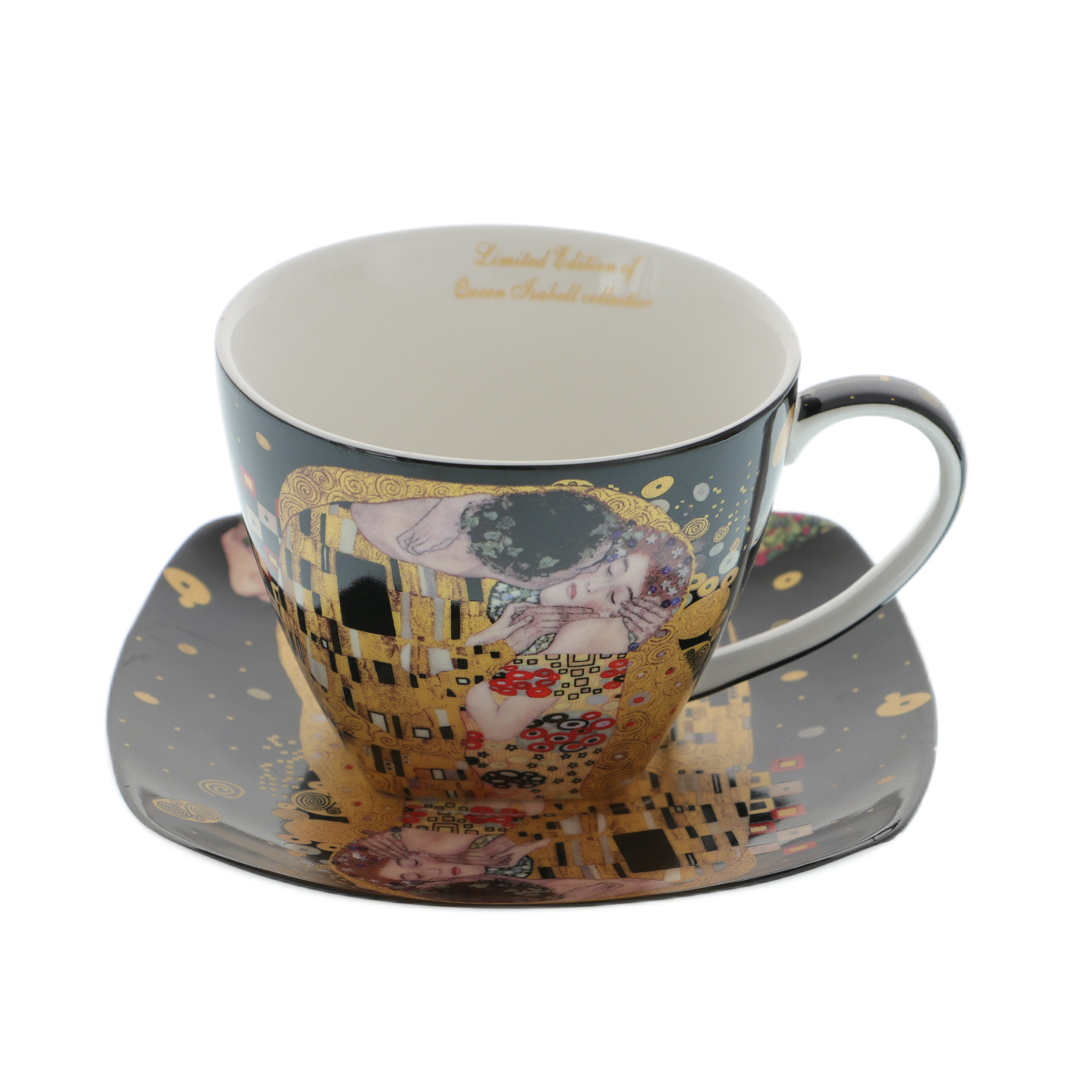 A készlet nagyszerű választás, tökéletes azok számára, akik minden részletében értékelik a művészetet és a kifinomultságot. A finom porcelánból készült két csésze, valamint a tányérok és a kanalak eleganciájukkal és Gustav Klimt híres "A csók" című festménye által ihletett díszítéssel tűnnek ki.