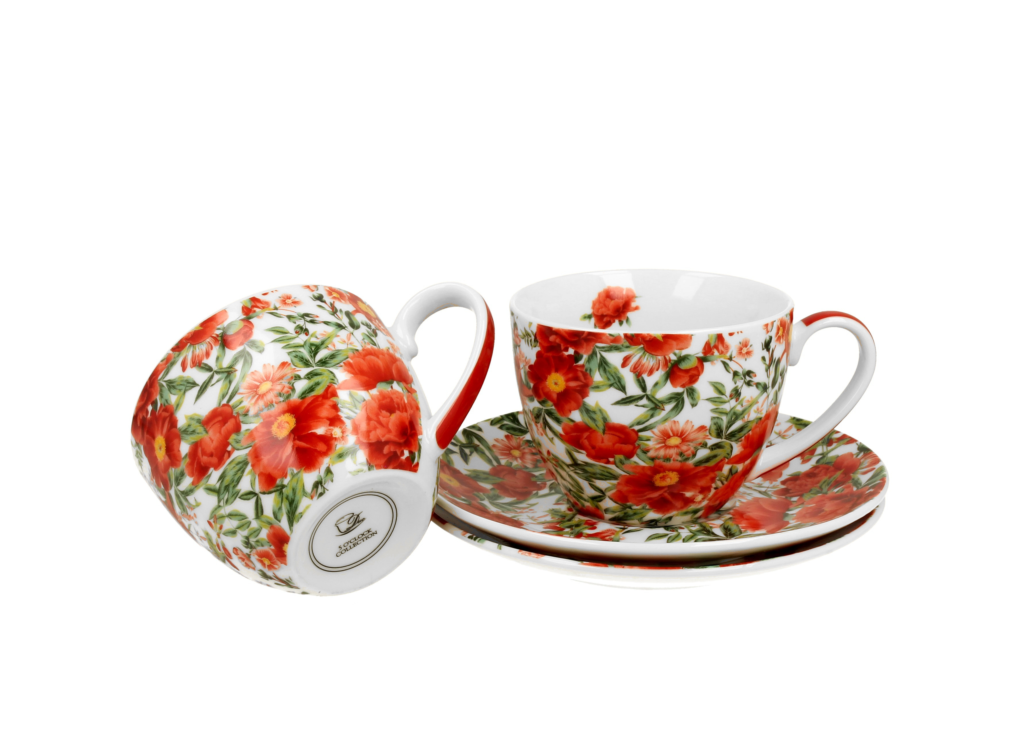 A következő termék egy elegáns készlet, amely 2 fehér porcelán csészéből és 2 tányérból áll, finom piros árnyalatú kerti virágokkal díszítve. A csészék 250 ml-es űrtartalmúak, így megfelelő helyet biztosítanak kedvenc italának kifinomult elfogyasztásához. Elegánsan, azonos virágmintás díszdobozban jelennek meg.