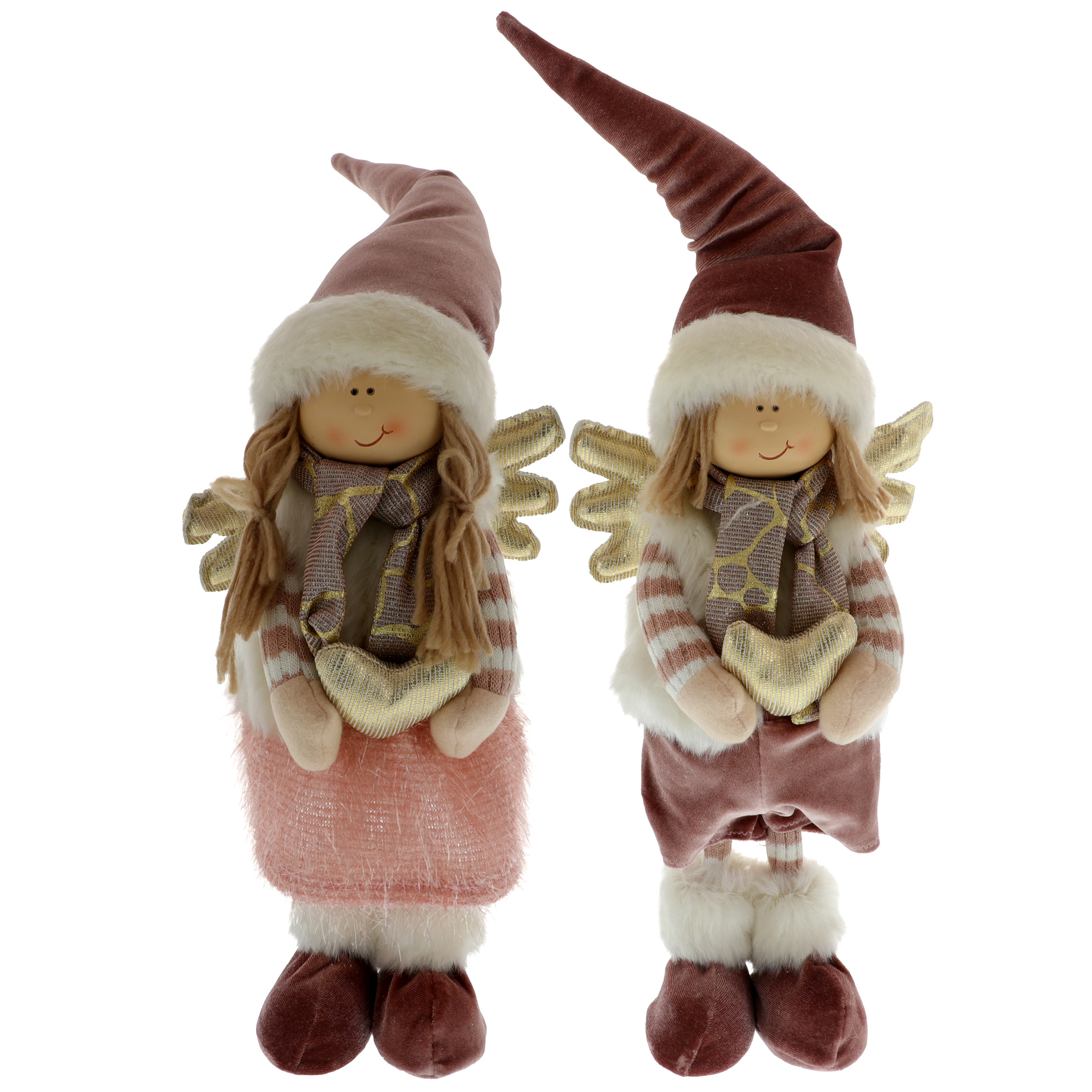 Angyalfigura textil anyagból, 2 változatban kapható: lány és fiú. Az angyalfigura lábon áll, és szívet tart a kezében. A 35 cm magas angyal bársony sapkát és bundát visel, a ruhák bársonyból és kötött anyagból vannak készitve. A modellt a „Nem” menüpontból választhatja ki. Méretei: 14x13x35 cm.