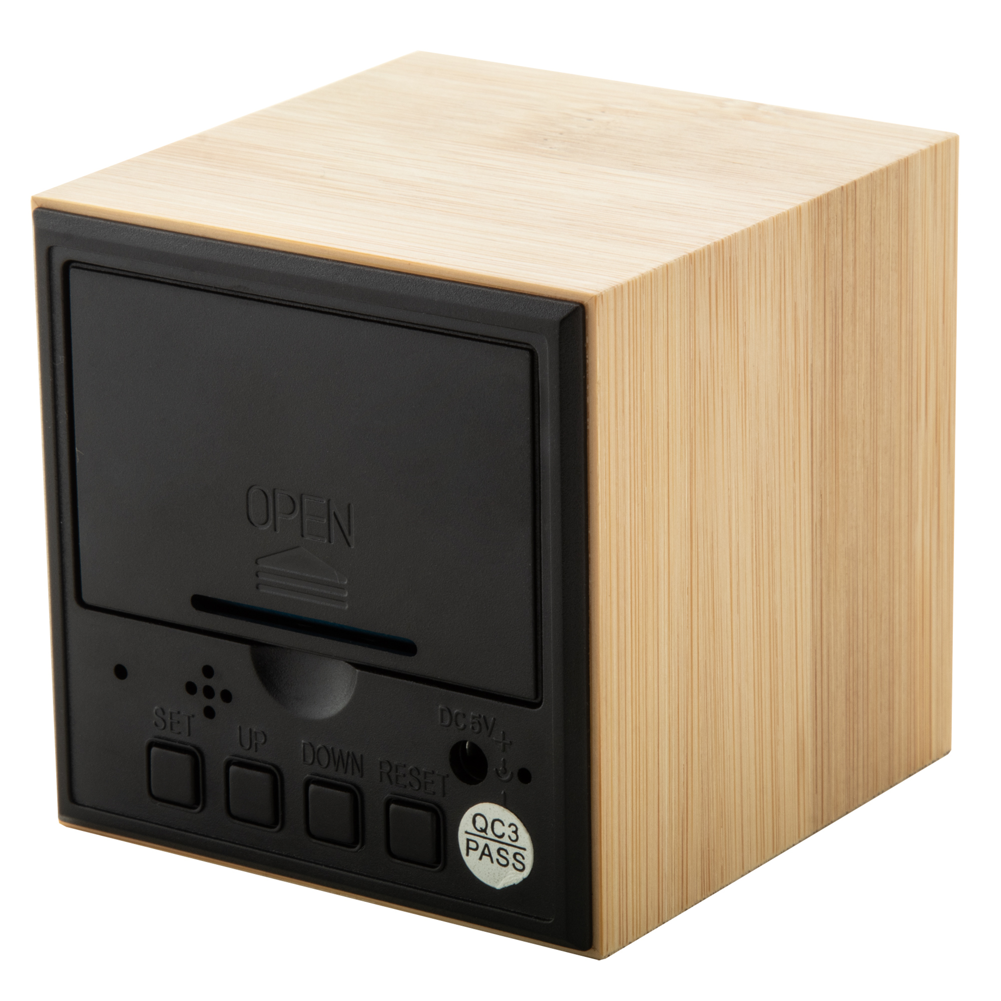 Ébresztőóra és testreszabható hőmérő LED kijelzővel. Az óra bambuszfával van befedve, amely lehetővé teszi egy különleges üzenet gravirozását azok számára, akik egyedi ajándékot szeretnének adni. Az órát a készletben található USB kábellel, vagy 3 AAA elem segítségével lehet táplálni (az elemeket NEM tartalmazza a doboz). Méretek: 6,2 x 6,2 x 6,2 cm.