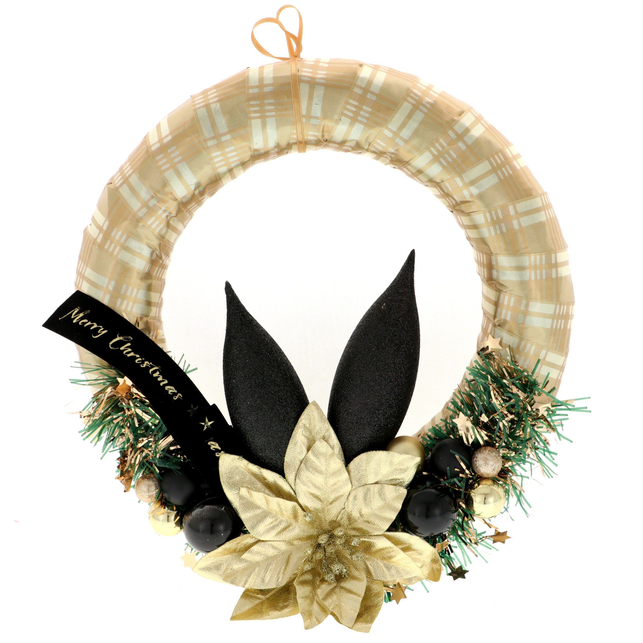 A következő termék egy kézzel készített karácsonyi és újévi ajtókoszorú, tömör szalma alappal. Ez a koszorú dekoratív arany szalagba van becsomagolva, arany Euphorbia virággal, fekete szalaggal a "Merry Christmas" üzenettel, talmi elemekkel és fekete-arany matt és fényes gömbökkel díszítve különböző méretekben. Az akasztó arany szaténból készült, ami extra eleganciát ad. A korona átmérője 25 cm, vastagsága 7 cm, gazdag és ünnepi megjelenést biztosítva.