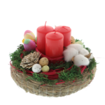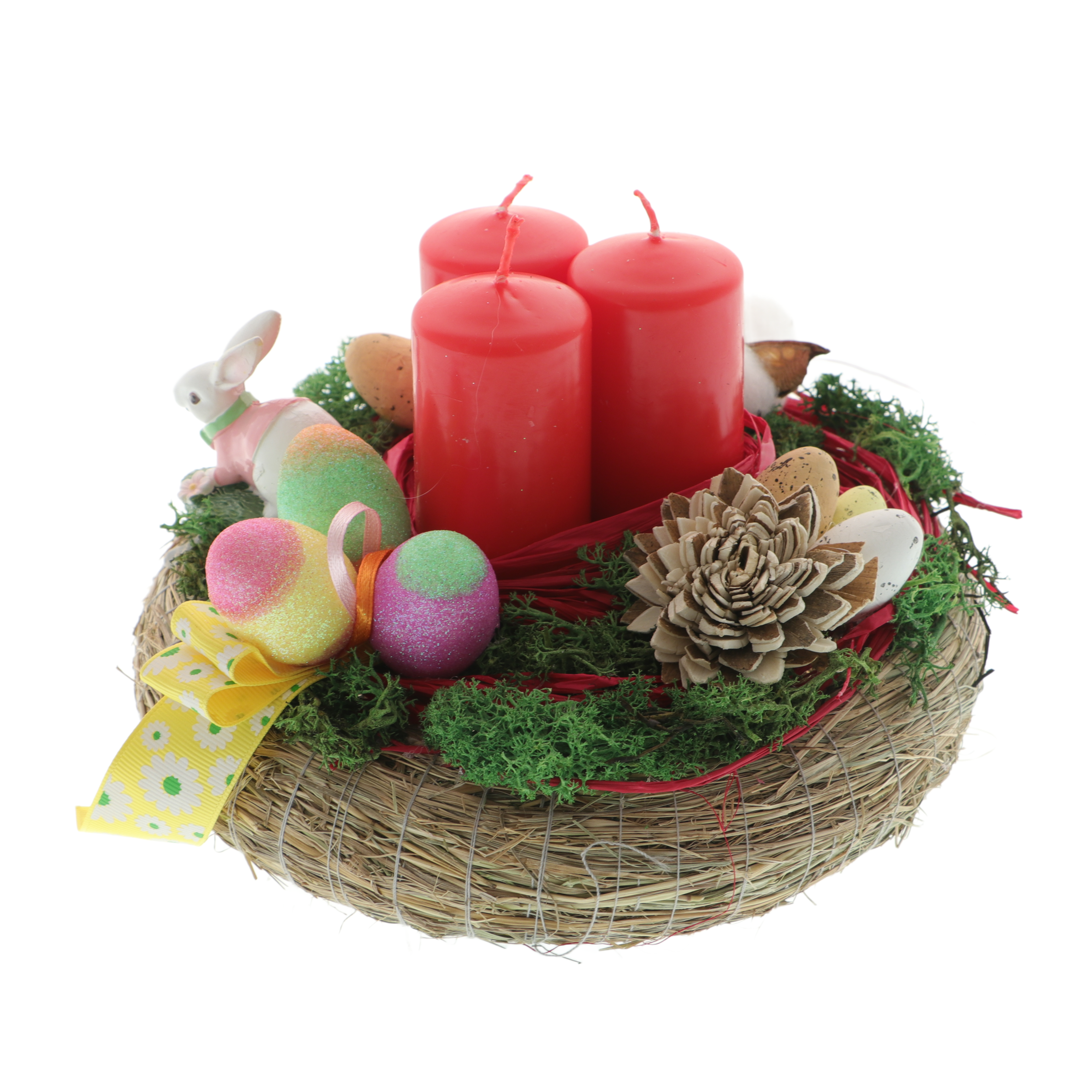 A "Húsvéti dekoráció nyuszival és 3 piros gyertyával" egy kézzel készített asztali dísz, amely tökéletesen megteremti az ünnepi hangulatot otthonában. Az alapja egy 20 cm átmérőjű szalmakoszorú. A koszorú közepén három piros gyertya található, amelyeket természetes zuzmó, dekoratív tojások, pamutvirágok és egyéb húsvéti díszek vesznek körül. A kompozíció központi eleme egy bájos nyuszi figura, amely különleges varázst kölcsönöz az egész elrendezésnek. Ez a dekoráció ideális választás lehet az ünnepi asztal középpontjaként vagy otthona bármely sarkában elhelyezve, hozzájárulva a meleg és hívogató húsvéti légkör megteremtéséhez.