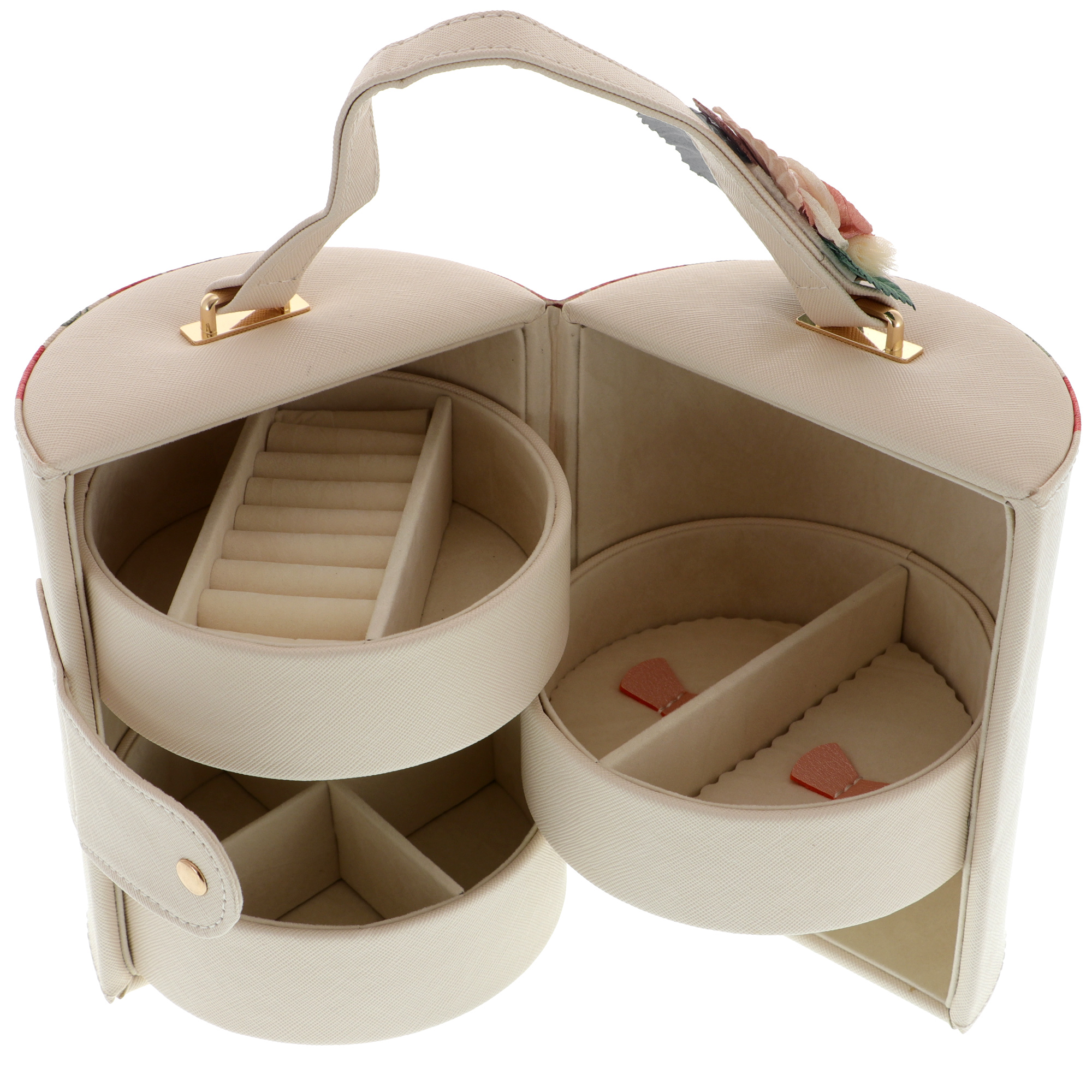 Kerek fogantyús ékszerdoboz, ajándék nőknek környezetbarát krémbőrből. A hengeres dobozt piros virágok díszítik. A belső tér 3 szintre oszlik, mindegyik szinten 2, illetve 3 rekeszes. A doboz kapoccsal záródik. Személyre szabható a választott üzenettel gravírozott emléktábla felhelyezésével. Mérete: 14x14x25 cm, magassága fogantyú nélkül 17 cm.