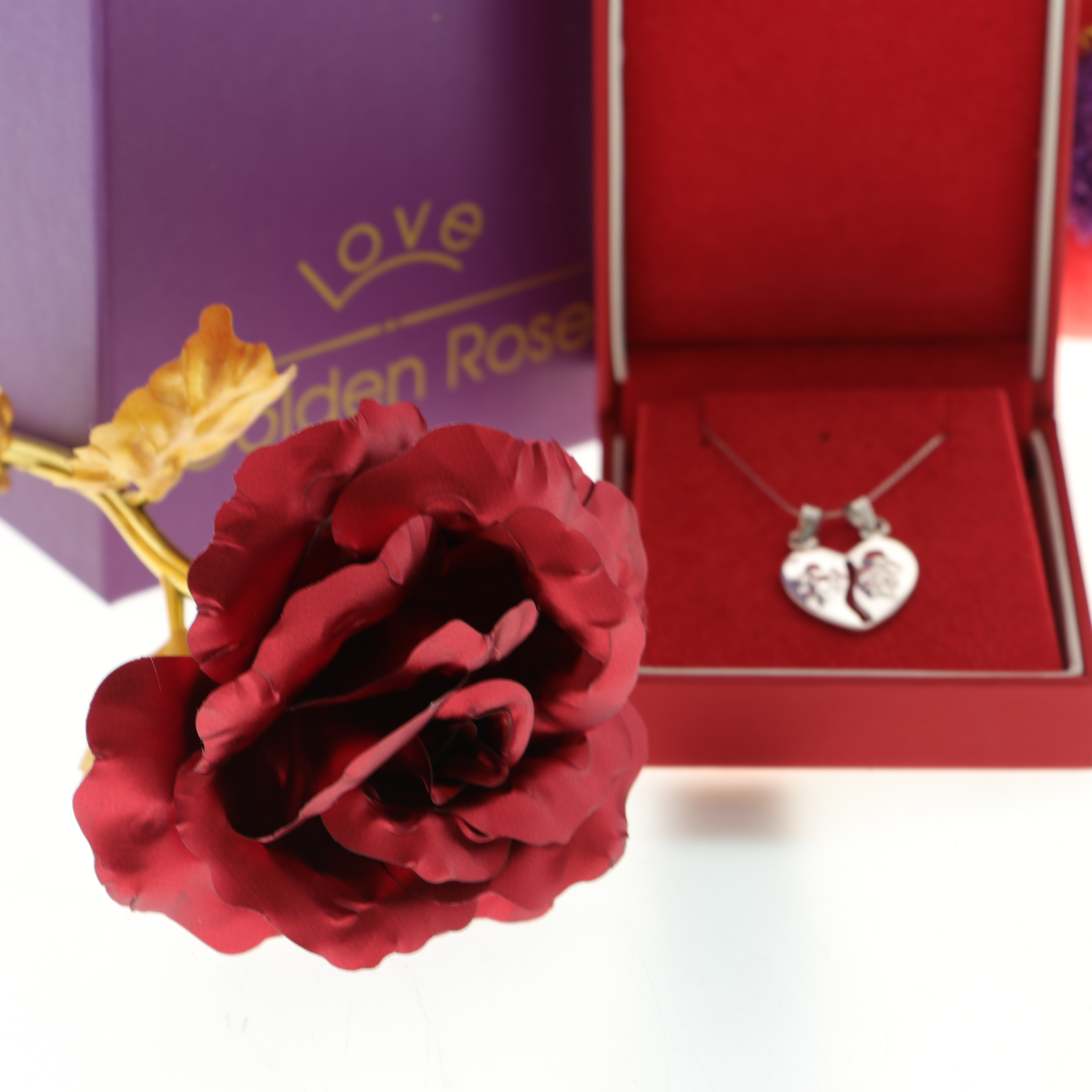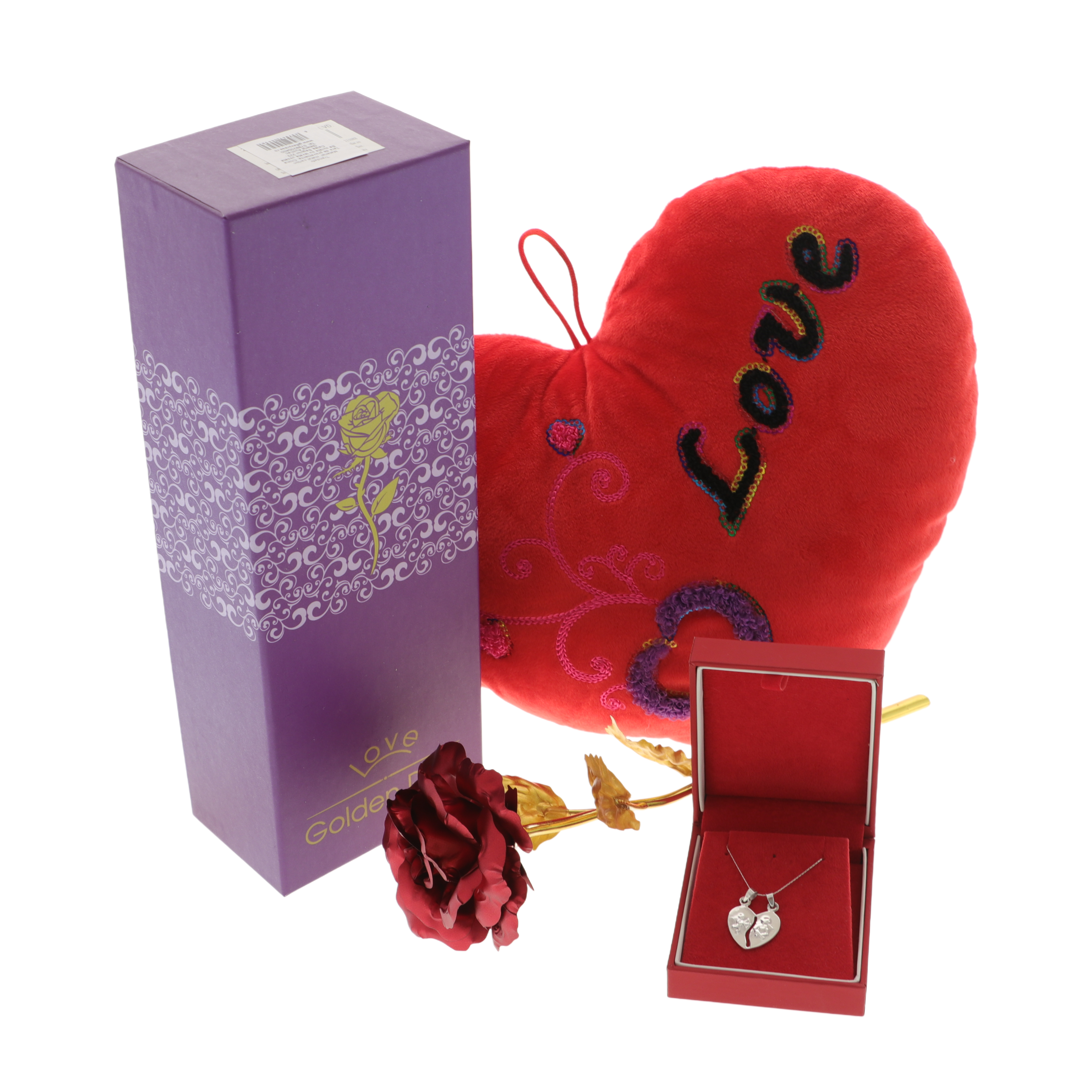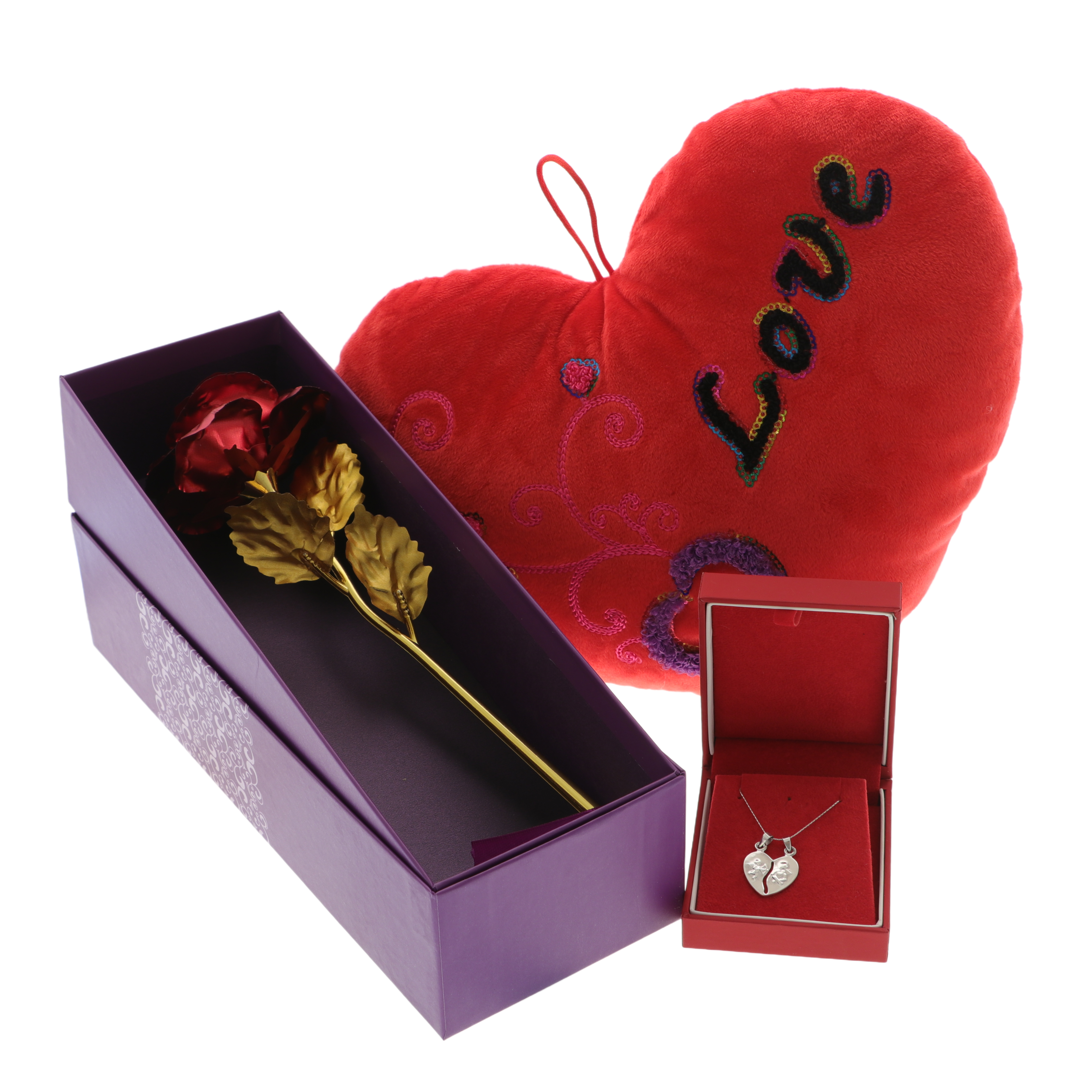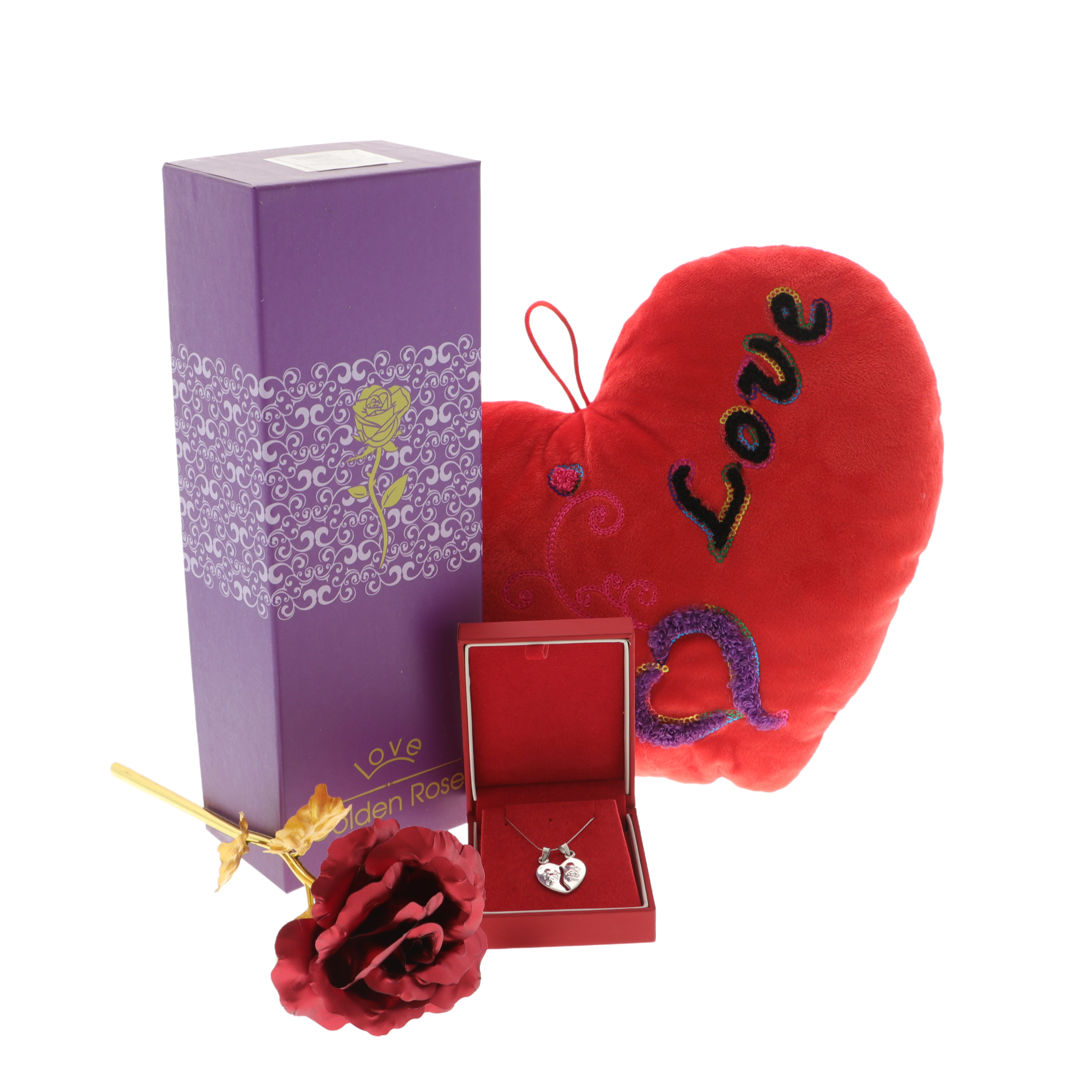 A csomag tartalmaz egy 20 cm hosszú fém rózsát szárral, elegáns ajándékdobozban, amely az örök szerelmet jelképezi. Emellett egy ezüst nyaklánc szív alakú medállal, amely két félre osztható, mindkét felén egy-egy cupidóval díszítve, a két lélek összetartozását fejezi ki. A szettet egy szív alakú díszpárna teszi teljessé, „Love” felirattal.