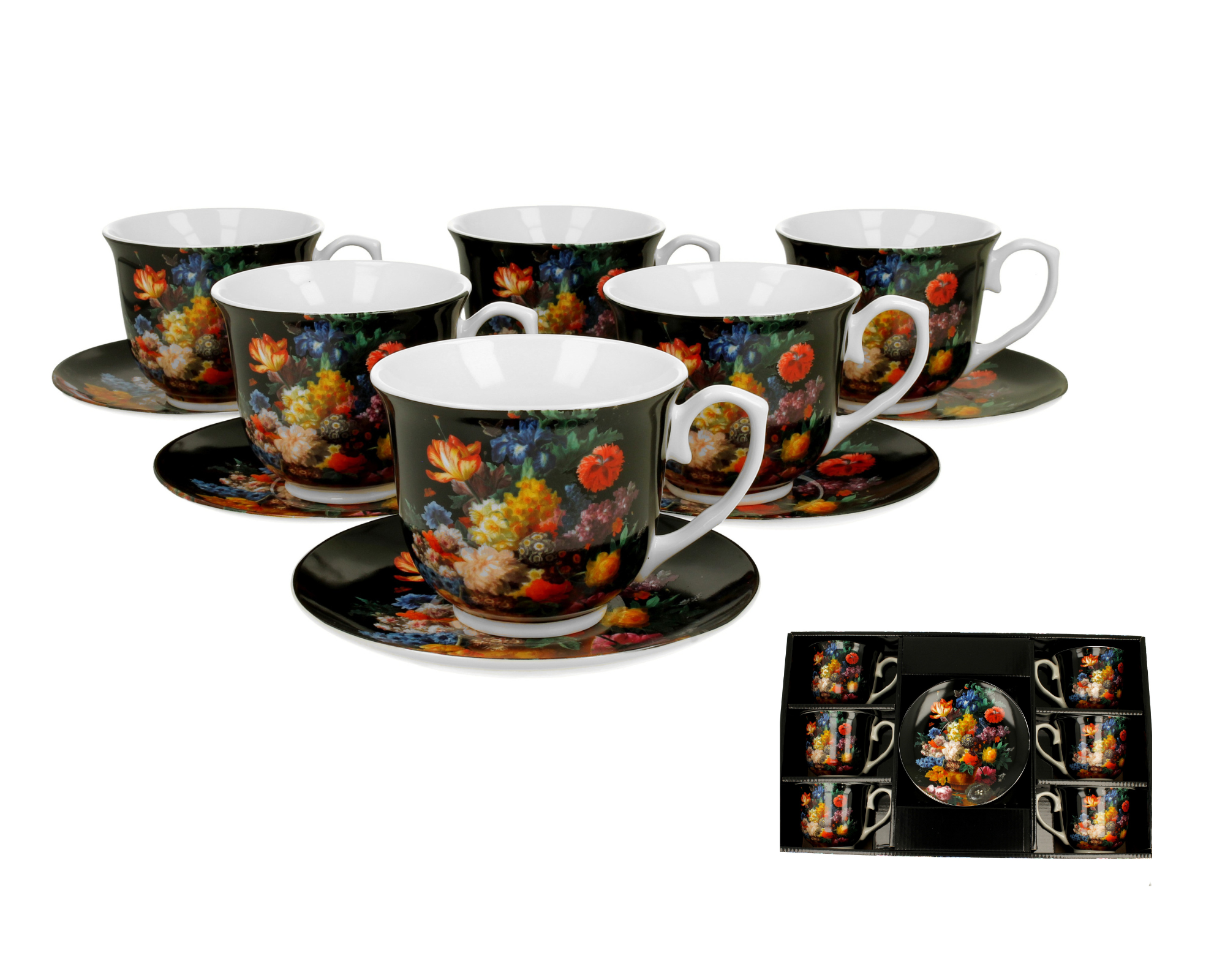 Ez a lenyűgöző, 6 csészéből és 6 tányérból álló, elegáns fekete árnyalatú készlet kifinomult dizájnjával tűnik ki, amelyet finom és élénk színű kerti virágok hangsúlyoznak. Minden 250 ml-es csésze eleganciát és stílust kölcsönöz kedvenc italainak tálalásához, így bármilyen alkalomra alkalmas.