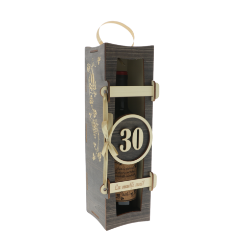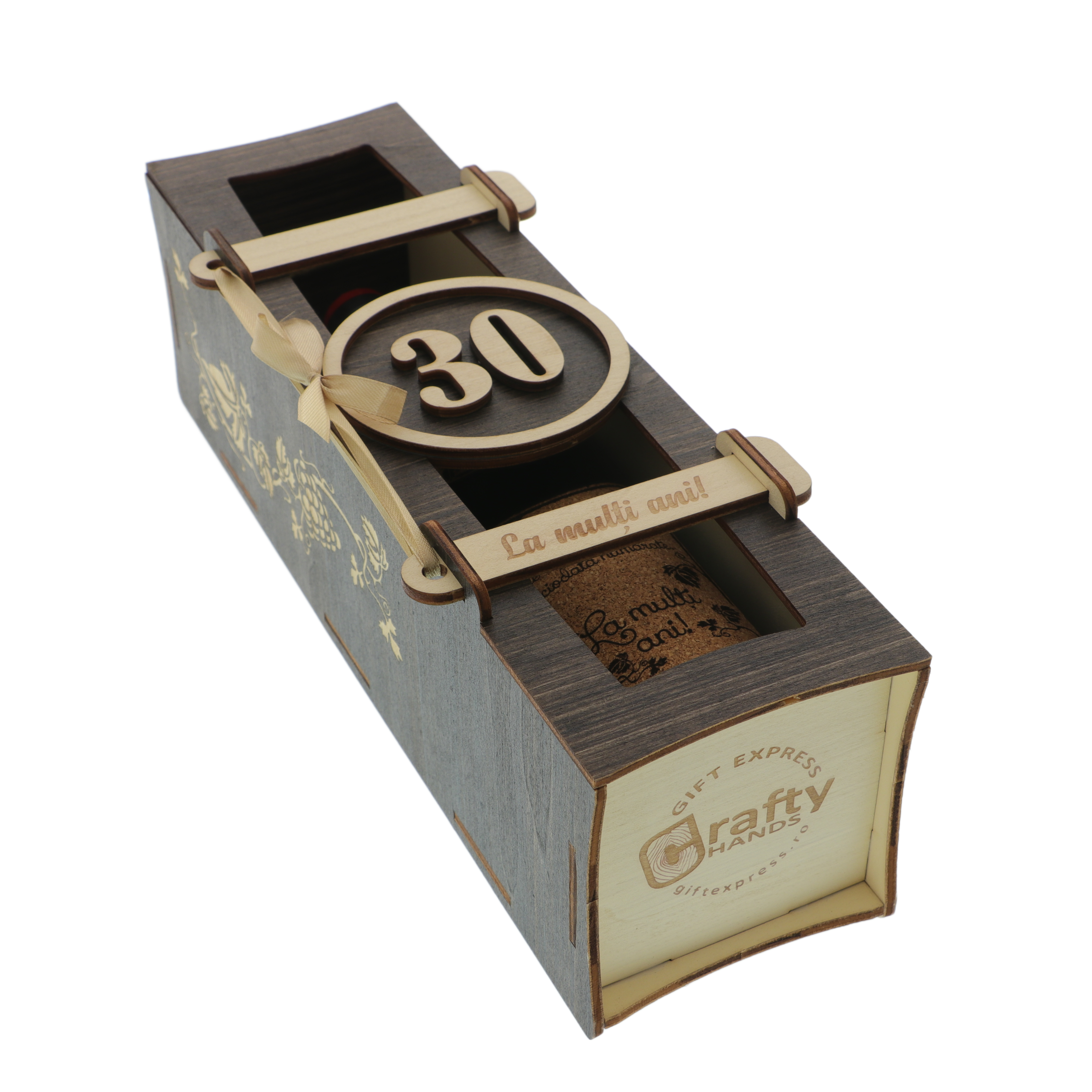 A 12 cm széles, 12 cm mély és 35 cm magas fadoboz több mint egyszerű csomagolás – igazi gyűjtői tárgy. A praktikus fogantyúval és biztonságos zárással felszerelt dobozt szatén szalag díszíti, amely ünnepi és elegáns megjelenést kölcsönöz. A doboz fedele személyre szabott, az ünnepelt életkorának megfelelően állítható számmal, így az ajándék valóban személyes és emlékezetes.