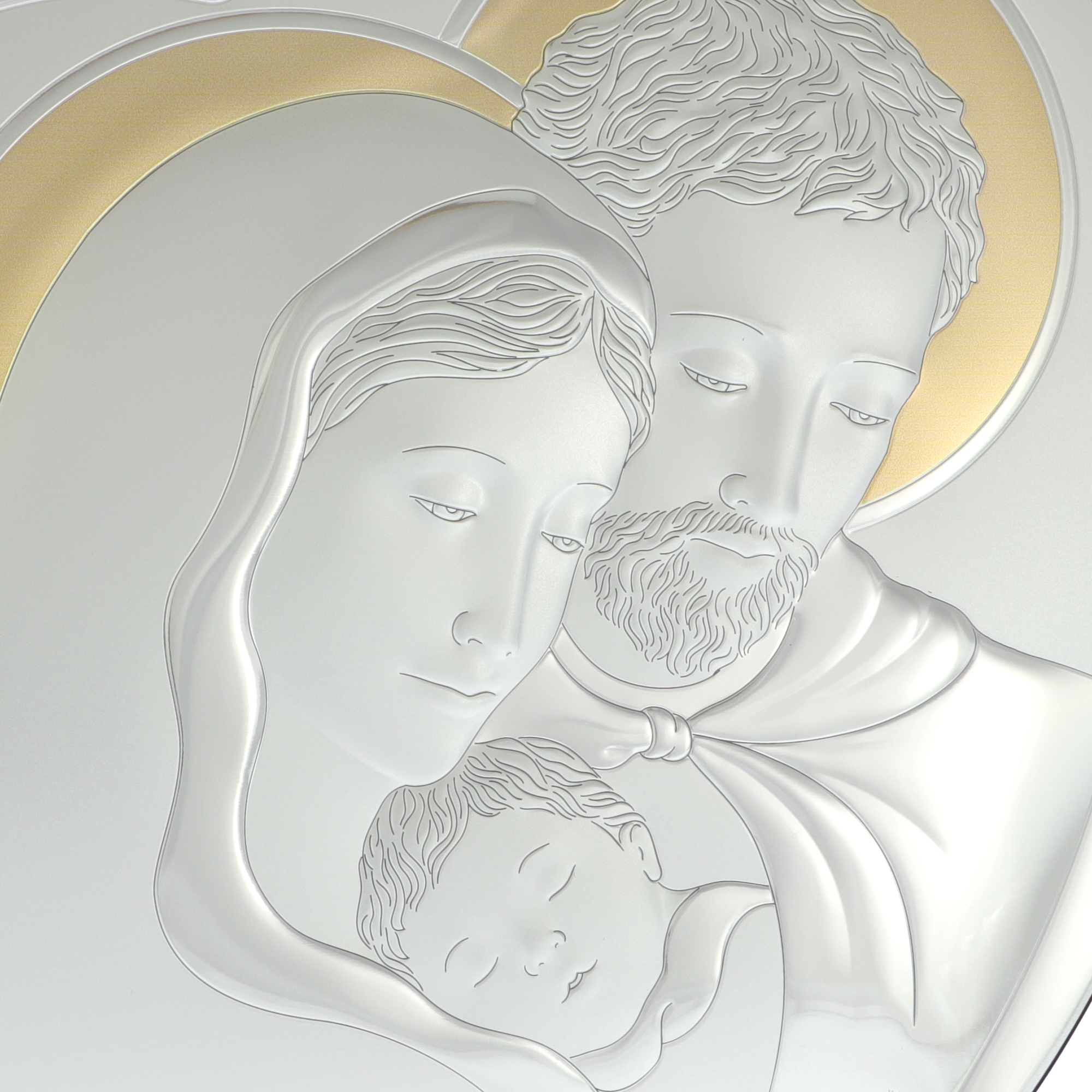 Ez a figyelemre méltó olaszországi, kézzel készített ikon, amely ezüstözött fémből készült és wengefával megerősített, lenyűgöz szépségével és finom részleteivel. Az ikon szív alakú, és a Szent Családot ábrázolja domborműben, isteni aurát sugározva, amely felerősíti ennek az ábrázolásnak a szent jellegét.