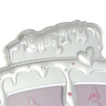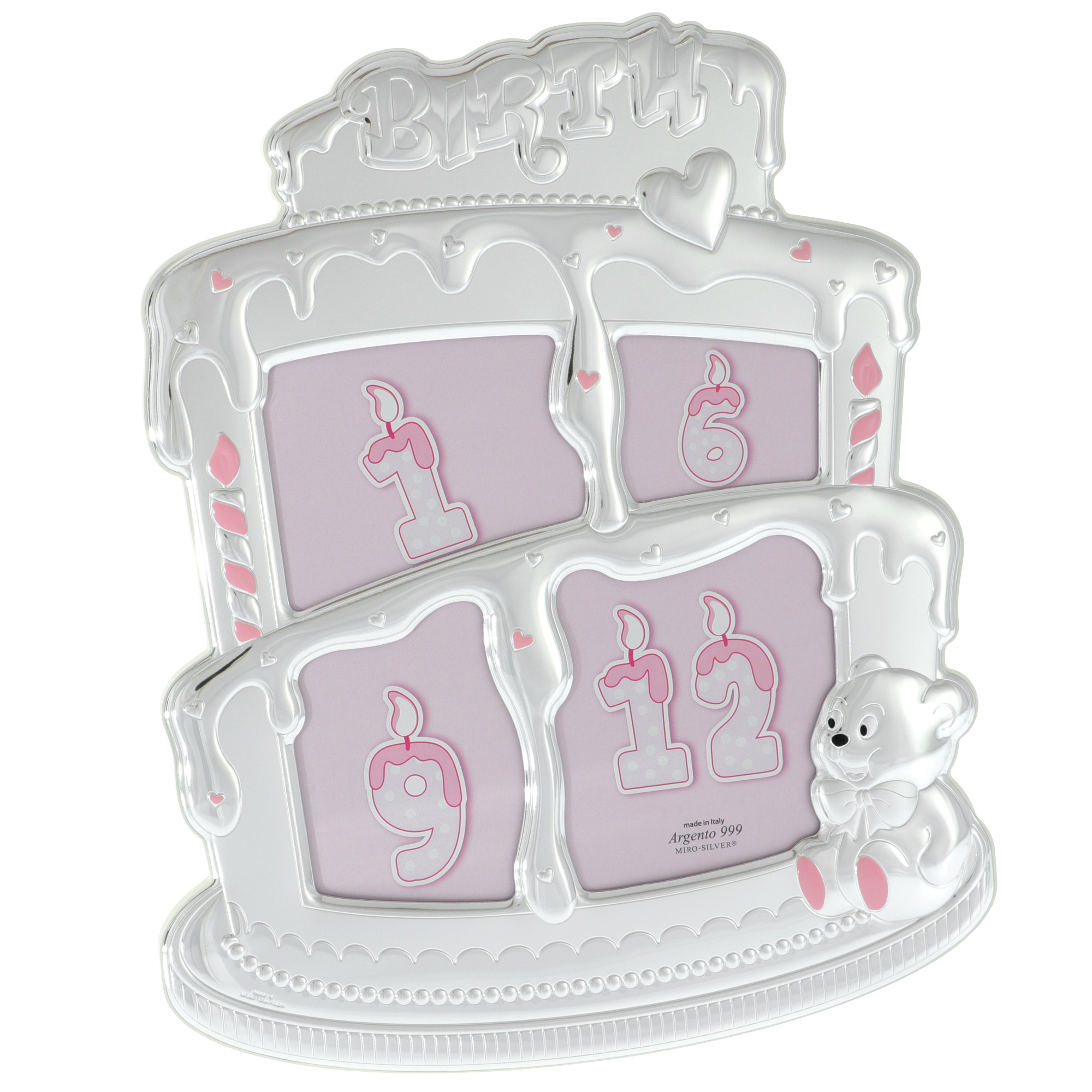Kiváló minőségű zenés képkeret, elegáns ajándék újszülöttnek, lánykeresztelőnek vagy születésnapnak. A tiszta ezüstözött fémből készült keret aprólékosan kidolgozott fa hátlappal rendelkezik. A képkeret torta alakú 3 szinten, gyertyákkal, szívecskékkel és mackóval díszítve. A felső része a "Birth" üzenetet hordozza, és ideális az első életév legsikeresebb fotóinak megtartására. A hátára egy zenei mechanizmus van beépítve, alá pedig egy különleges üzeneteddel gravírozott lemez helyezhető el. Az Olaszországban gyártott keret elegáns díszdobozban van elhelyezve. Méretek - 24x30 cm.