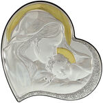 Icoana argintata inima Fecioara Maria, cu o dimensiune de 16x18 cm. Icoana este placata cu argint pur si poate fi agatata pe perete sau asezata pe noptiera cu ajutorul piciorului de sustinere. Spatele este intarit cu lemn. Este asezata in cutie de cadou. Personalizarea se face prin aplicarea unei placute gravate pe spatel ei.
