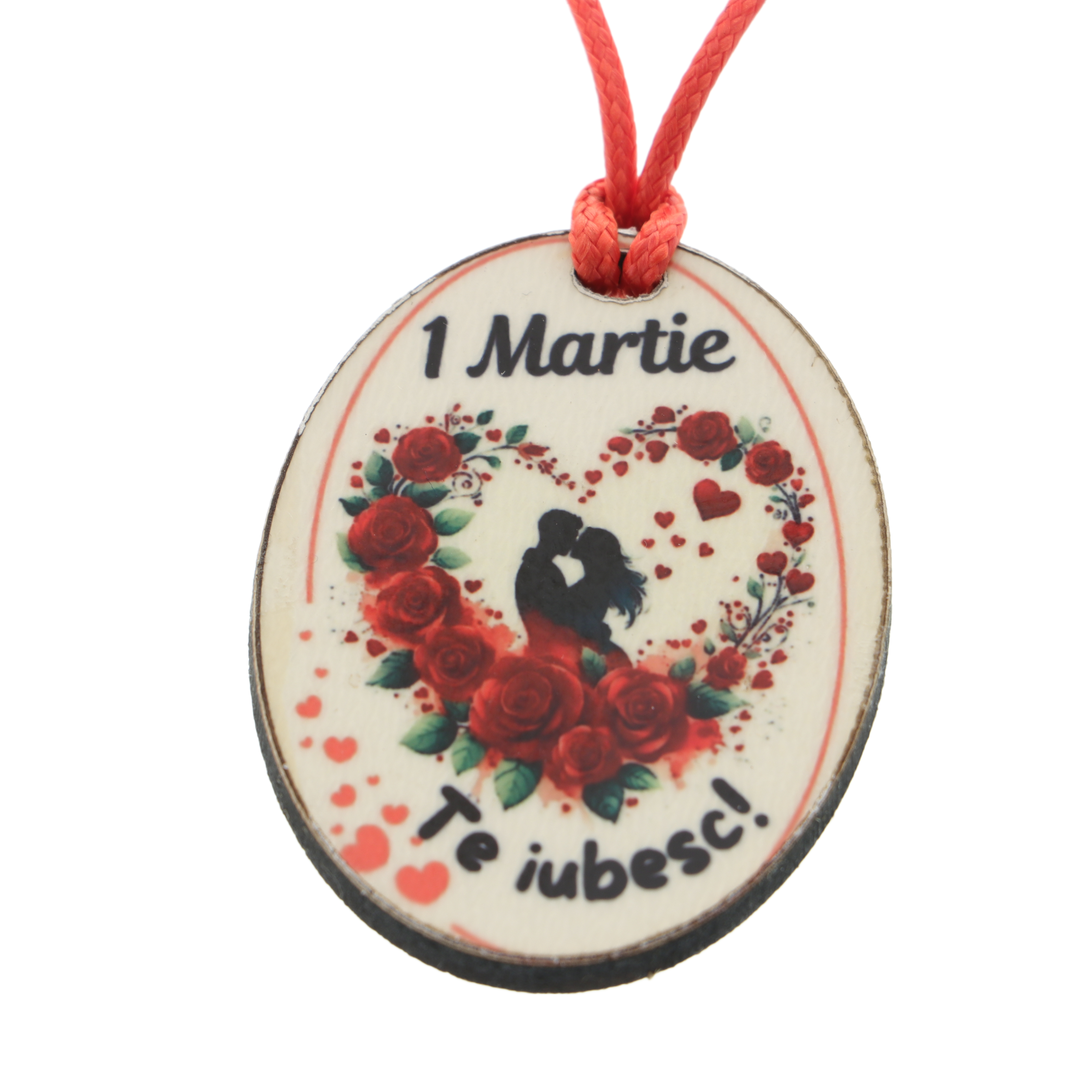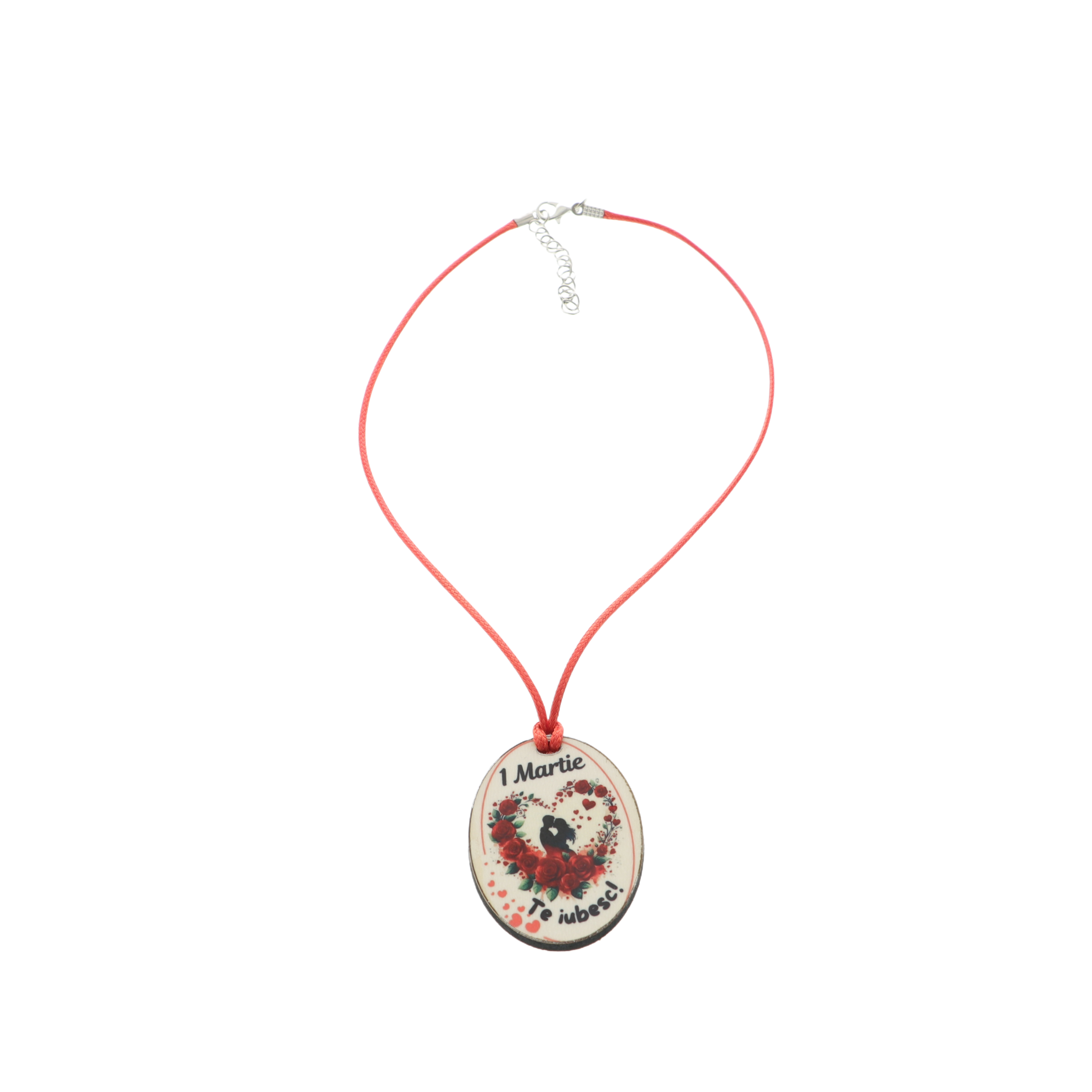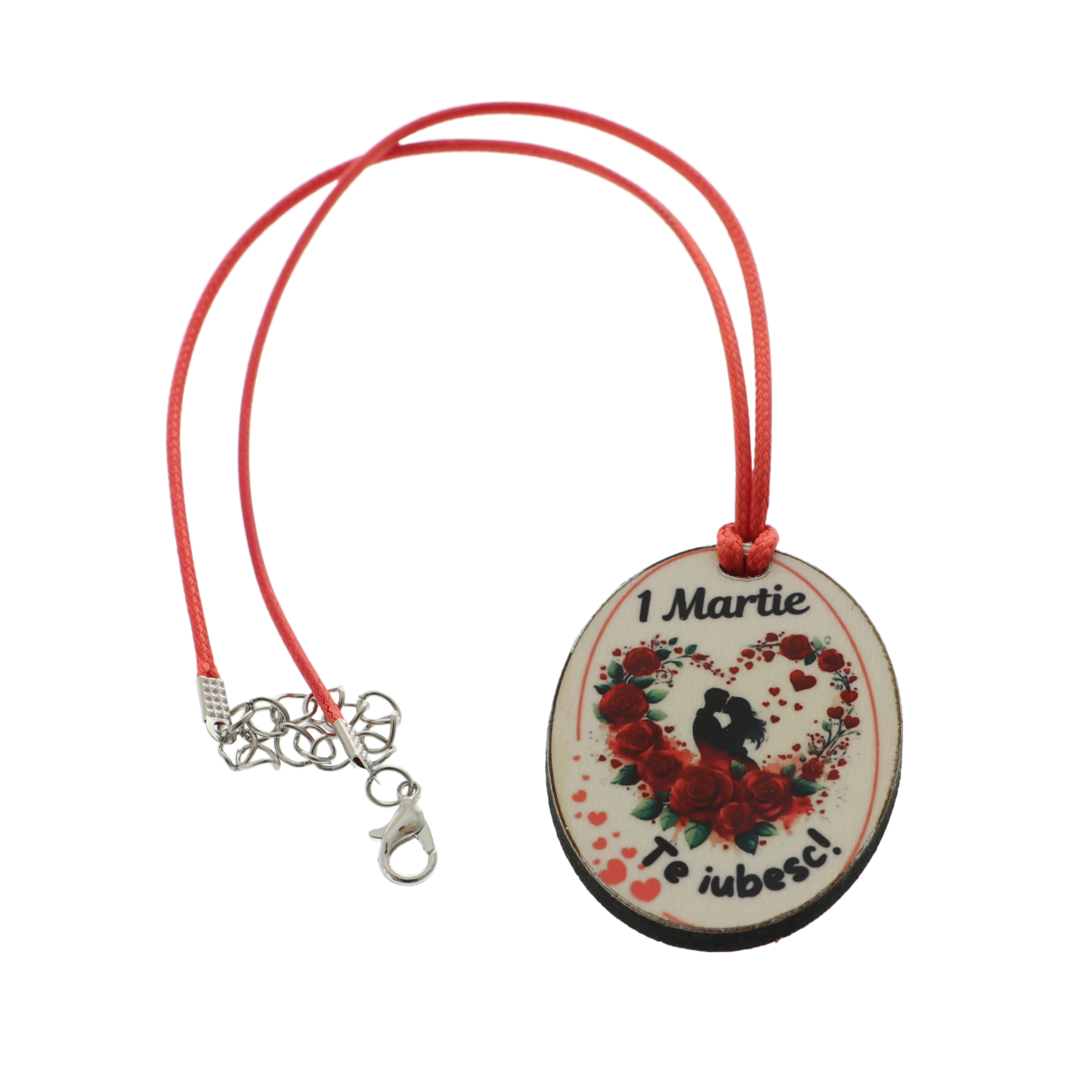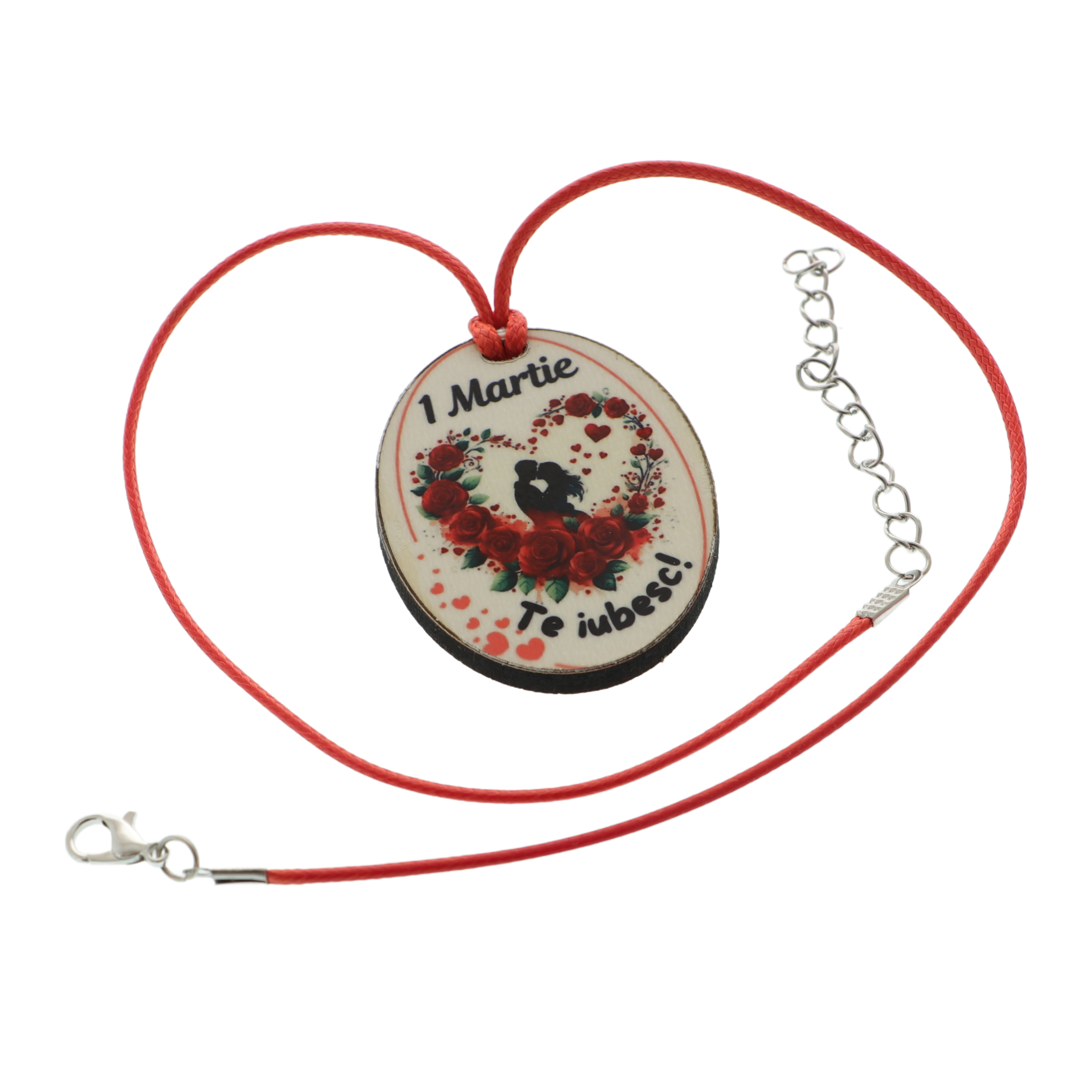 Colierul este realizat dintr-un șnur textil cu lungime ajustabilă, confortabil și ușor de purtat, și este accesorizat cu un pandantiv din lemn personalizat, cu dimensiunea de 3,5 × 5 cm. Pandantivul ilustrează un cuplu sărutându-se într-un chenar în formă de inimă, decorat cu trandafiri roșii. Deasupra imaginii este inscripționat mesajul „1 Martie”, iar sub imagine mesajul „Te iubesc”, transformând colierul într-un cadou plin de semnificație.