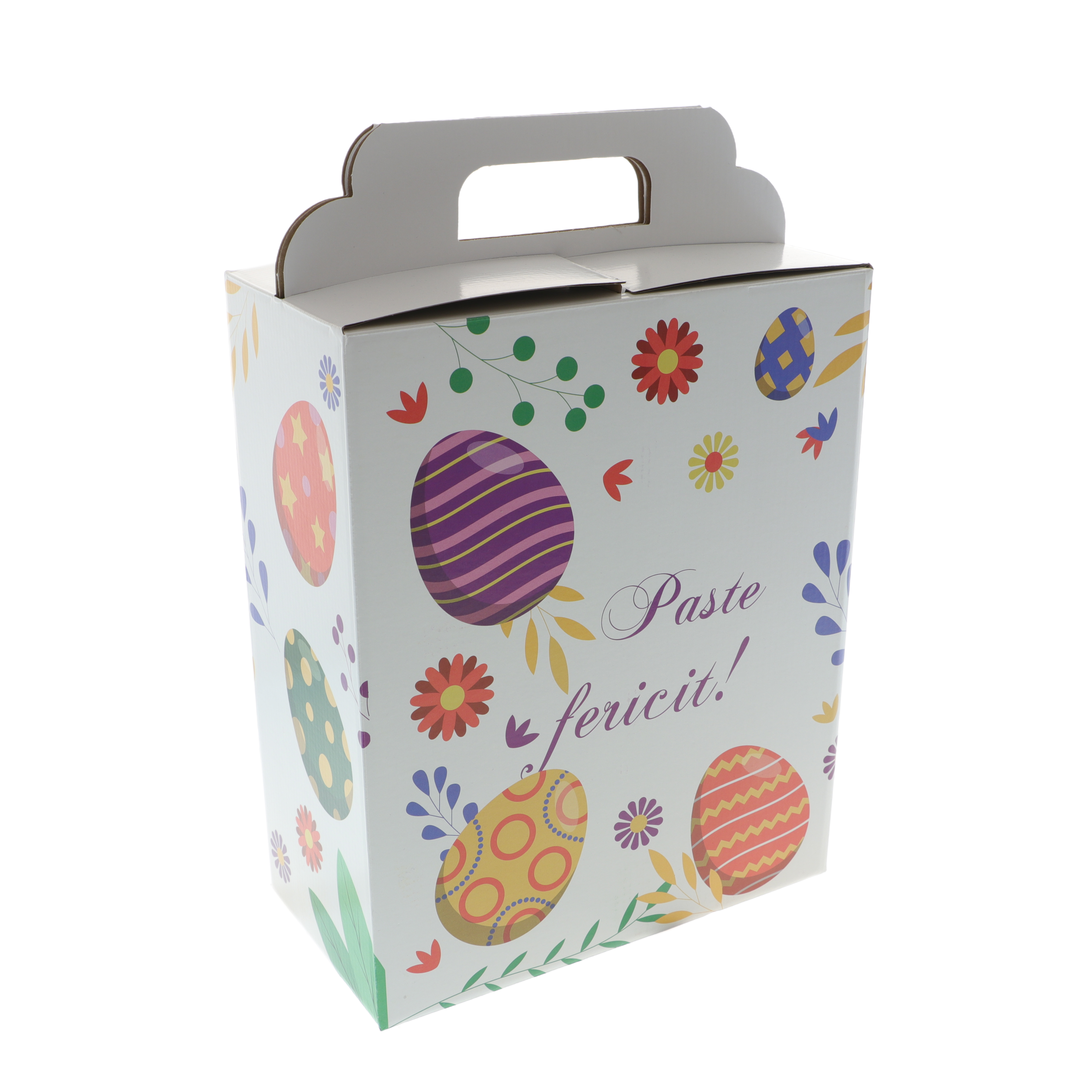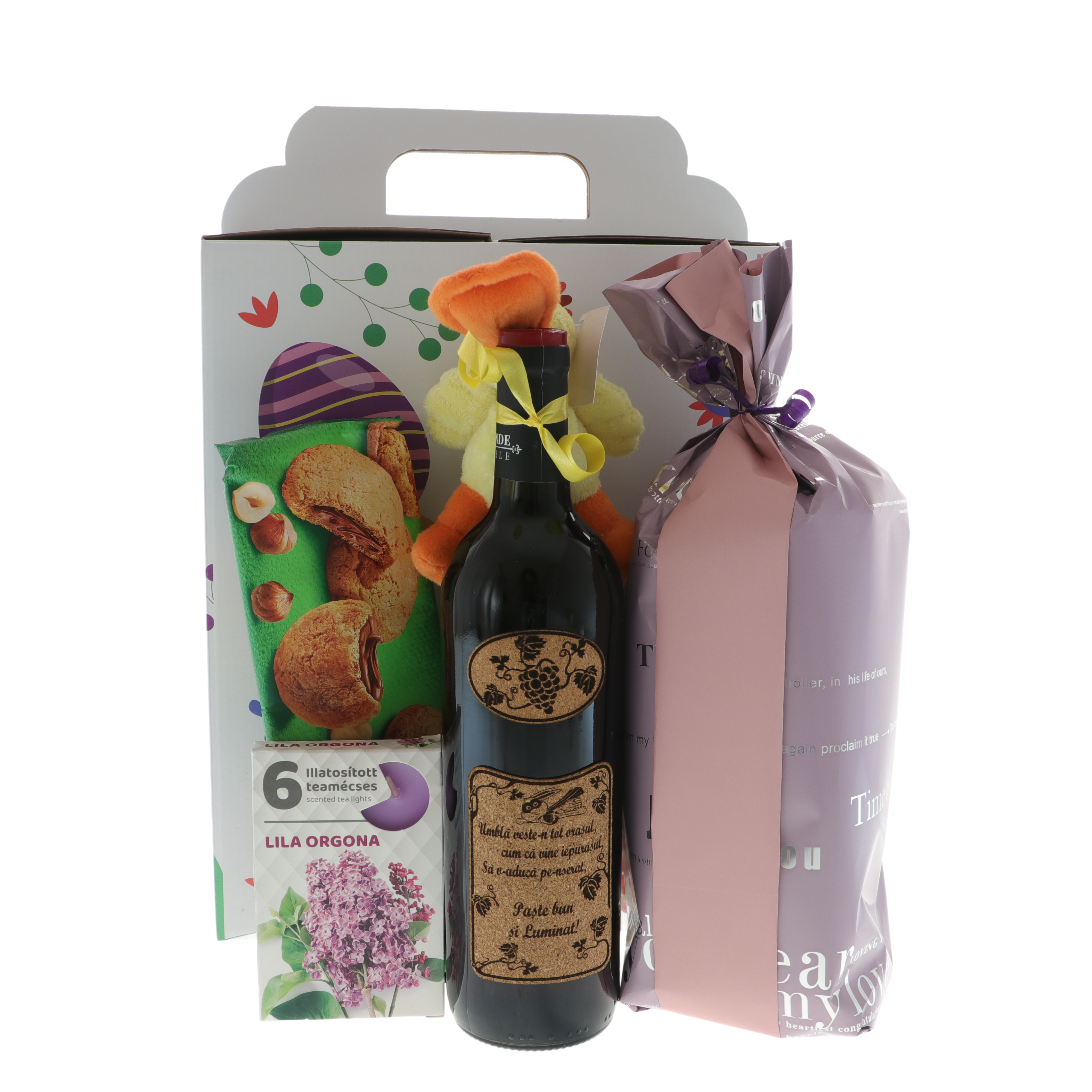 Toate produsele sunt așezate într-o cutie specială de cadou, decorată cu mesajul „Paște fericit!”, oferind un aspect festiv și elegant. Dimensiuni cutie L 26 cm, l 13,5cm, H 39cm.