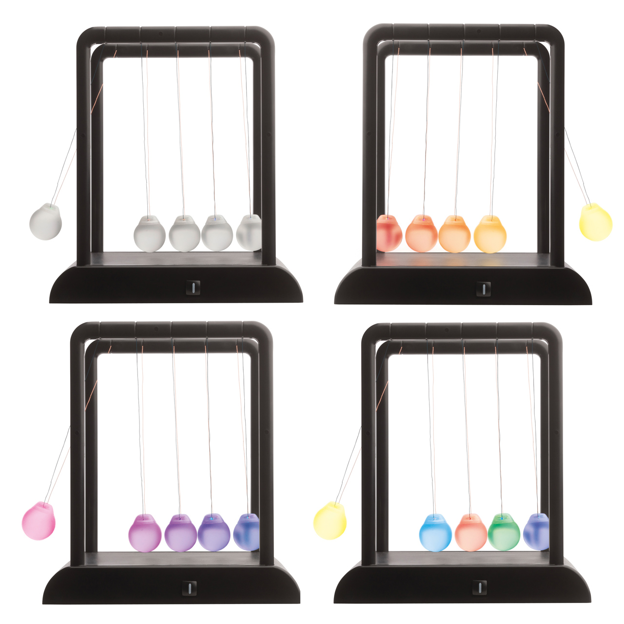Perpetuum mobile luminat, realizat din sticla si plastic. Jocul de lumini se porneste prin apasarea unui buton aflat pe lateralul suportului. Dupa ce este pornita, incepe prin culori in degrade, dupa care incep sa se luminze in culori intermitente. Timpul de miscare al bilelor este de cca 15-20 secunde. Baza suportului poate fi personalizat prin aplicarea unei placute gravate cu mesaj. Dimensiuni: 155 x 180 x 198 mm